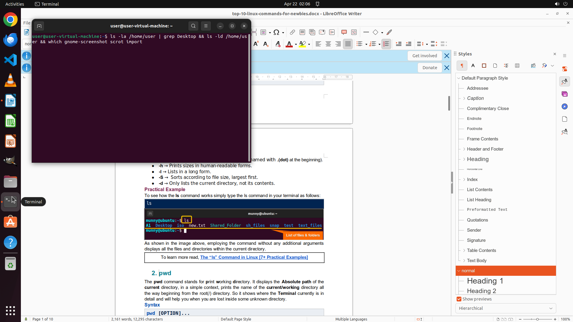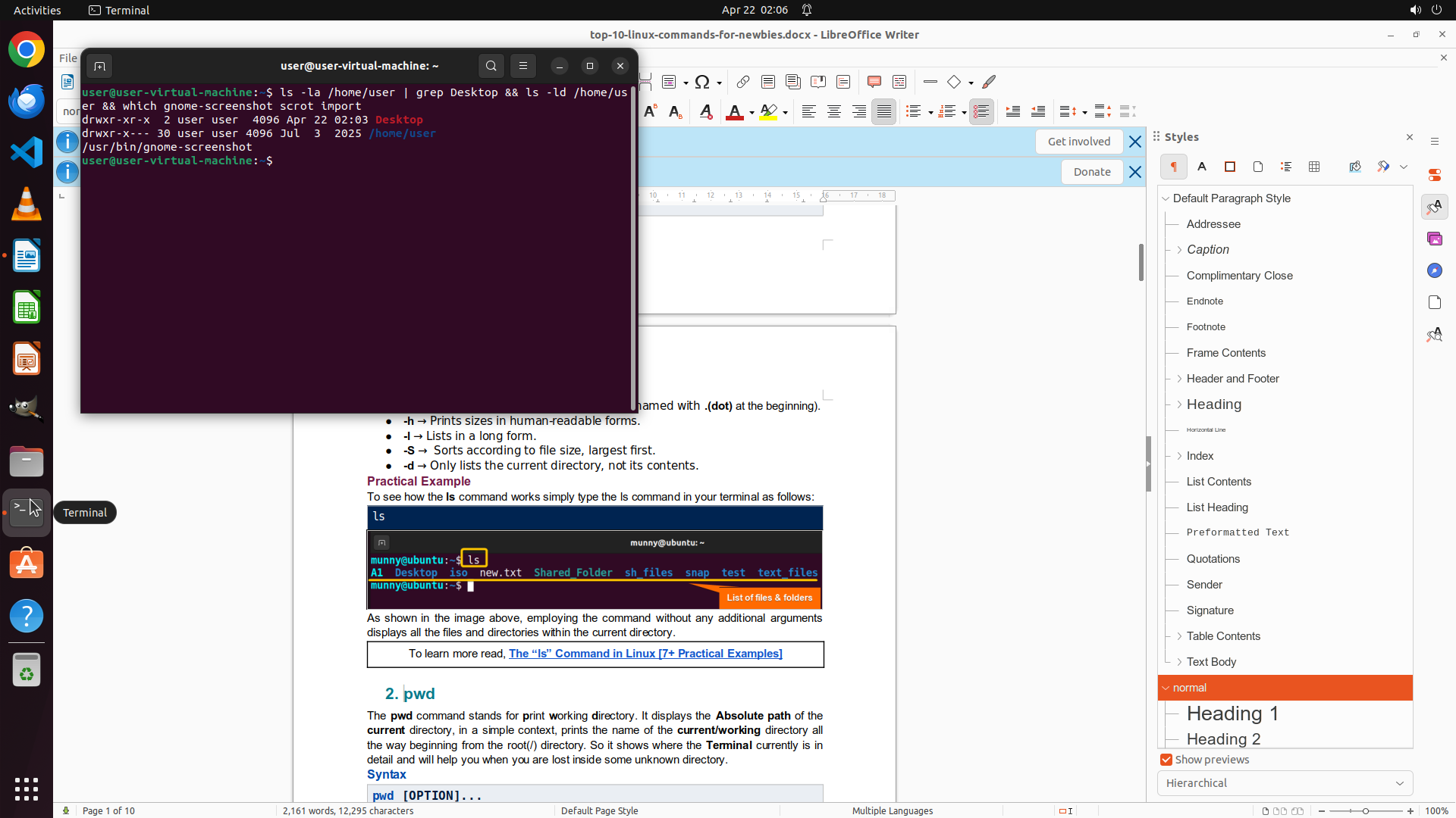 2. **LibreOffice Writer**: 在后台可见,显示 Linux 命令教程文档,包含关于 `ls` 和 `pwd` 命令的内容。