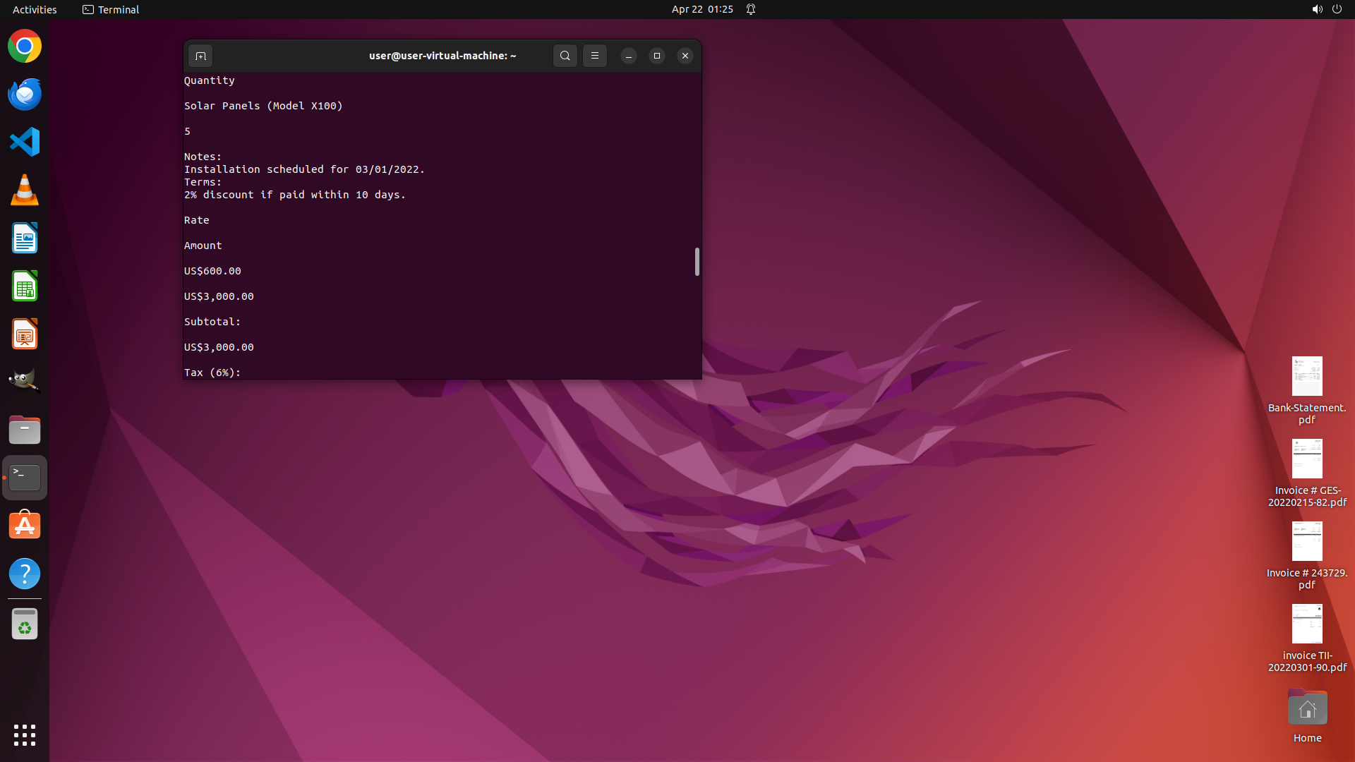 终端显示了 Green Energy Solutions 发票的详细信息,我看到: