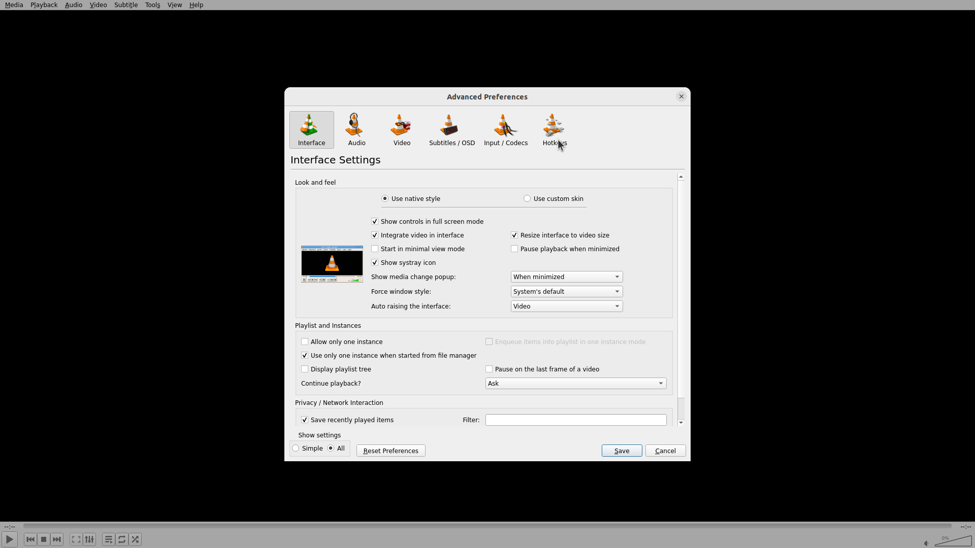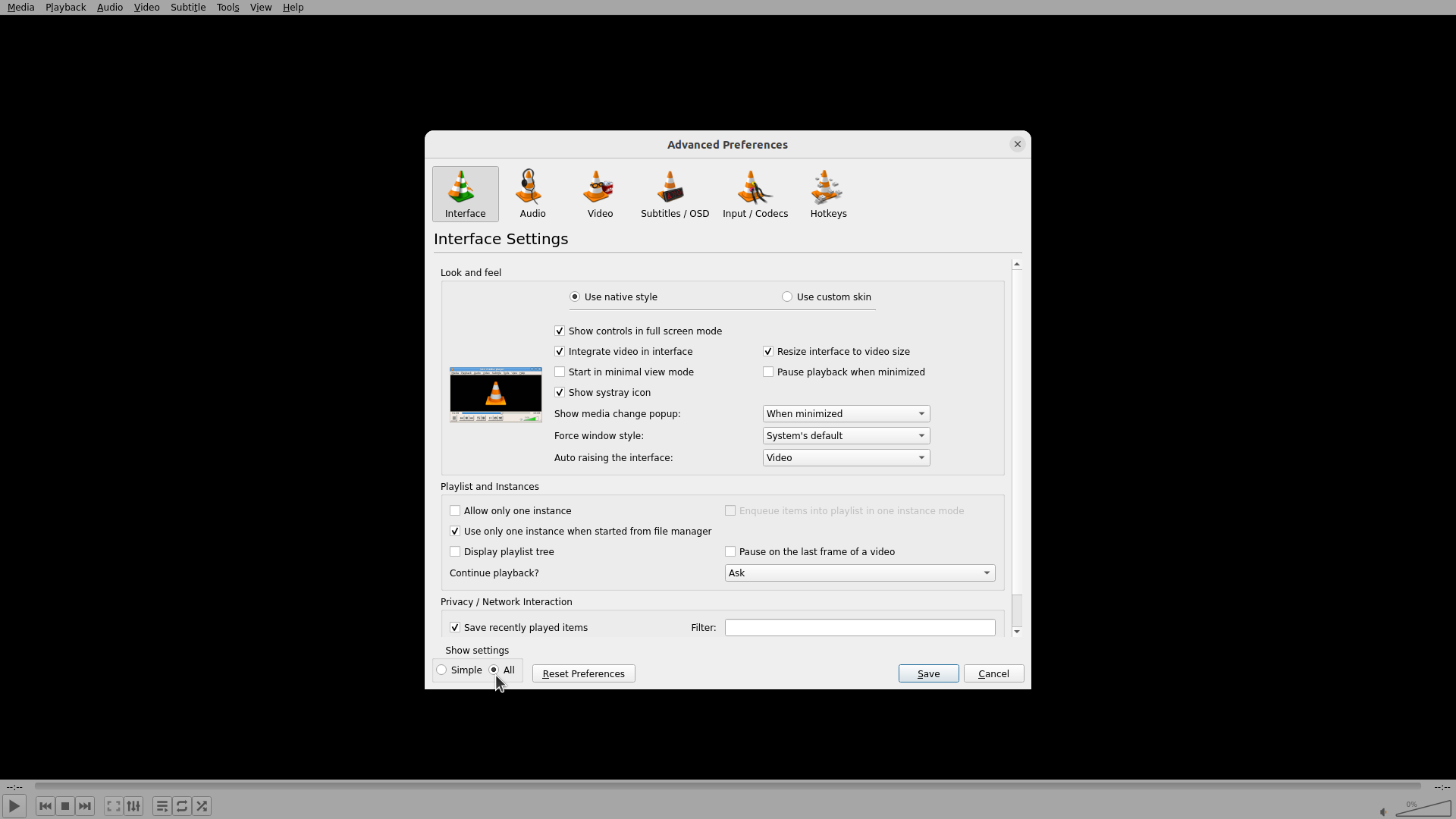 VLC Preferences窗口已重新打开,当前处于"Simple Preferences"(简单偏好设置)模式。窗口底部左侧显示"Simple"单选按钮被选中,旁边有"All"选项。顶部有多个图标标签,当前显示的是Interface Settings界面。