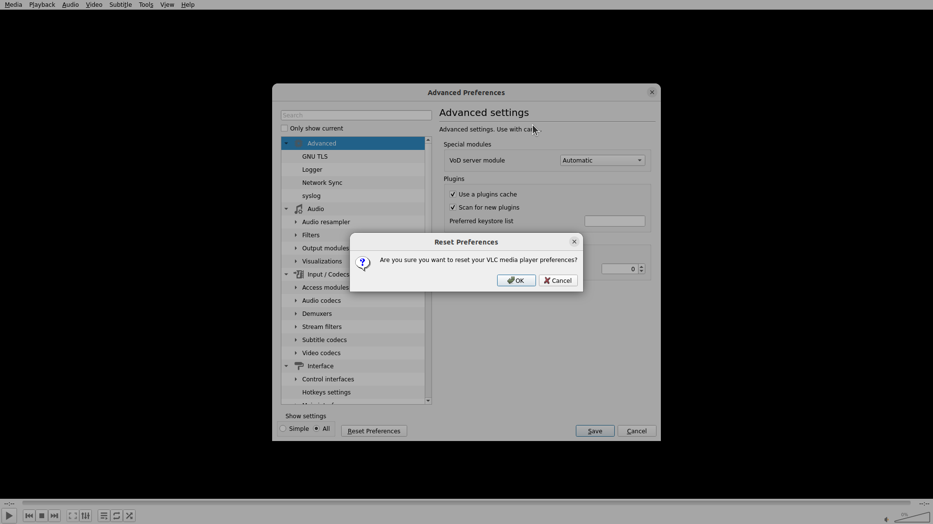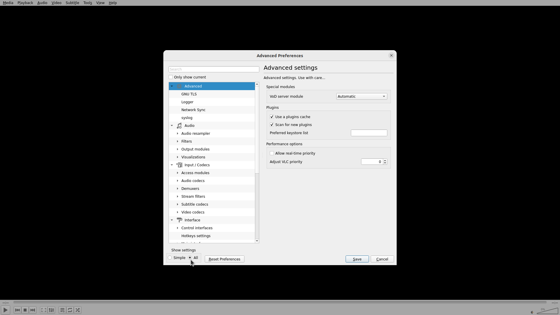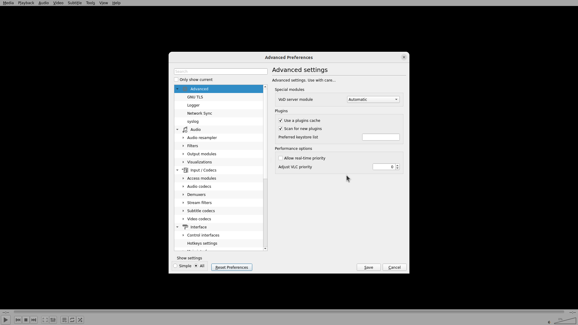 VLC Advanced Preferences窗口已成功重新打开,当前处于"Advanced settings"界面。可以看到:
