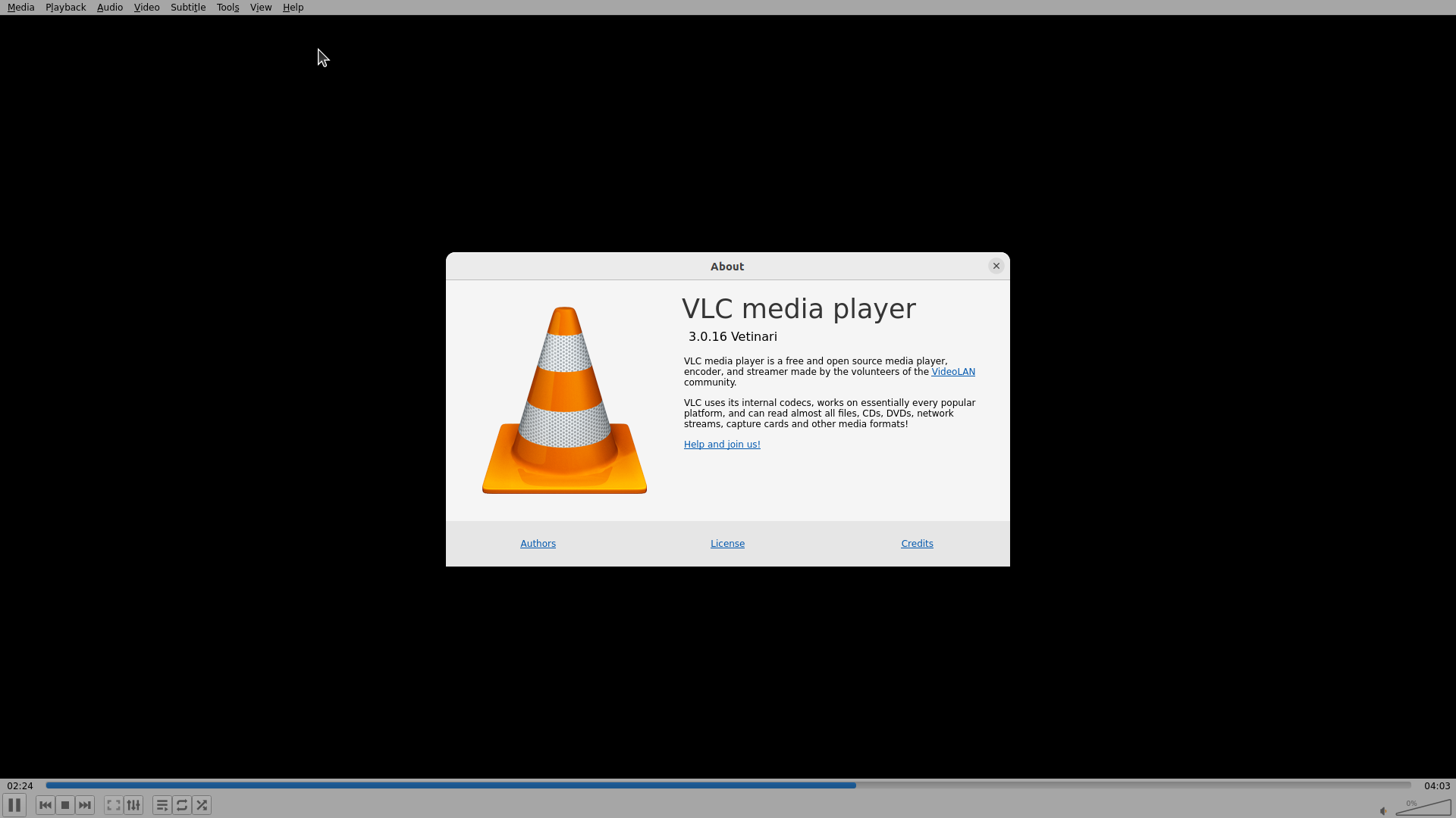 1. VLC media player 的 About 对话框已关闭,回到了主窗口