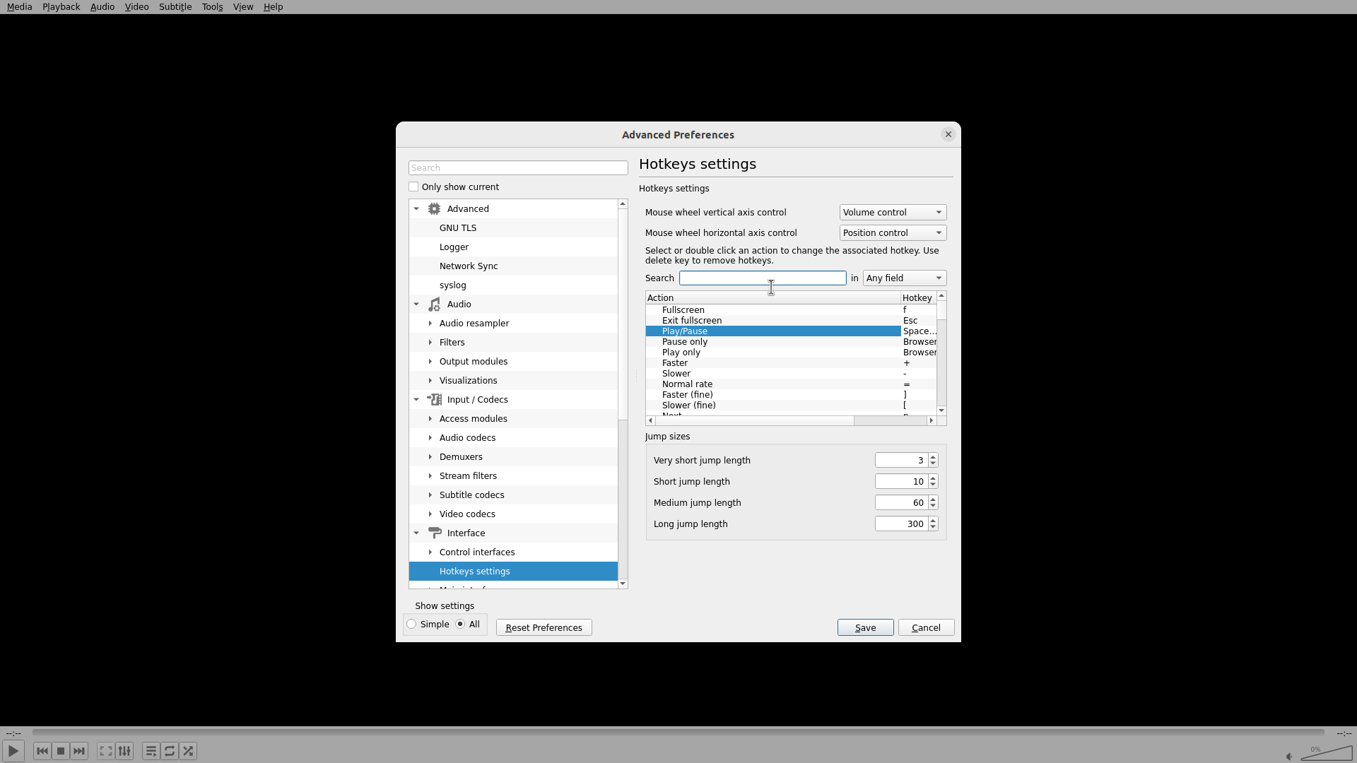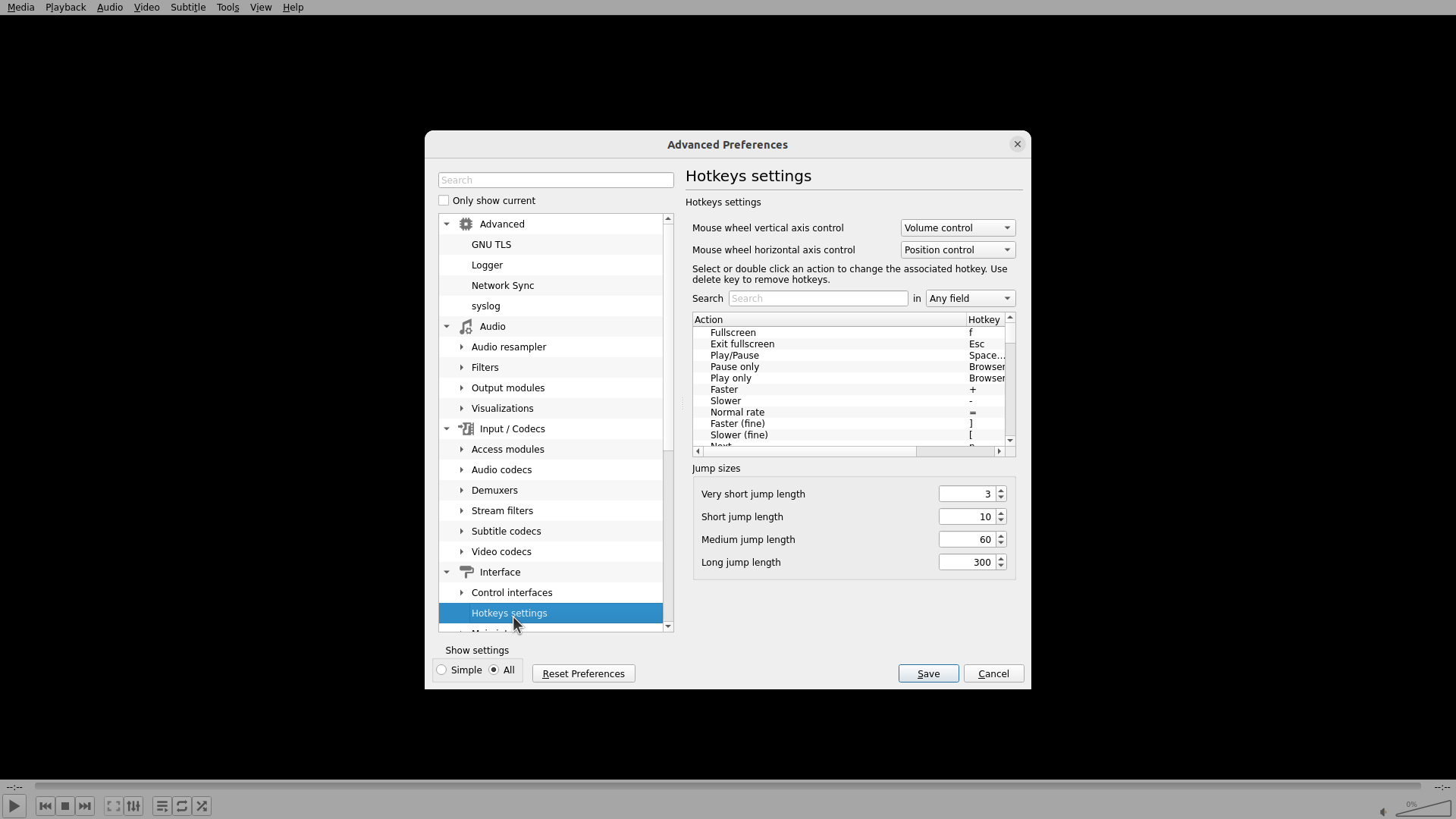 3. 查看 VLC 的热键设置(通过 Tools > Preferences > Hotkeys)