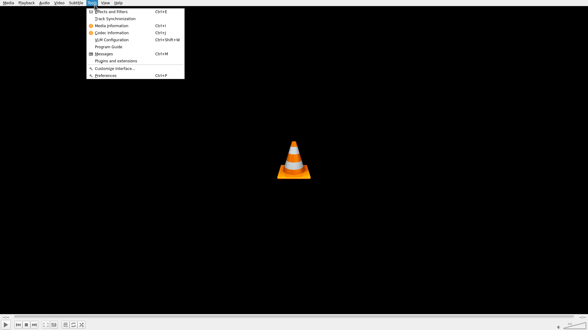 当前显示VLC主窗口,Tools菜单已经展开。可以看到菜单中有一个"Preferences"选项(底部,带有Ctrl+P快捷键)。这是重新打开Preferences窗口的入口。