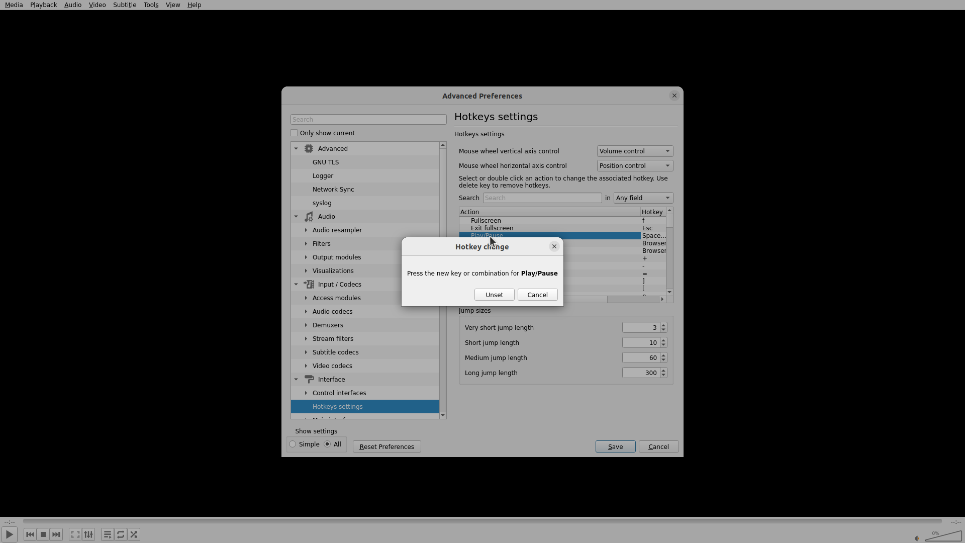 当前弹出了一个"Hotkey change"对话框,提示"Press the new key or combination for Play/Pause"。这个对话框有两个按钮:"Unset"和"Cancel"。