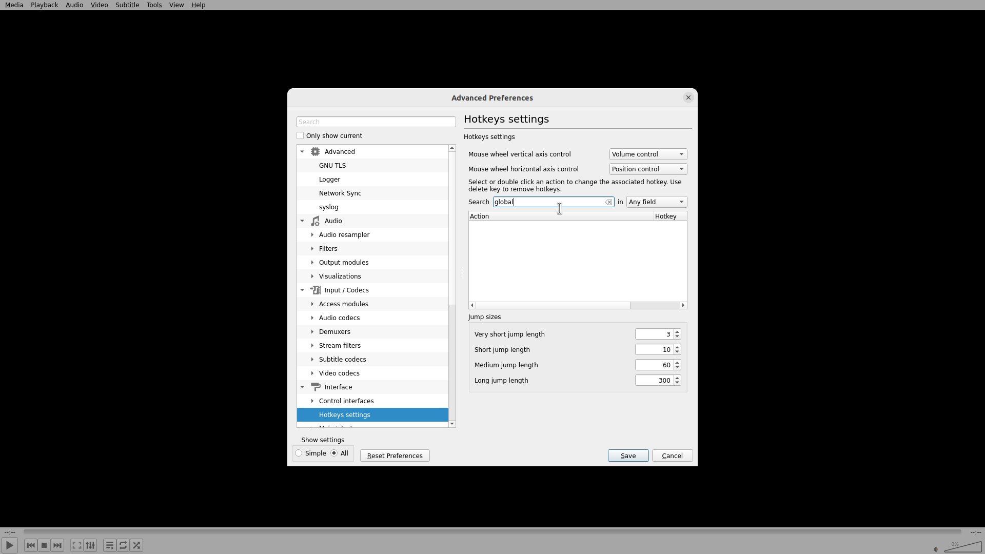 当前显示VLC Advanced Preferences的"Hotkeys settings"界面: