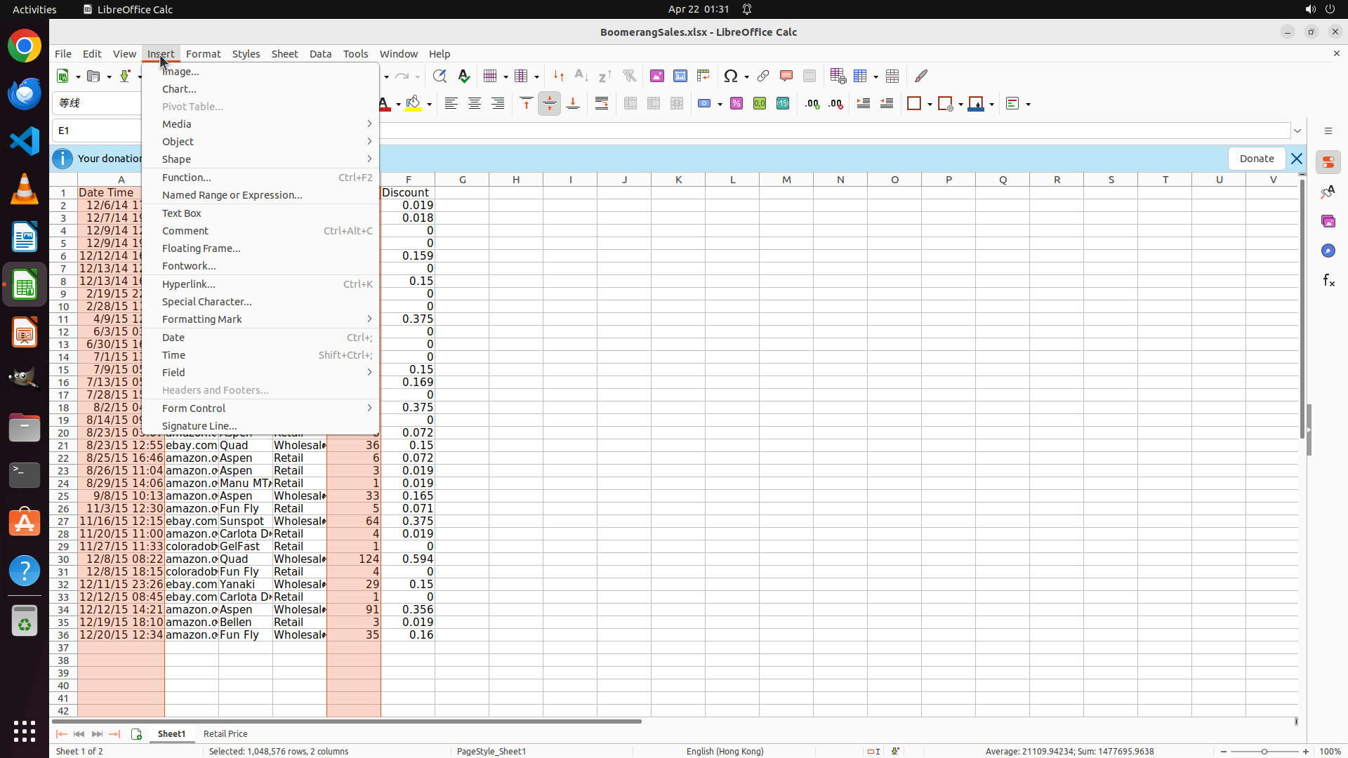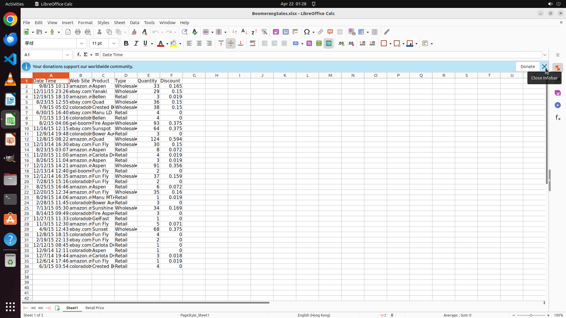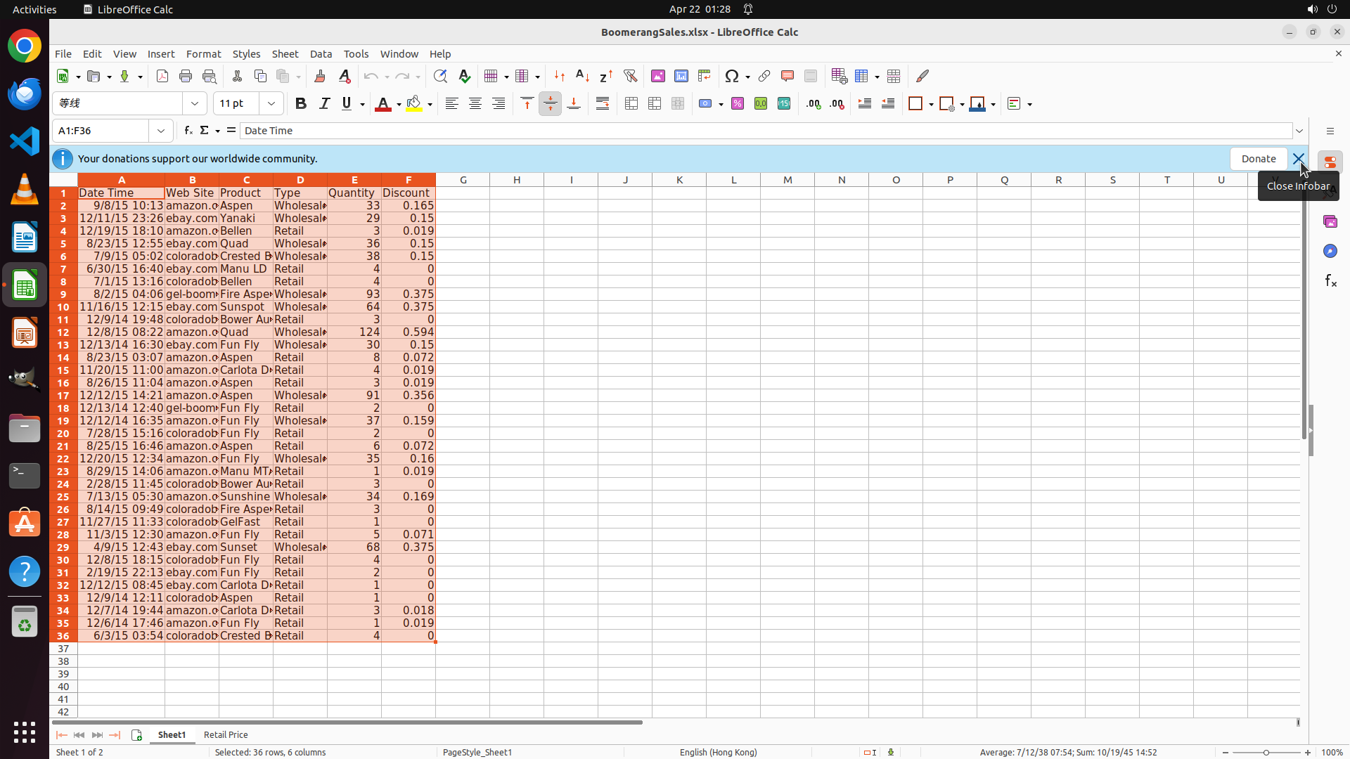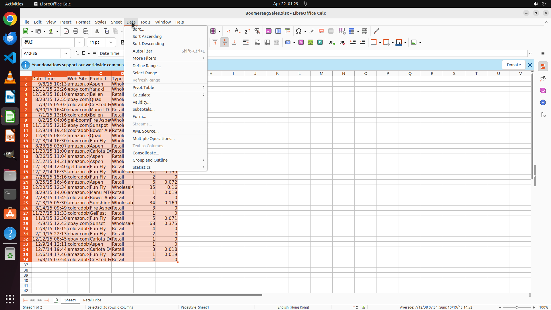 - LibreOffice Calc is open with a spreadsheet "BoomerangSales.xlsx"