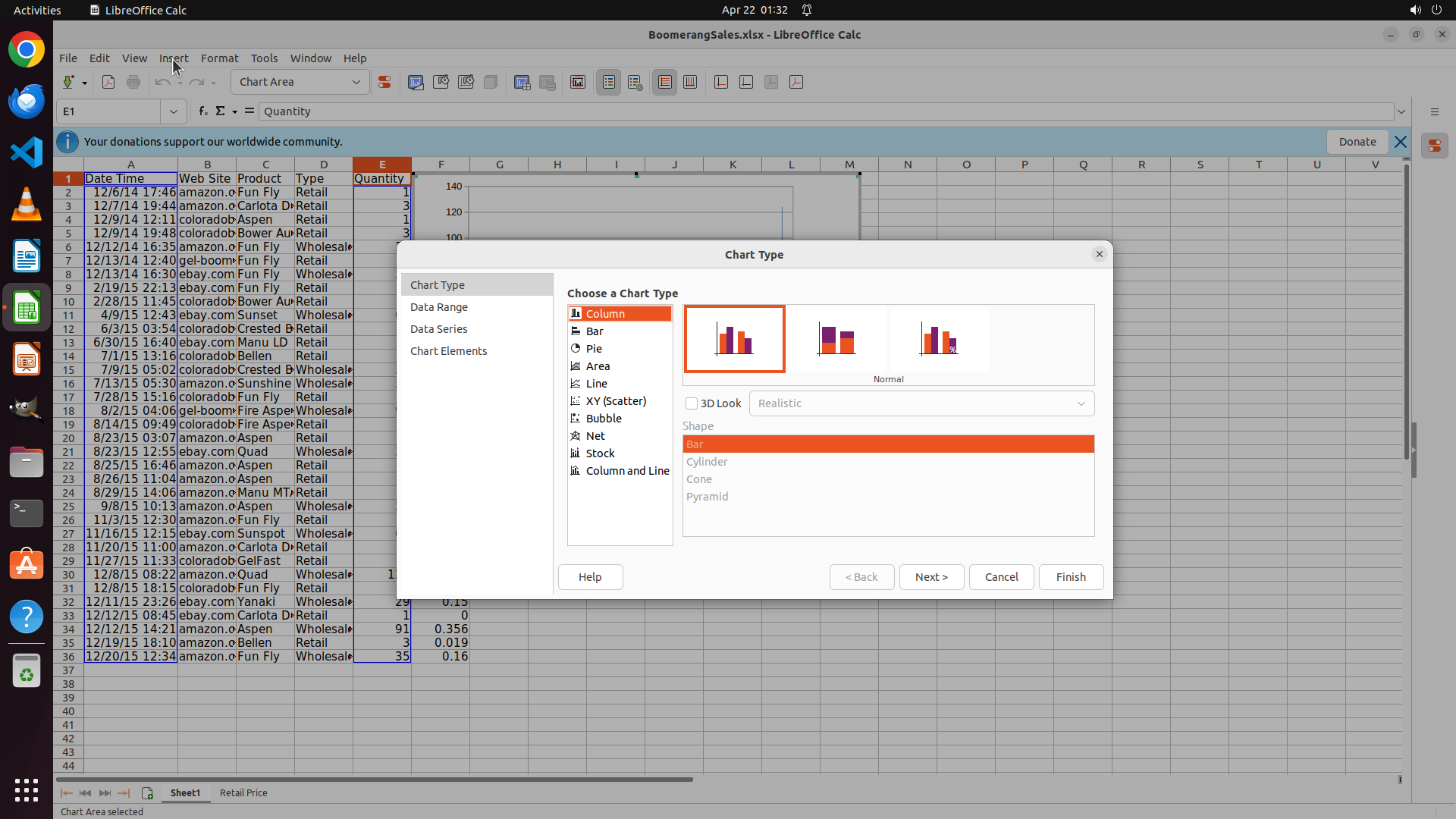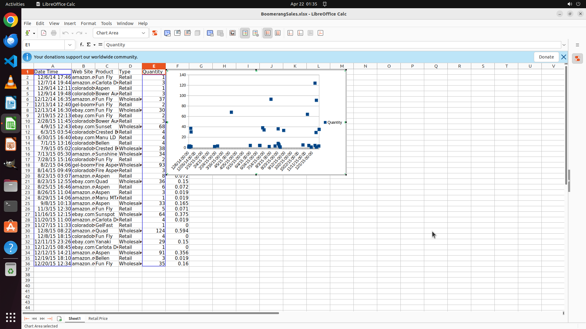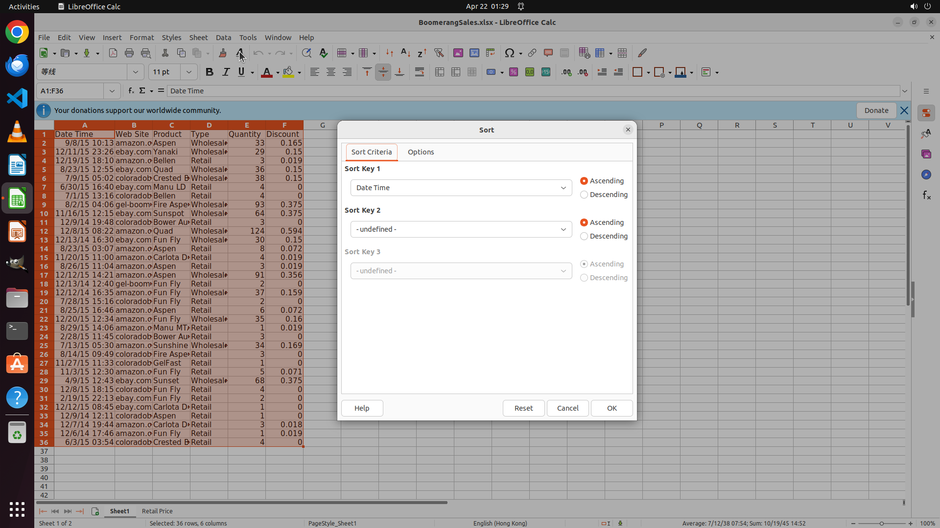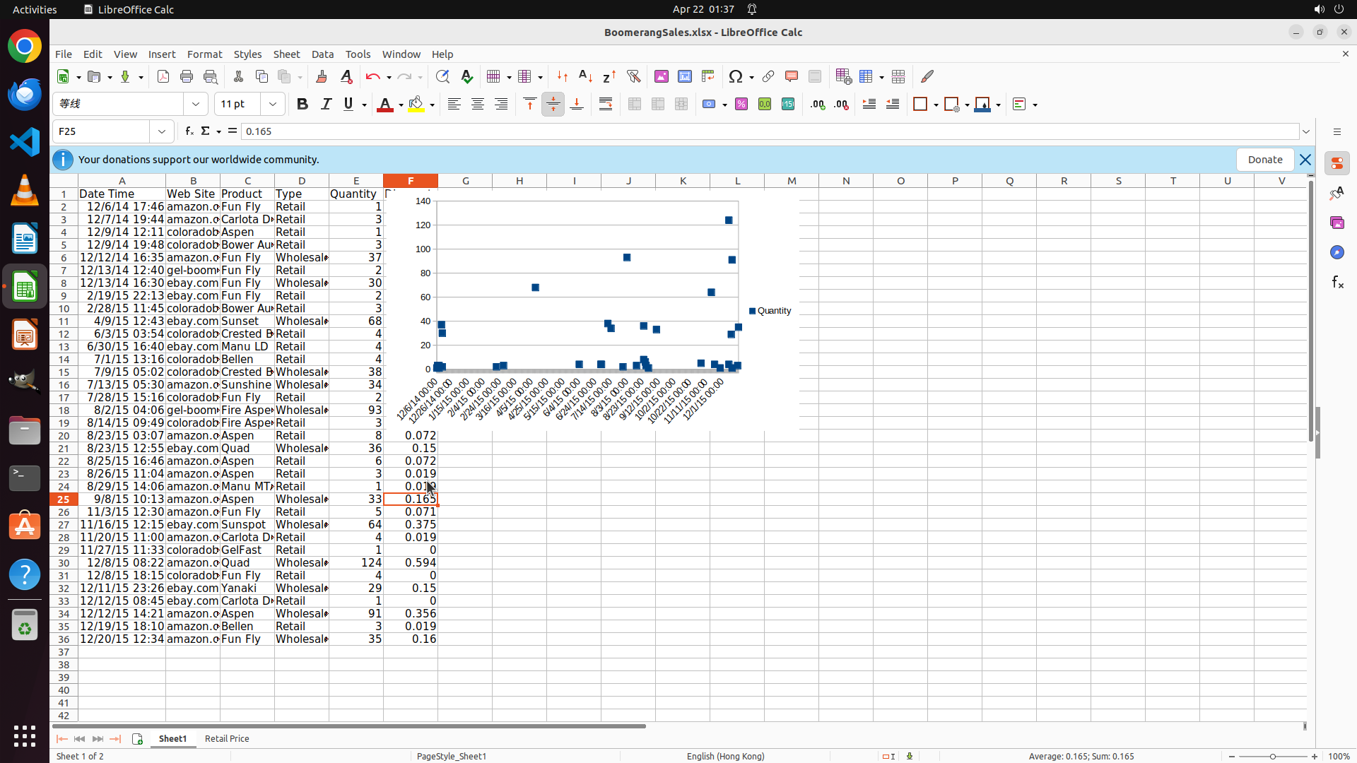 - LibreOffice Calc is open with a spreadsheet "BoomerangSales.xlsx"