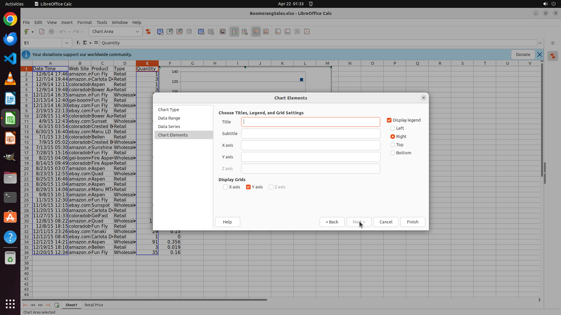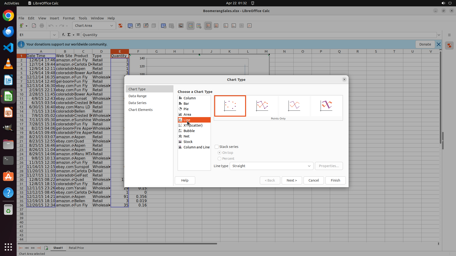 I should now click "Finish" to complete the chart wizard and insert the line chart into the spreadsheet. This will fulfill the second part of the task requirement: creating a line chart with Date Time on X-axis and Quantity on Y-axis.