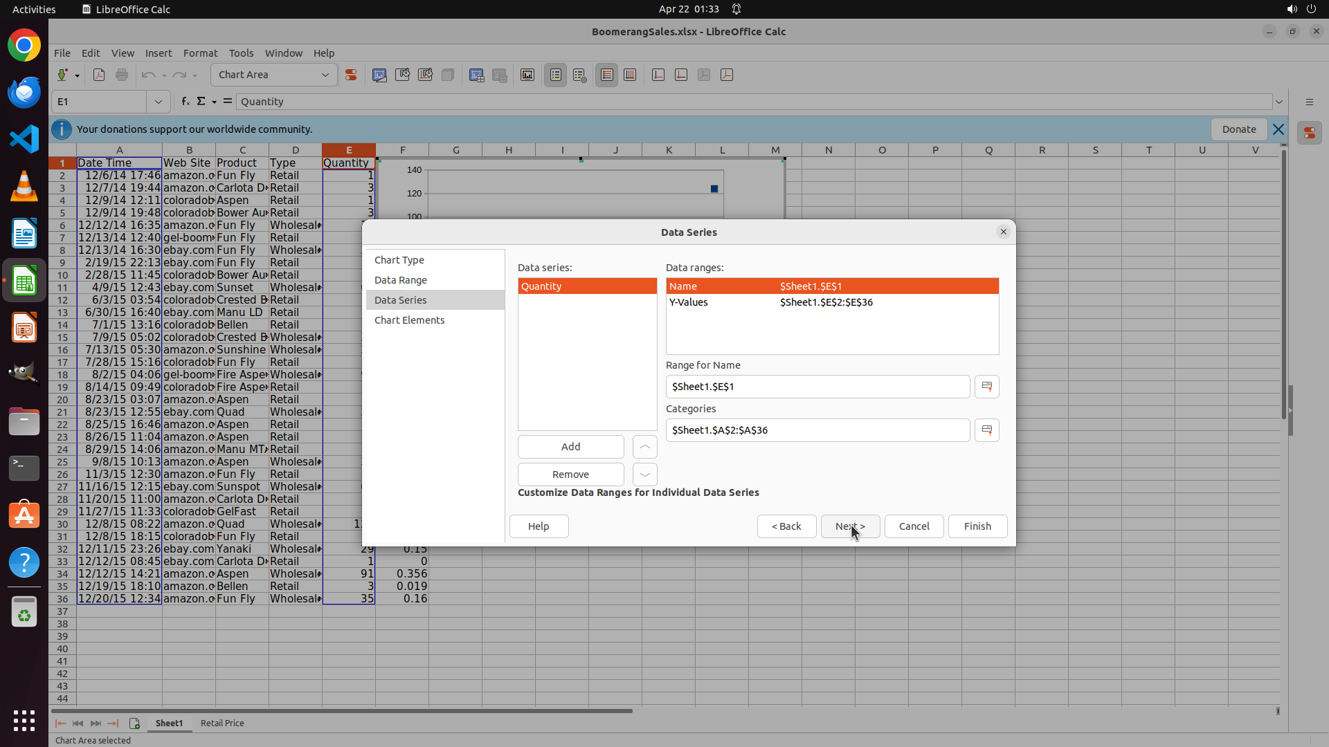 - The data range shows "$Sheet1.$A$1:$A$36,$Sheet1.$E$1:$E$36" which correctly includes both Date Time (Column A) and Quantity (Column E)