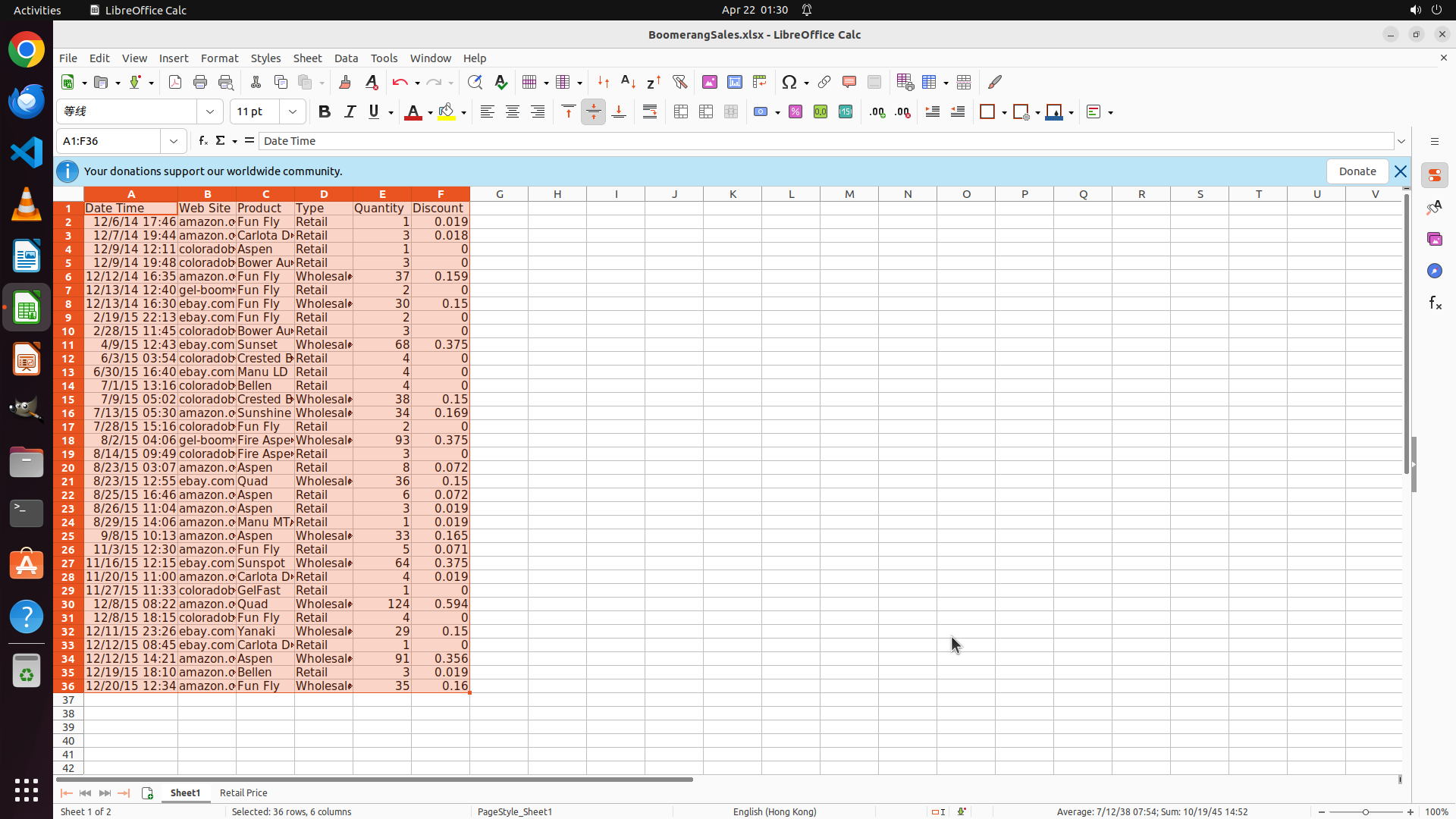 - LibreOffice Calc is open with the spreadsheet "BoomerangSales.xlsx"