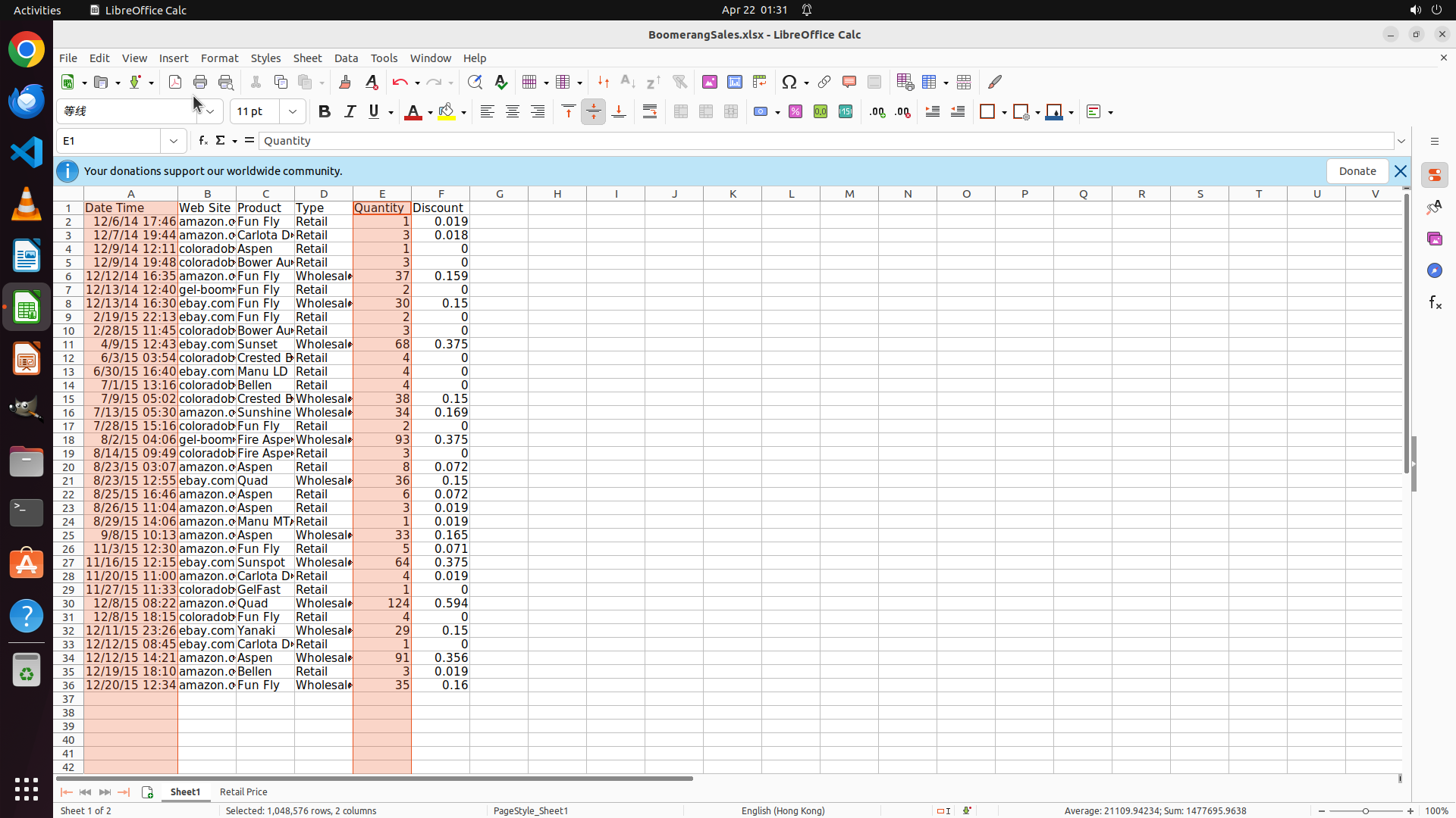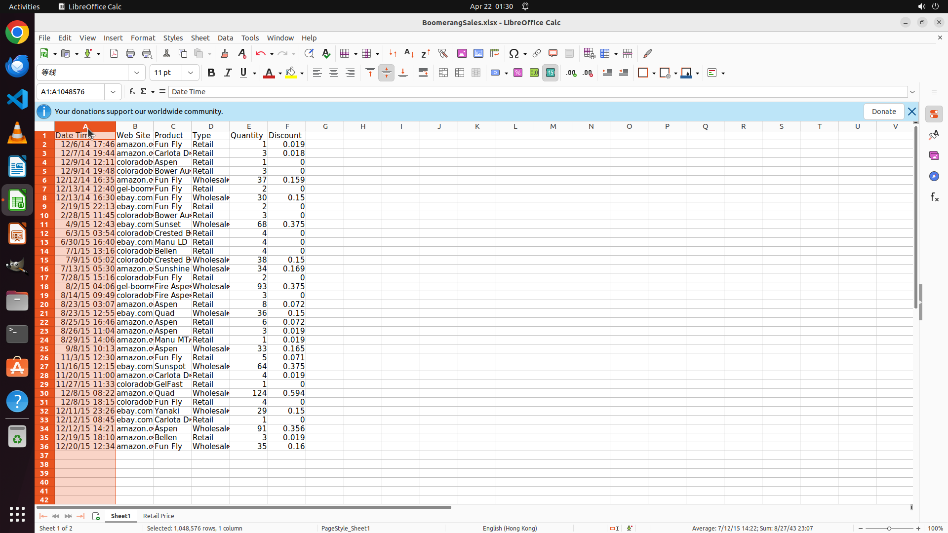 - Columns are: A=Date Time, B=Web Site, C=Product, D=Type, E=Quantity, F=Discount