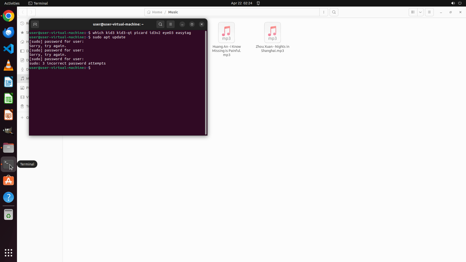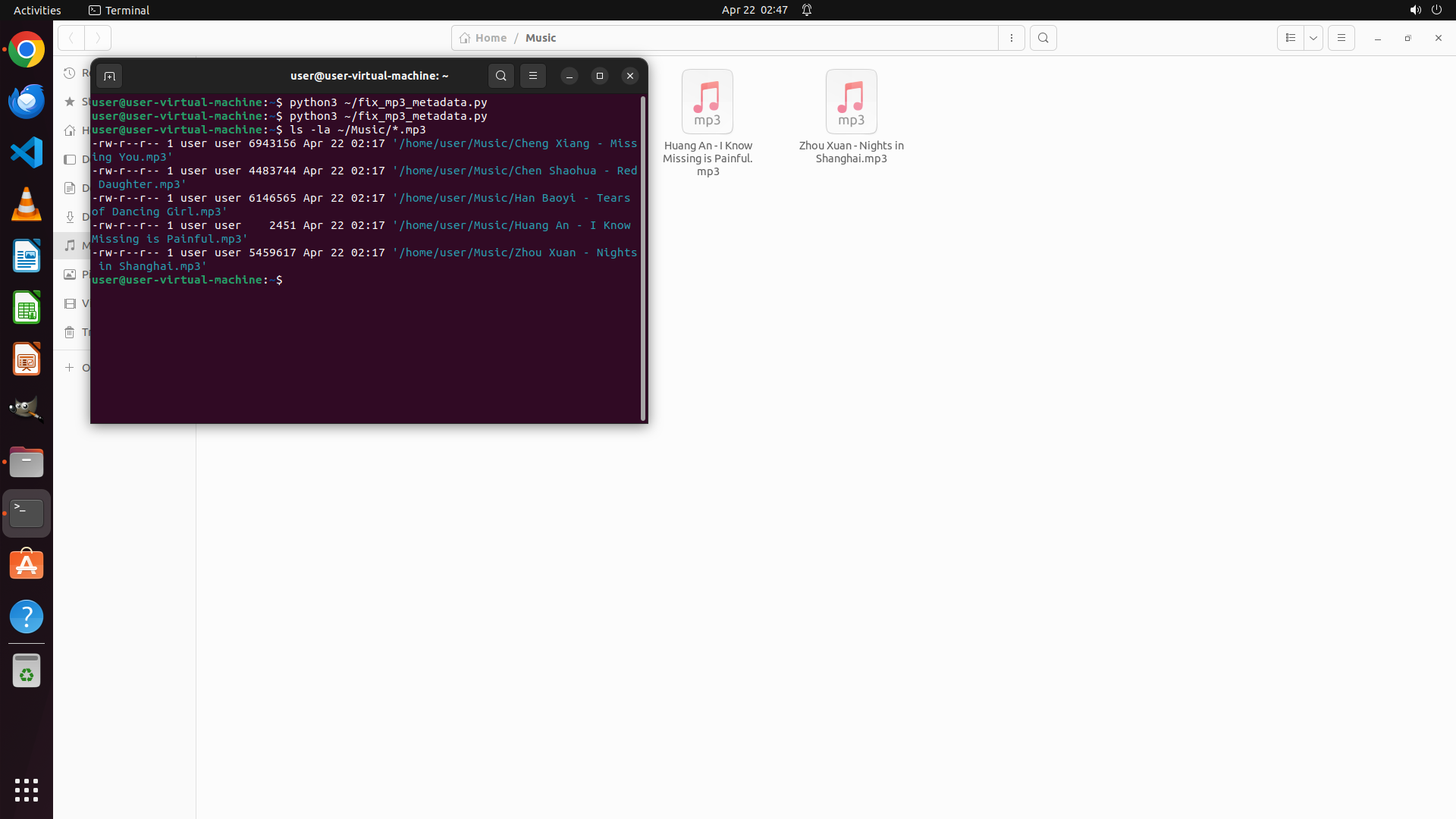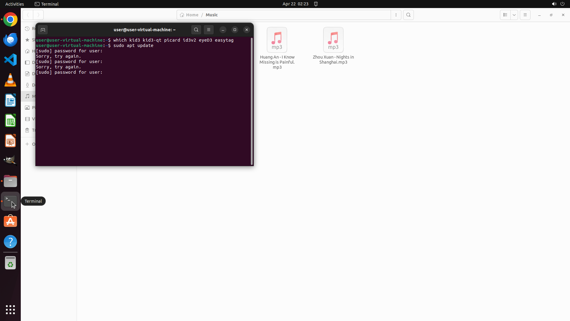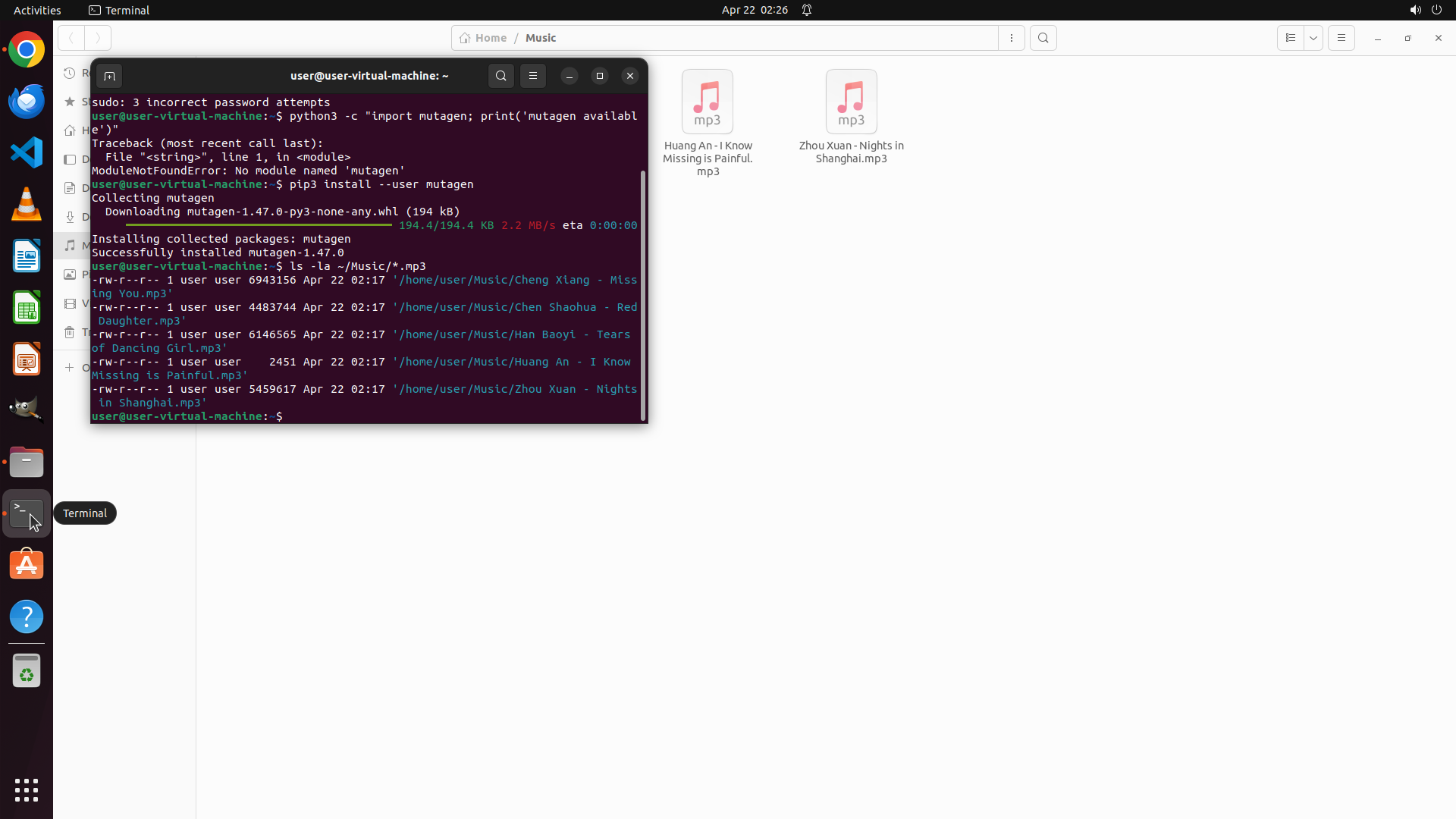 终端已成功打开,显示命令提示符 "user@user-virtual-machine: $"。文件管理器在后台显示 Music 文件夹,包含两个可见的 MP3 文件: