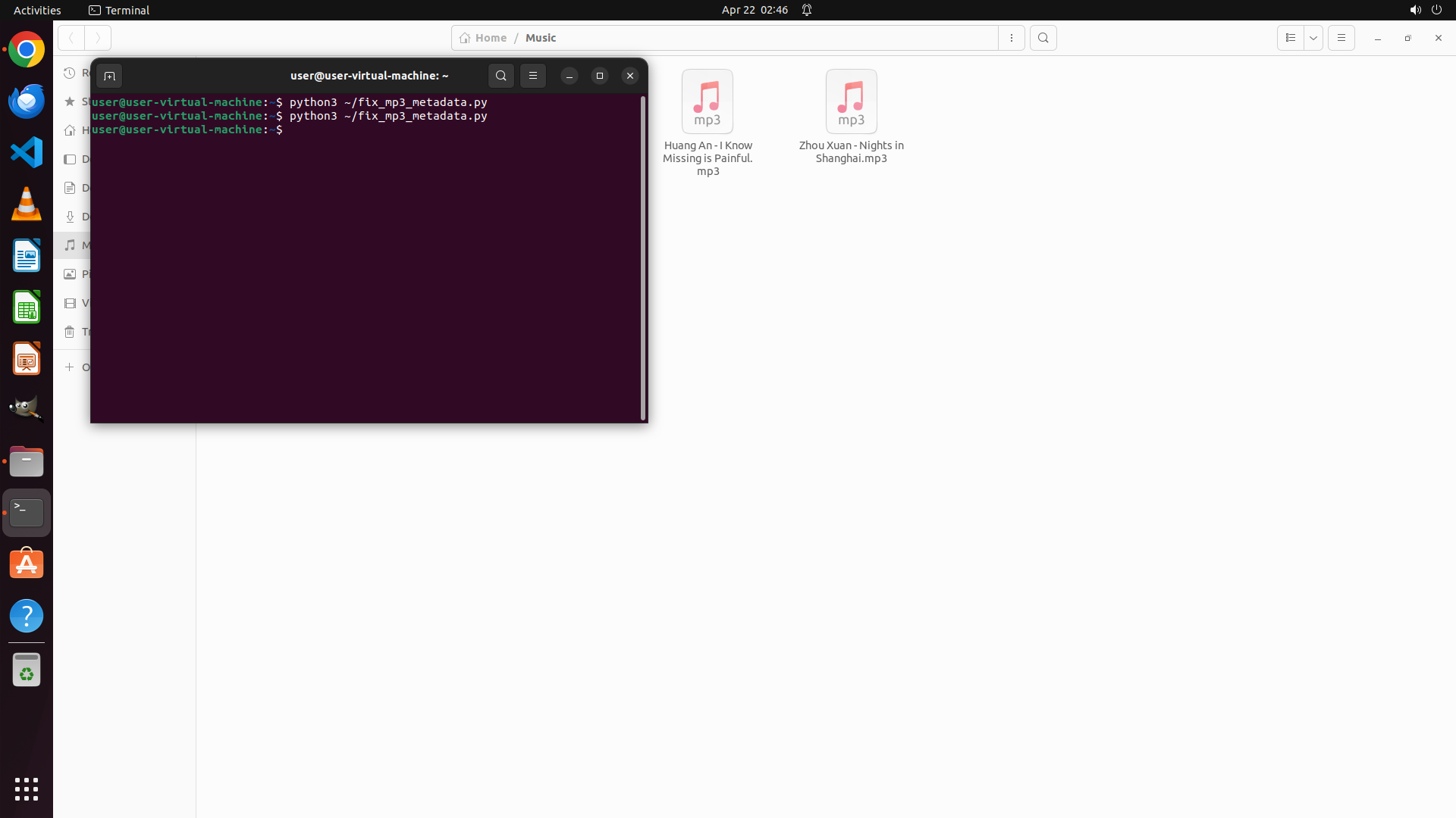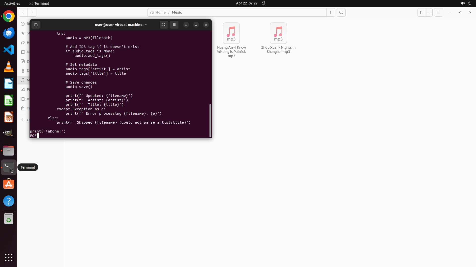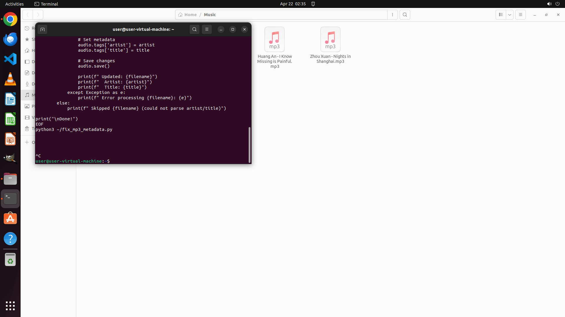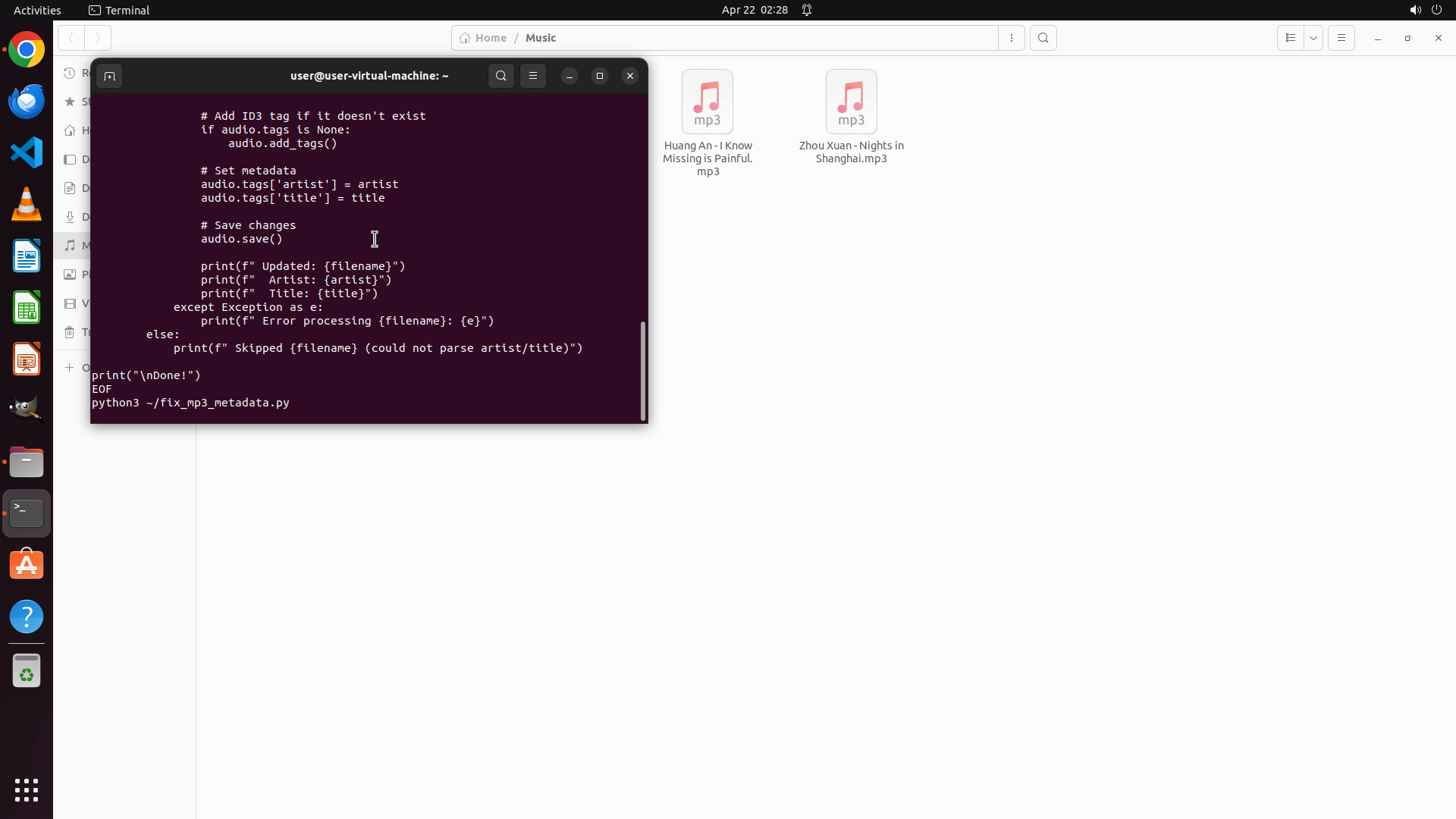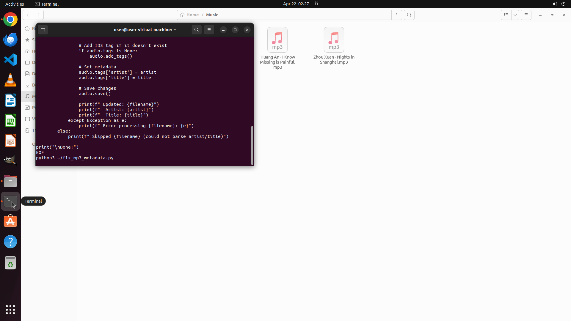1. 终端显示命令 `python3 ~/fix_mp3_metadata.py` 已执行并返回到命令提示符