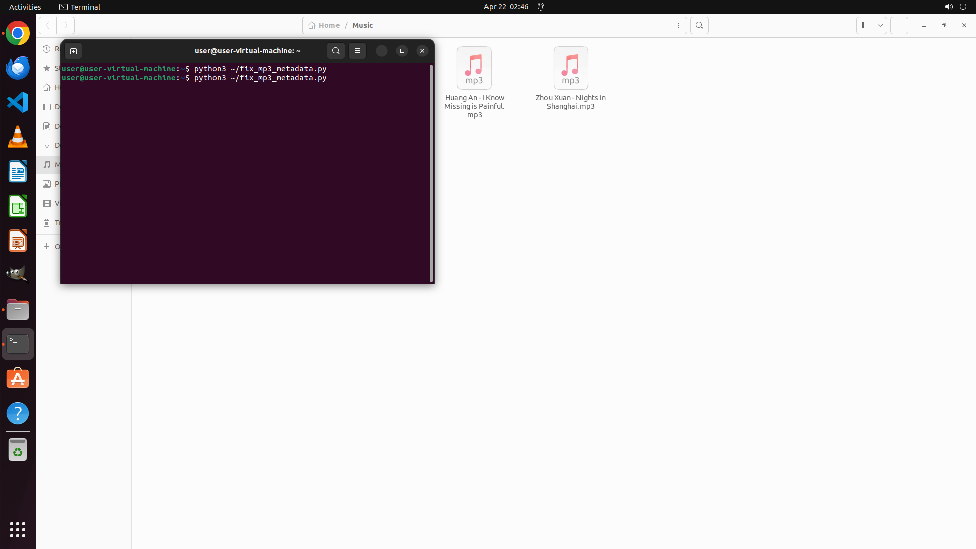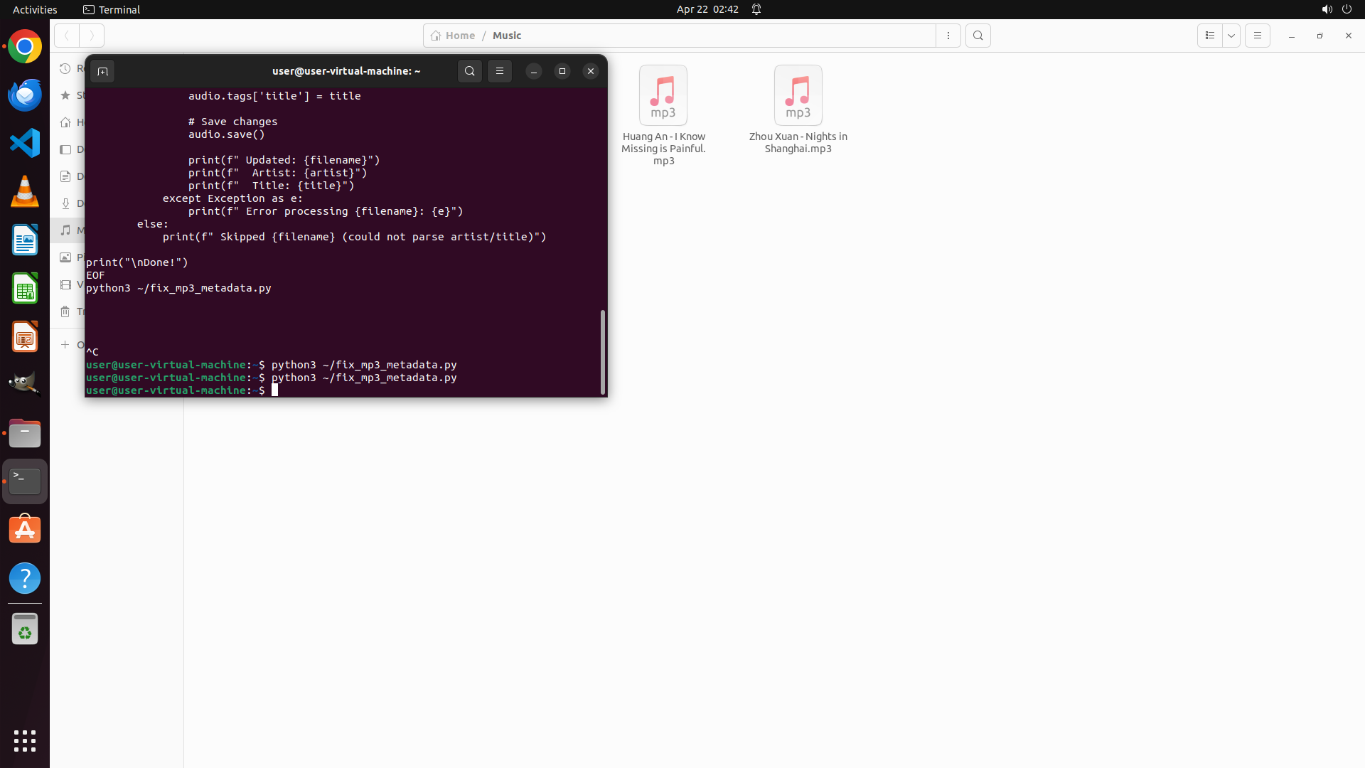 3. 可以看到脚本执行命令 `python3 ~/fix_mp3_metadata.py` 在终端中