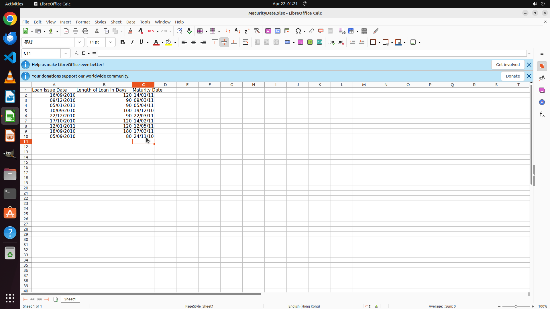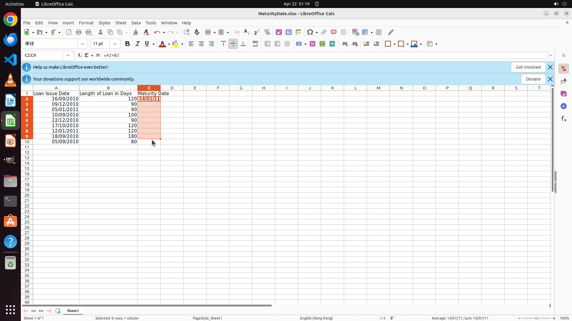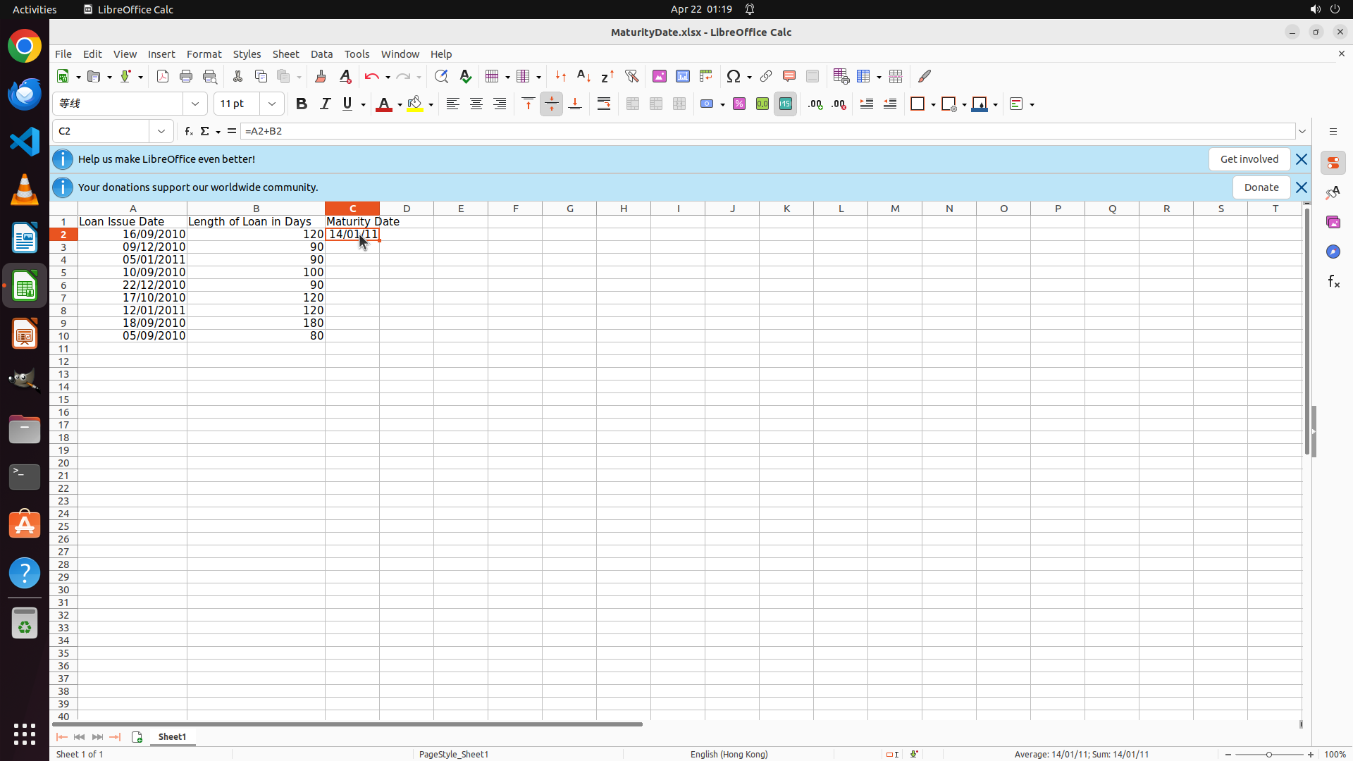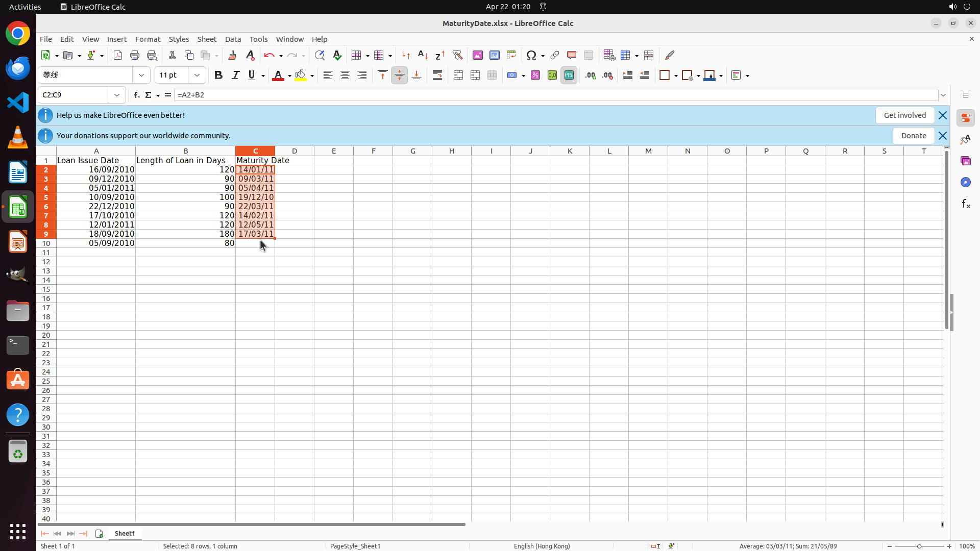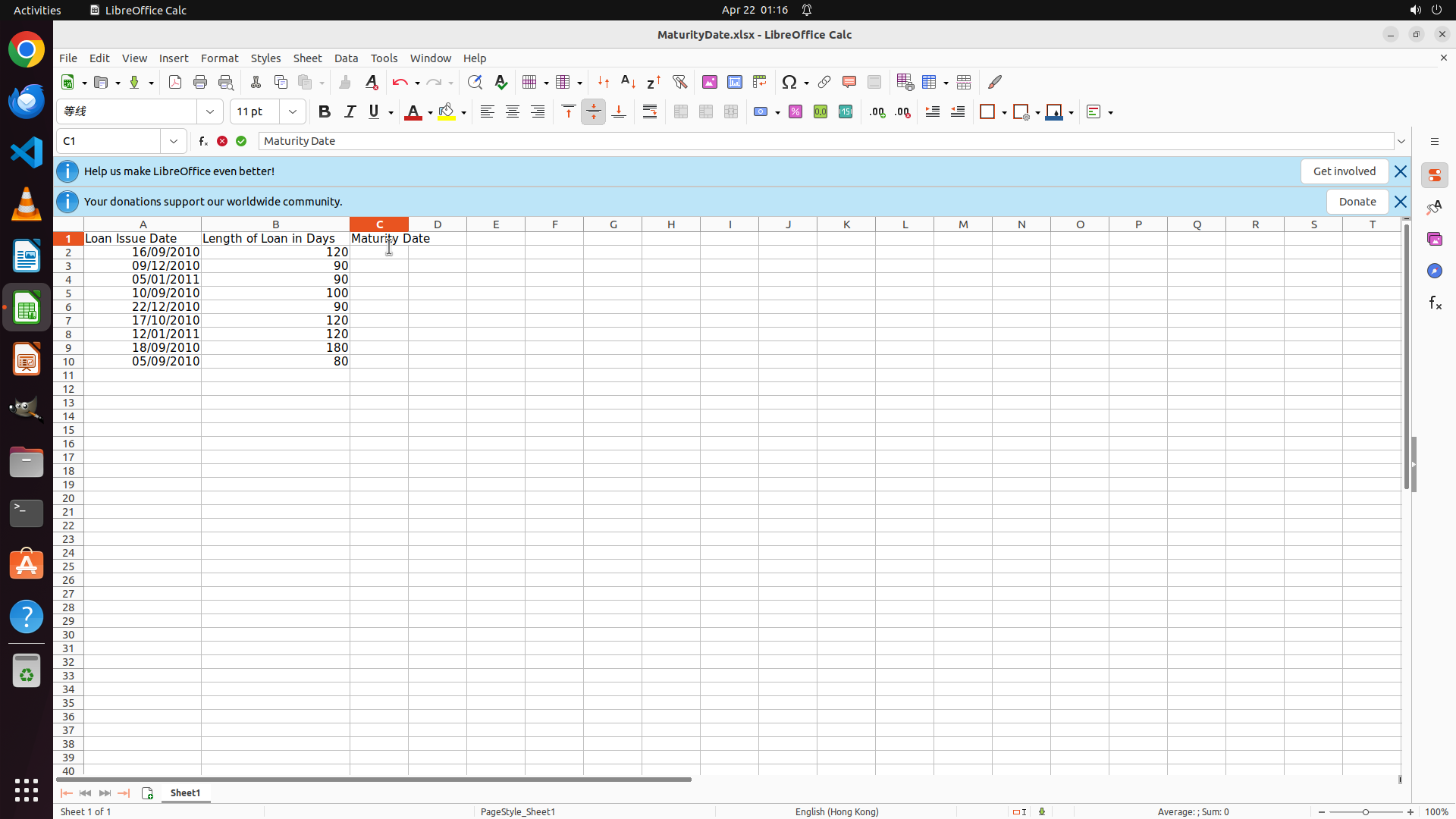 - LibreOffice Calc is open with a spreadsheet "MaturityDate.xlsx"