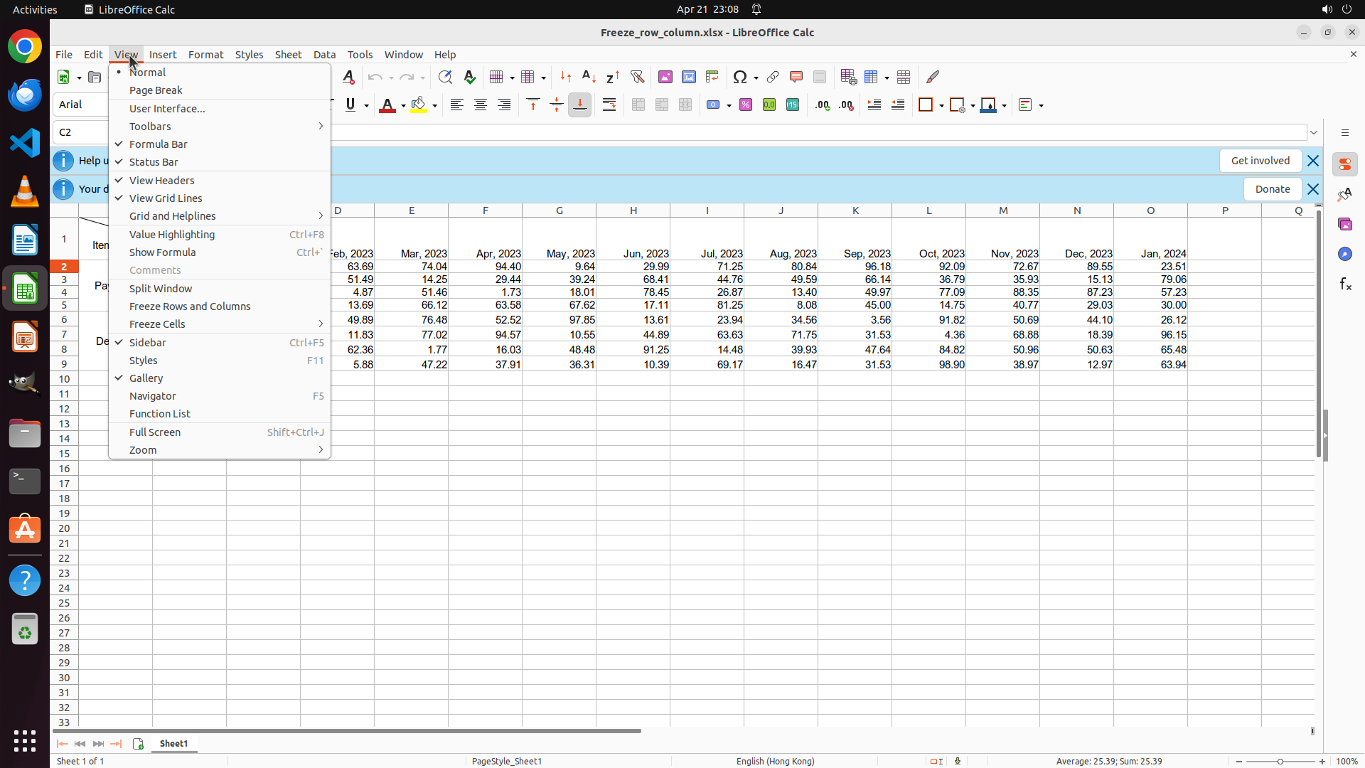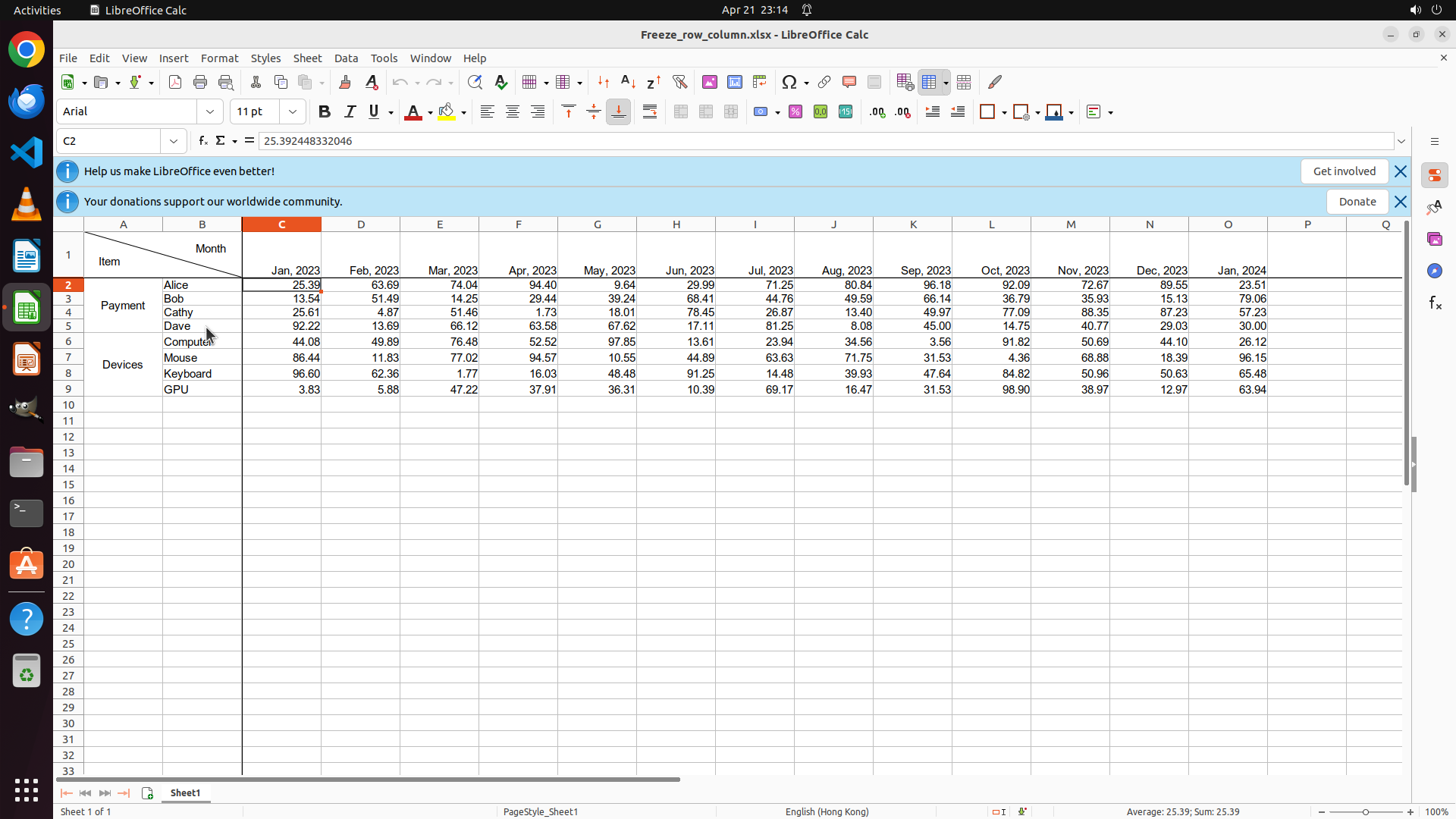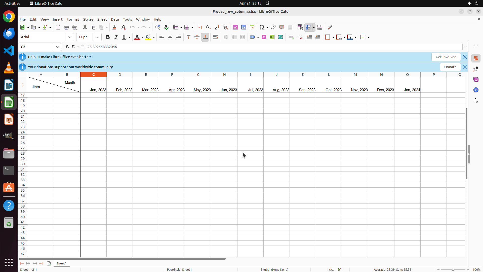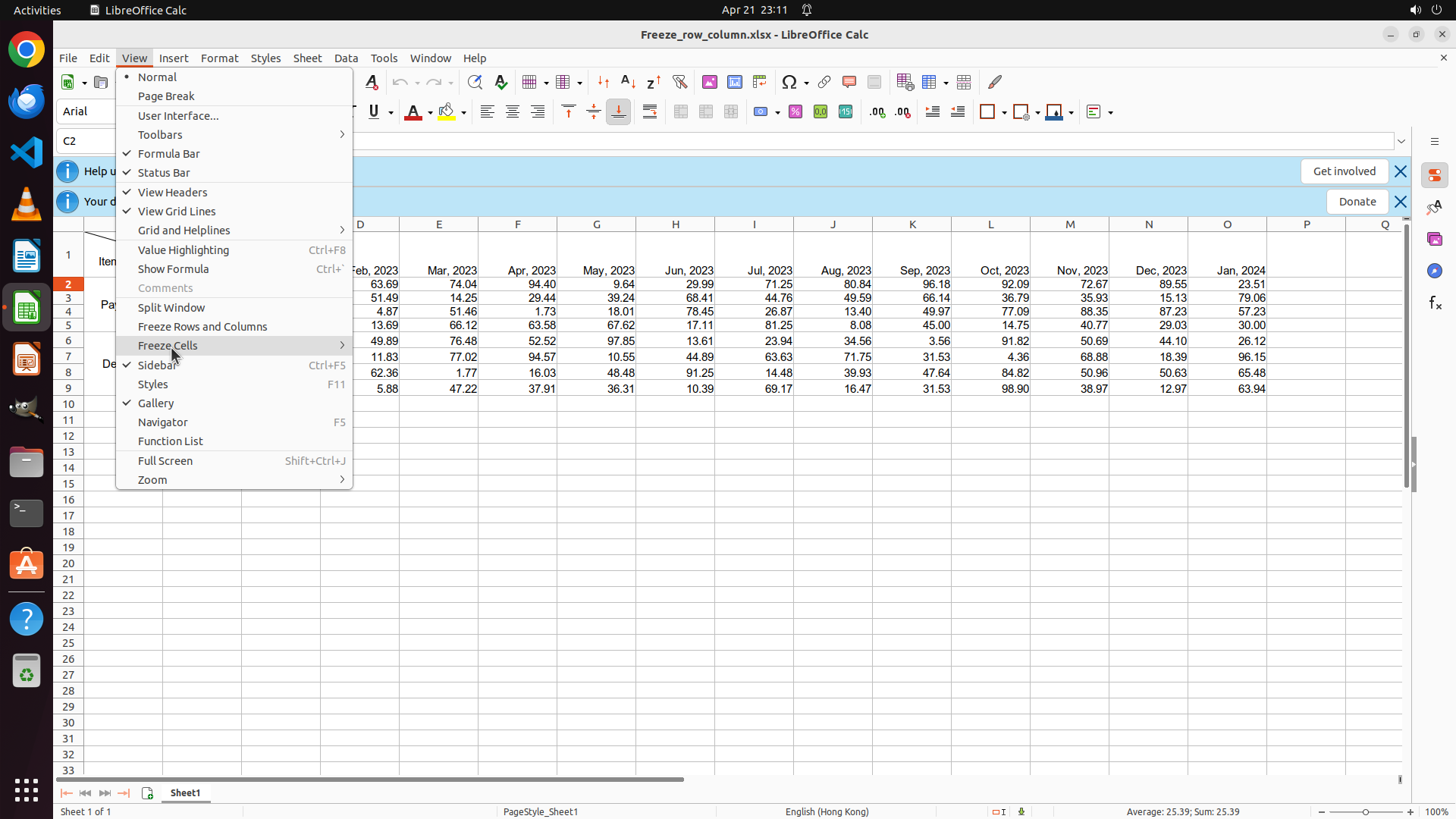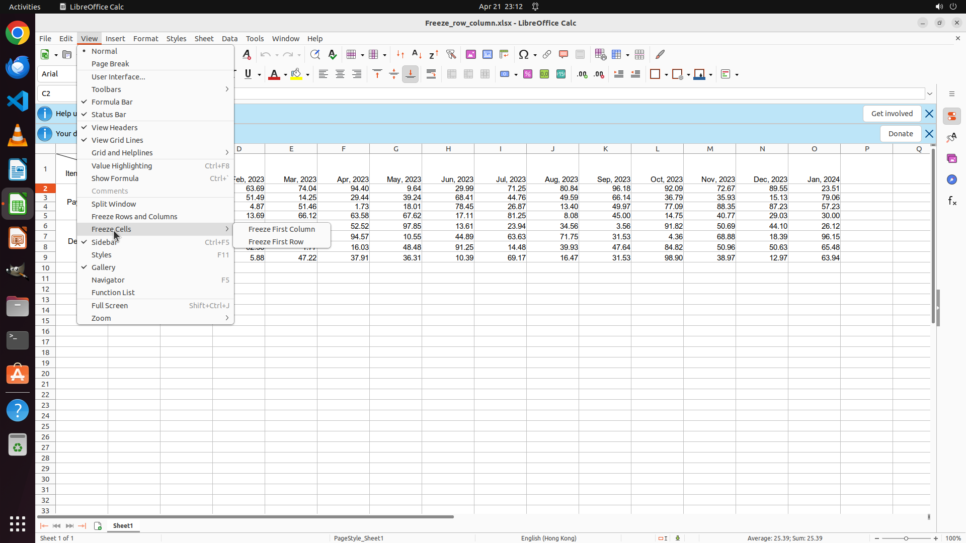 - LibreOffice Calc is open with the spreadsheet "Freeze_row_column.xlsx"