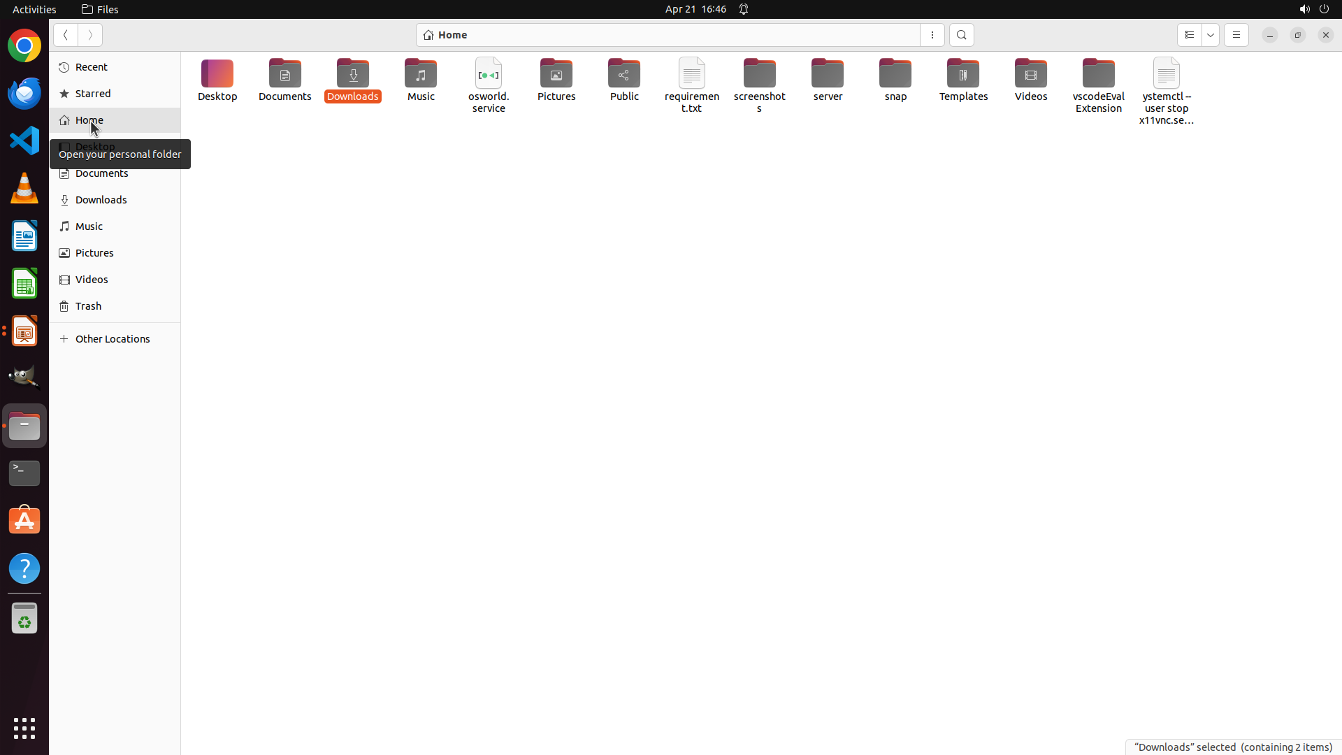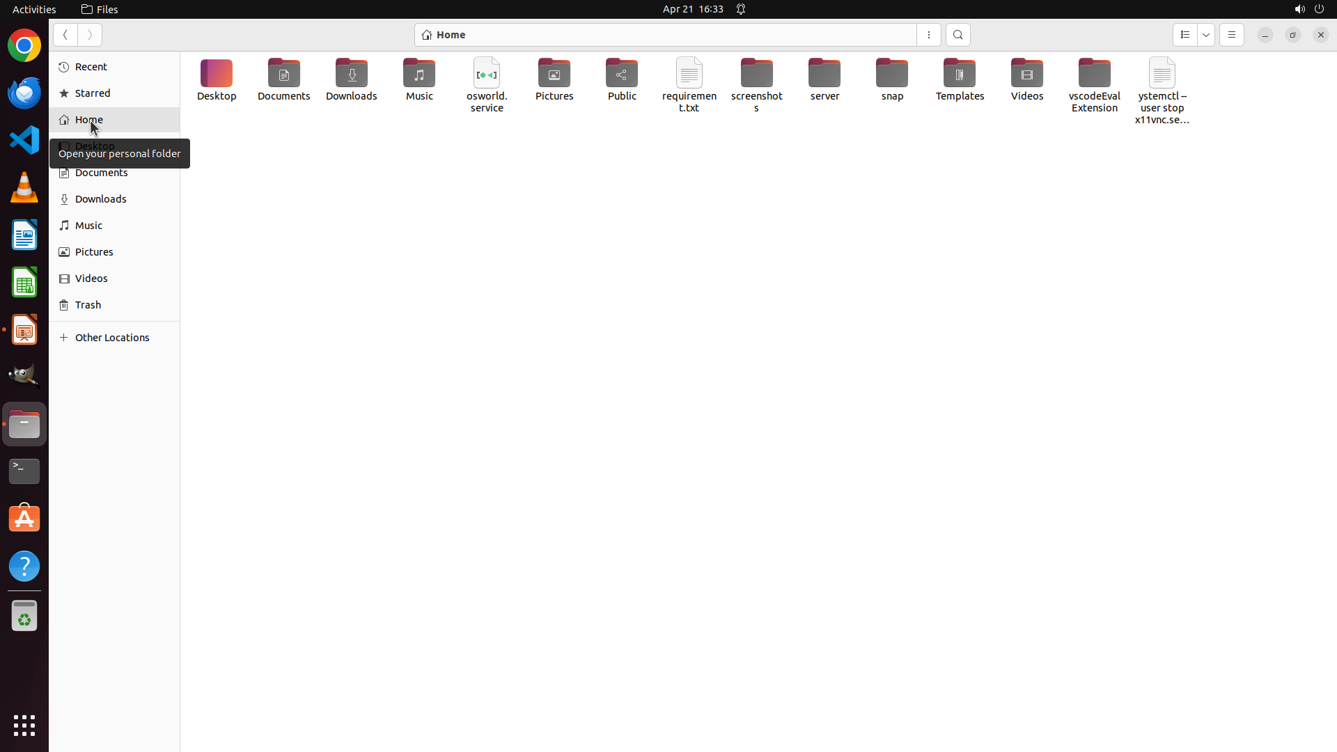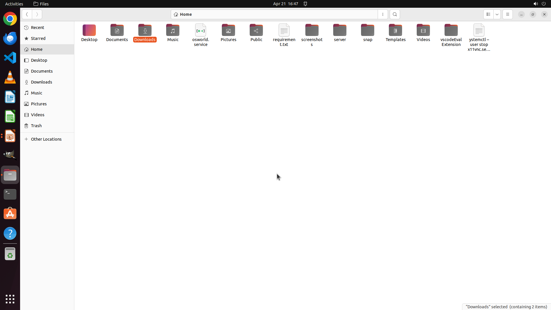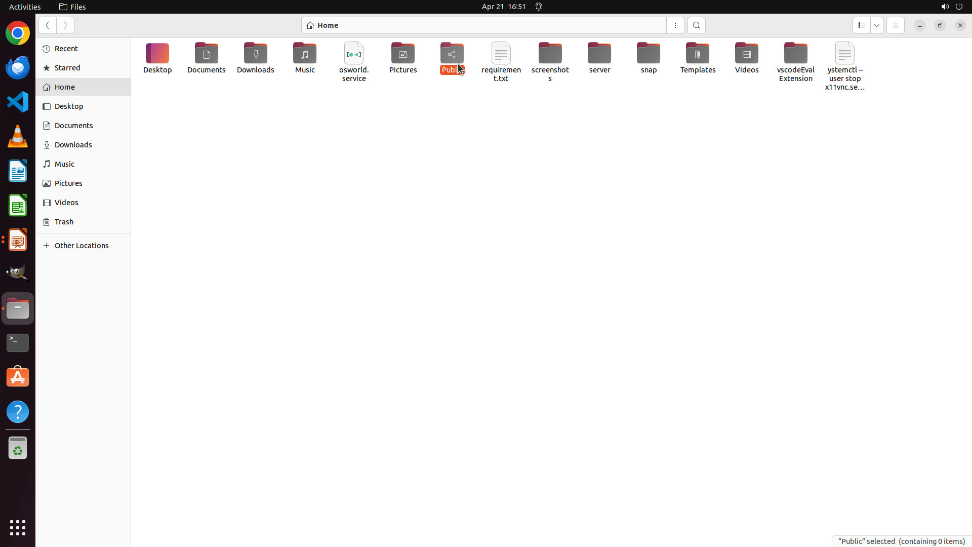 Home目录中还有其他未检查的文件夹:Public、Videos、Music、screenshots、server、snap、Templates、vscodeEvalExtension 等。