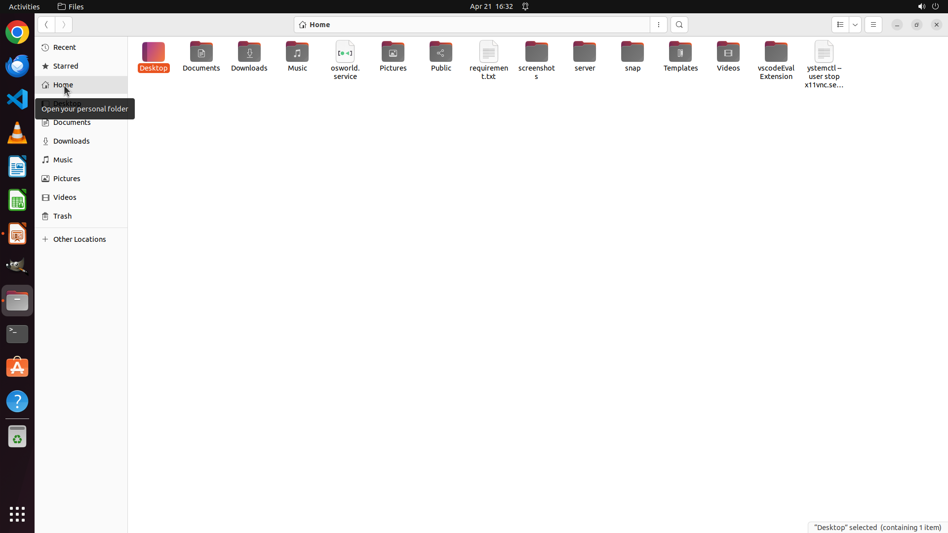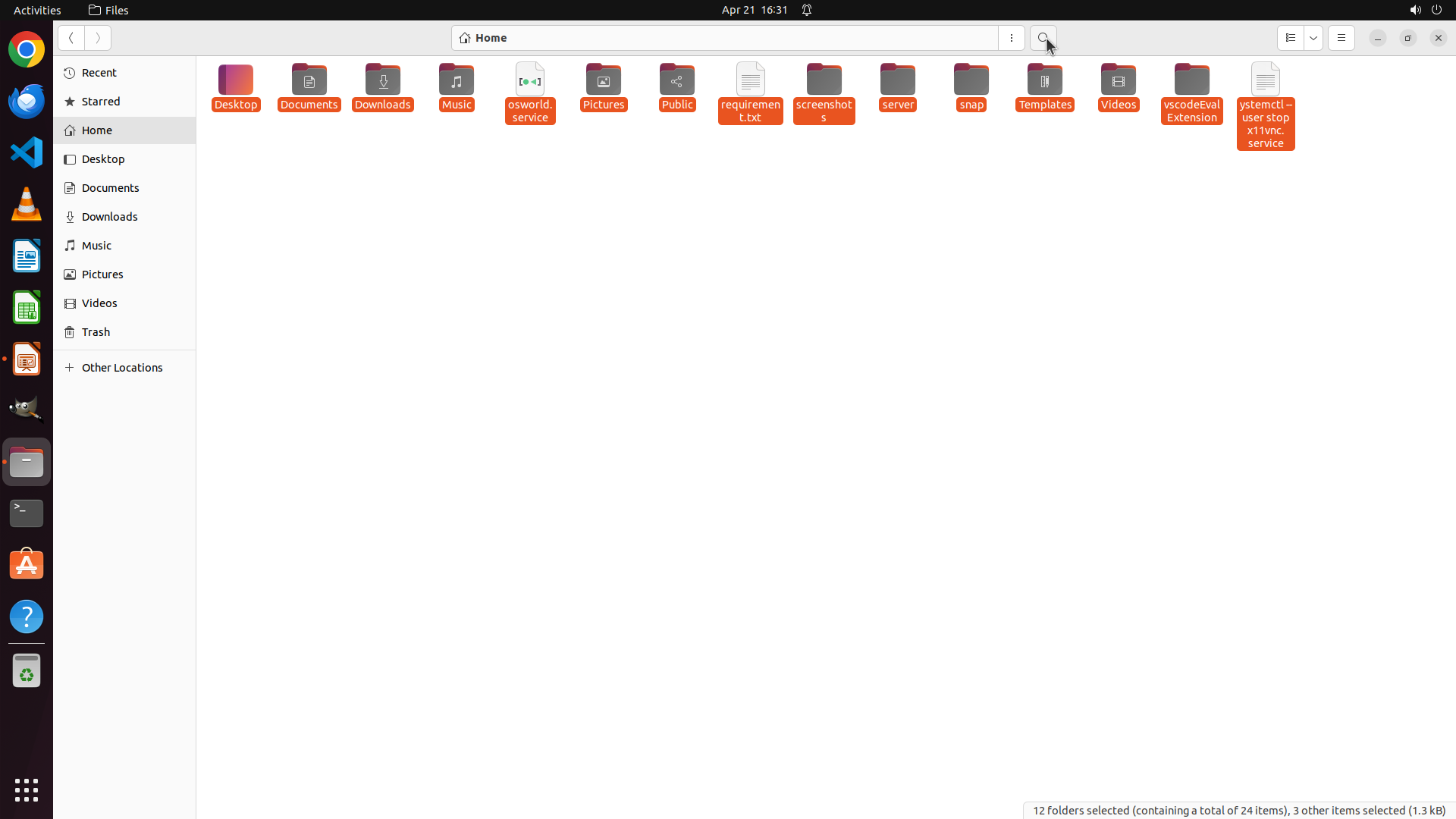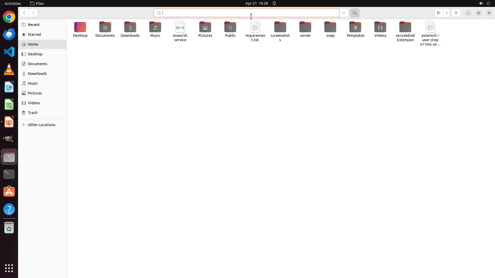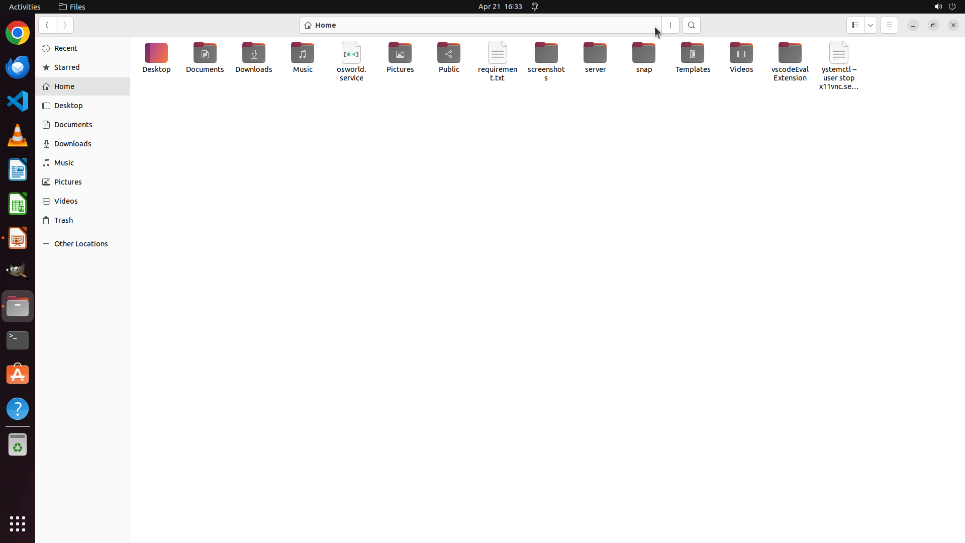 Home目录中还有其他未检查的文件夹:Public、Videos、Music、screenshots、server、snap、Templates、vscodeEvalExtension 等。