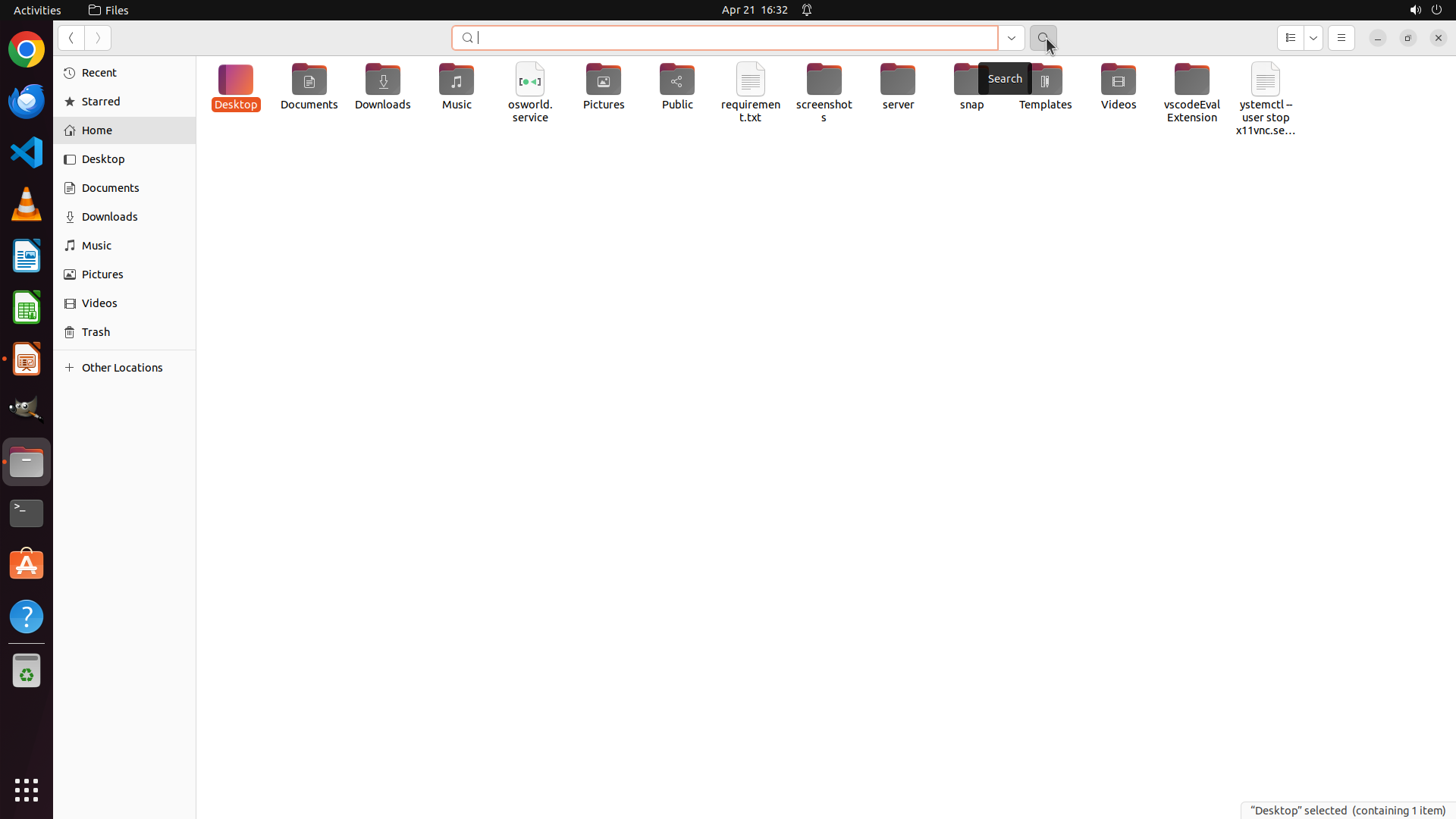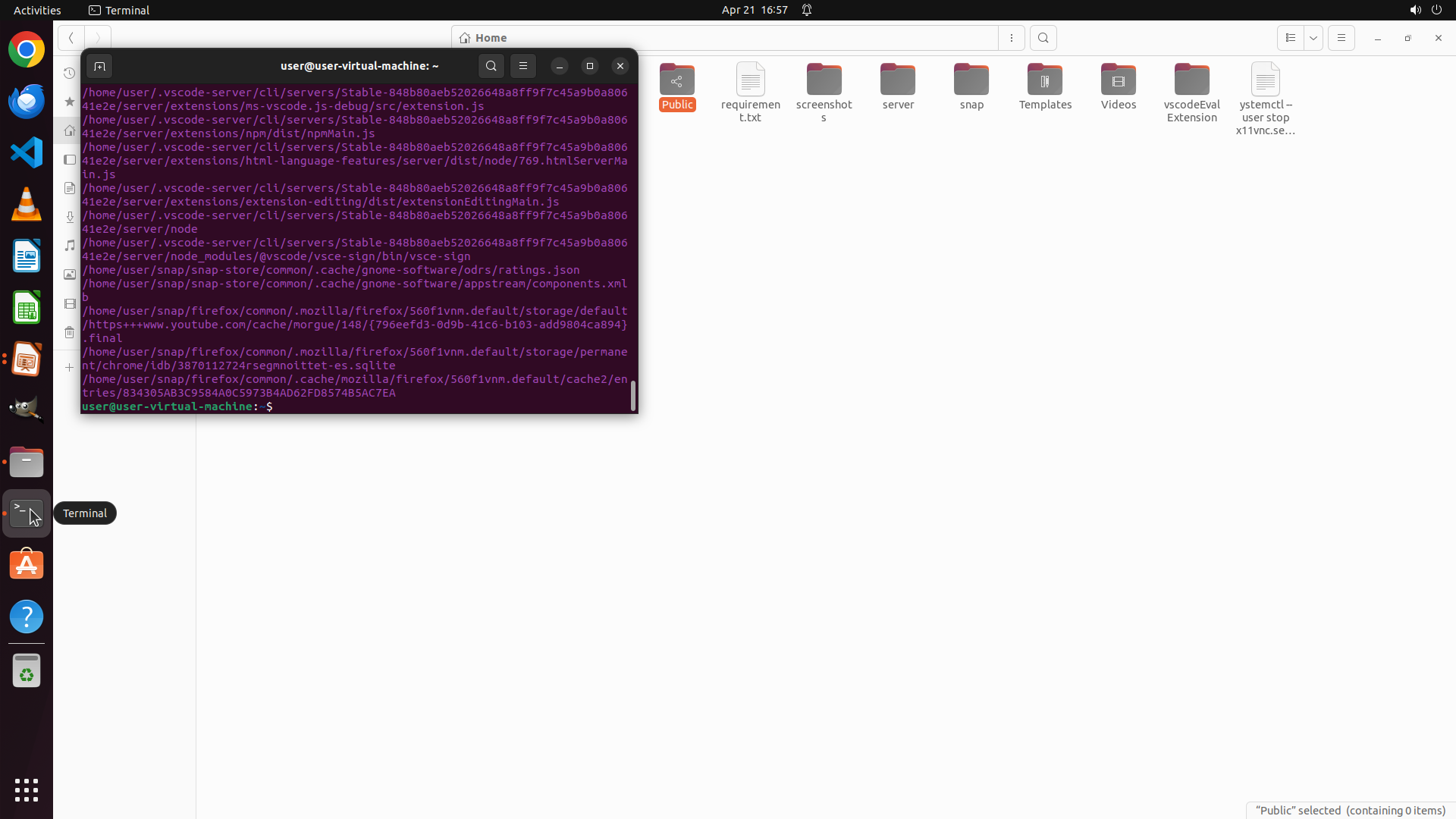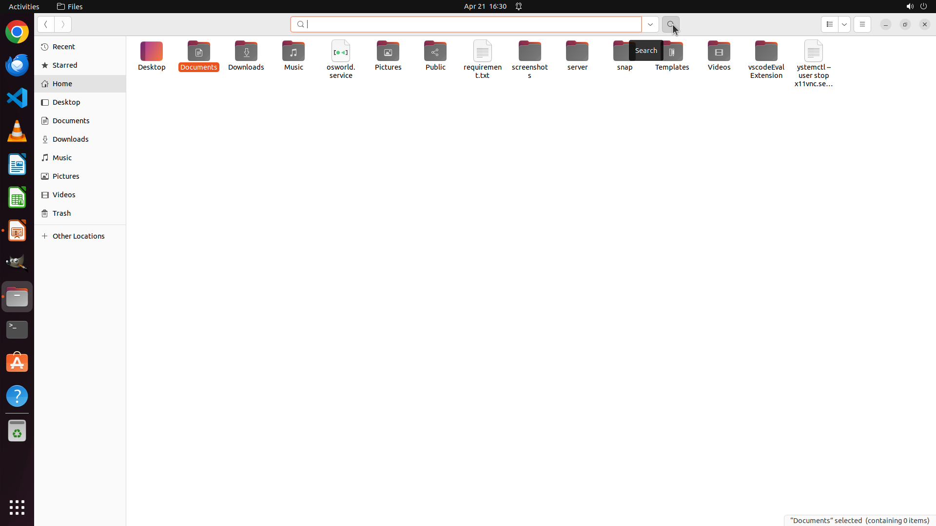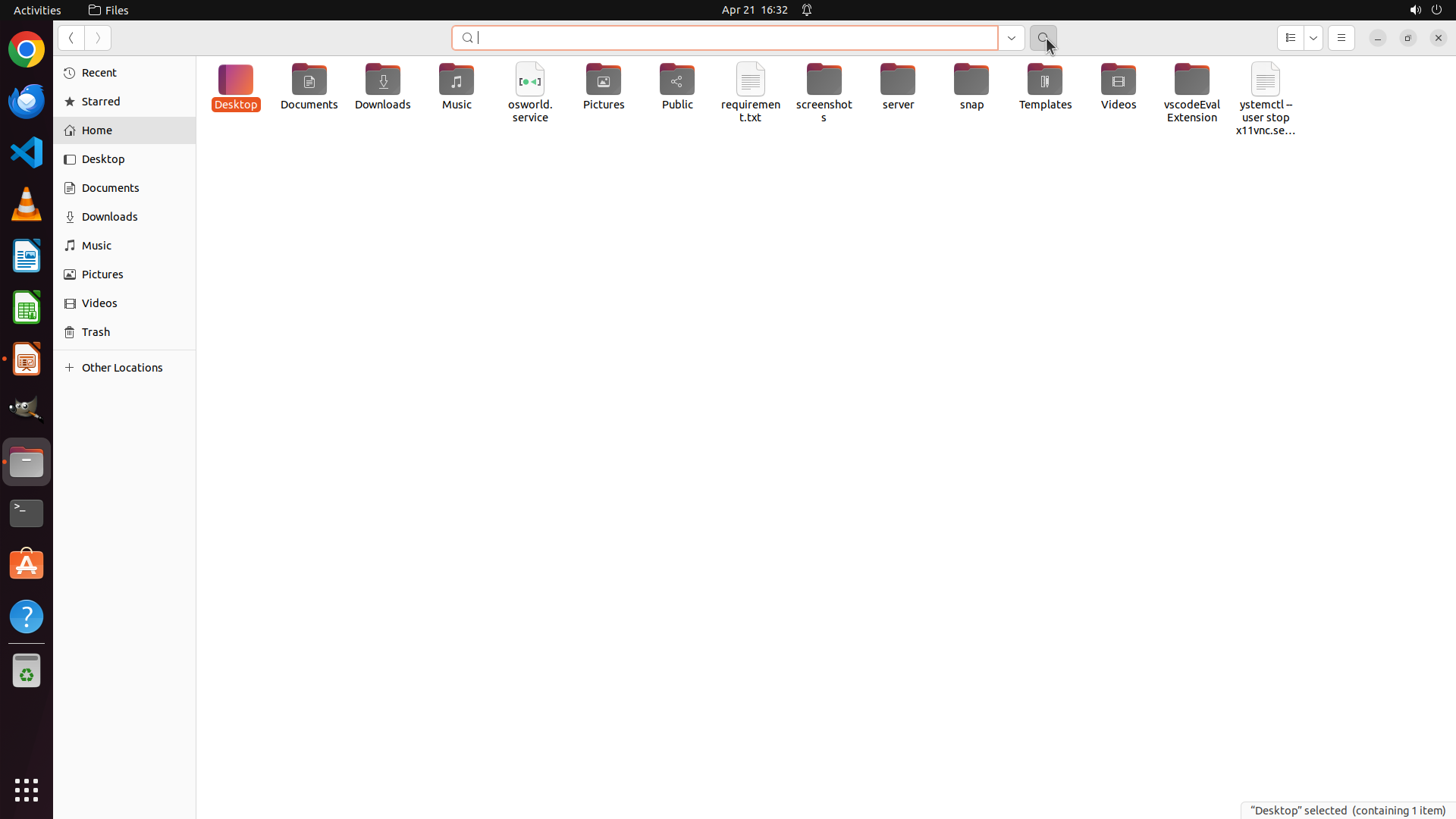 Home目录中还有其他未检查的文件夹:Public、Videos、Music、screenshots、server、snap、Templates、vscodeEvalExtension 等。