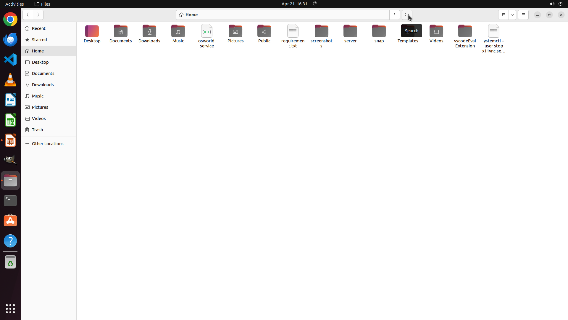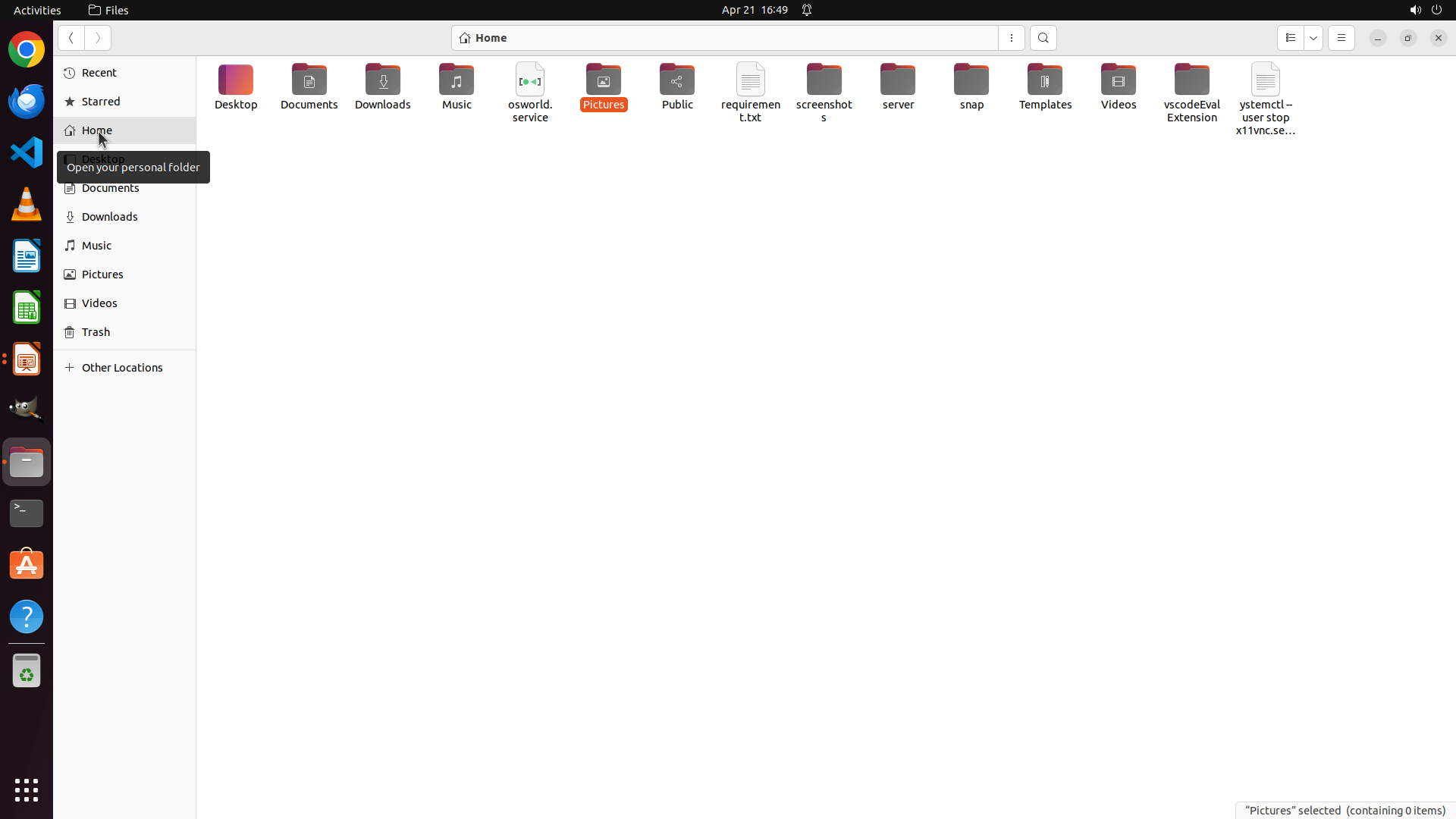 Home目录中还有其他未检查的文件夹:Videos、Music、screenshots、server、snap、Templates、vscodeEvalExtension 等。