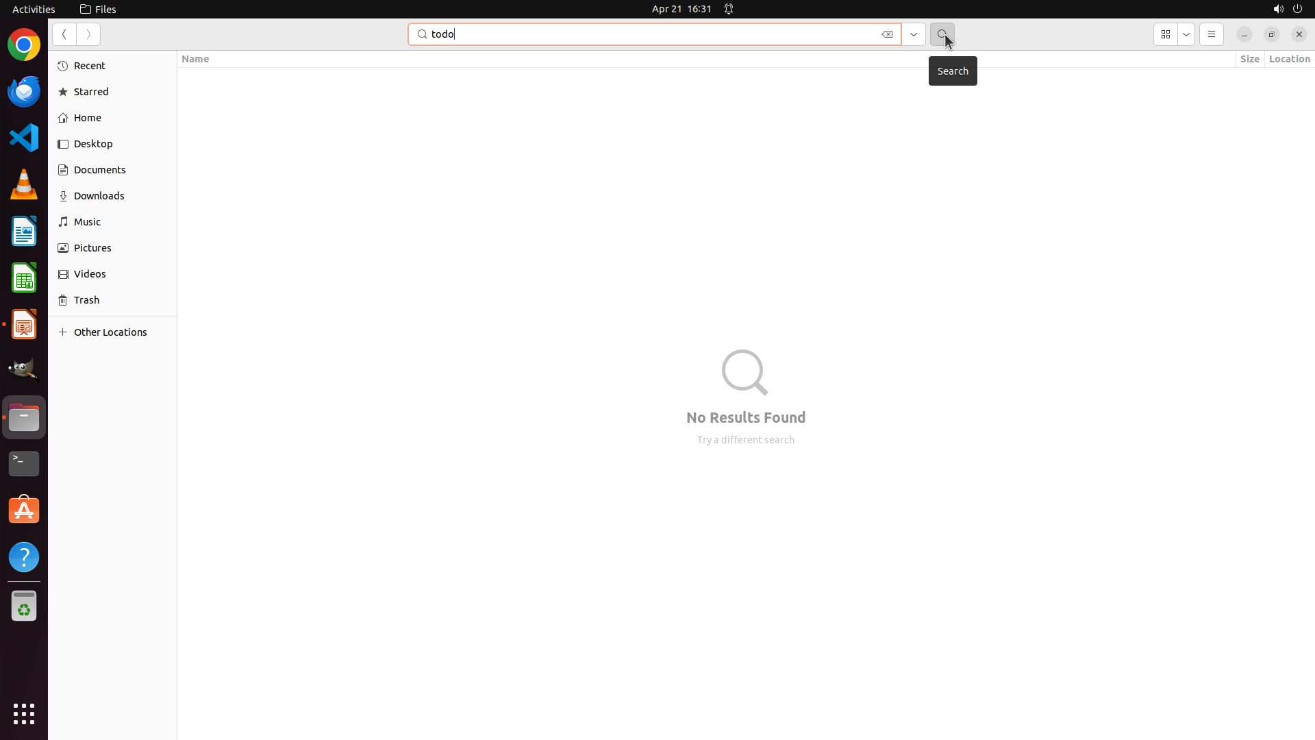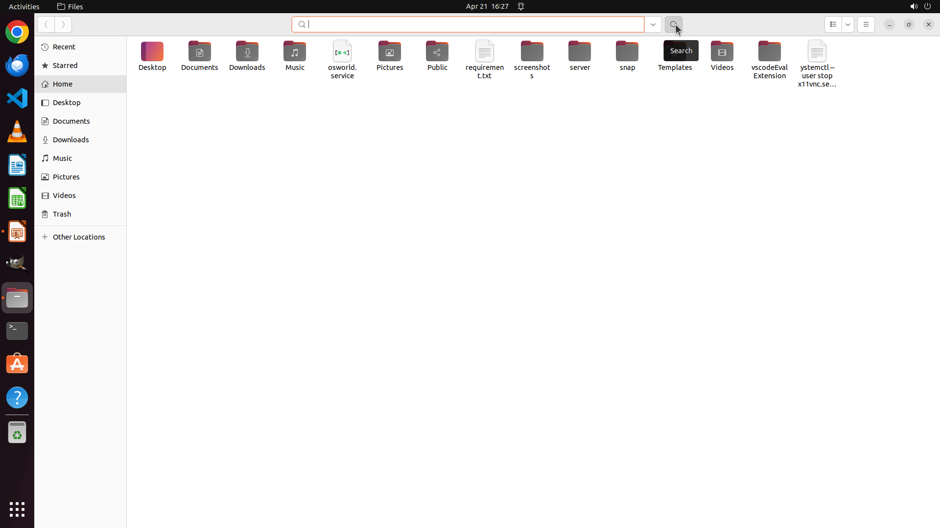 文件管理器已打开,搜索功能已激活。搜索框现在处于活动状态(在顶部显示),可以输入搜索关键词。当前显示的是 Home 目录的文件夹视图。
