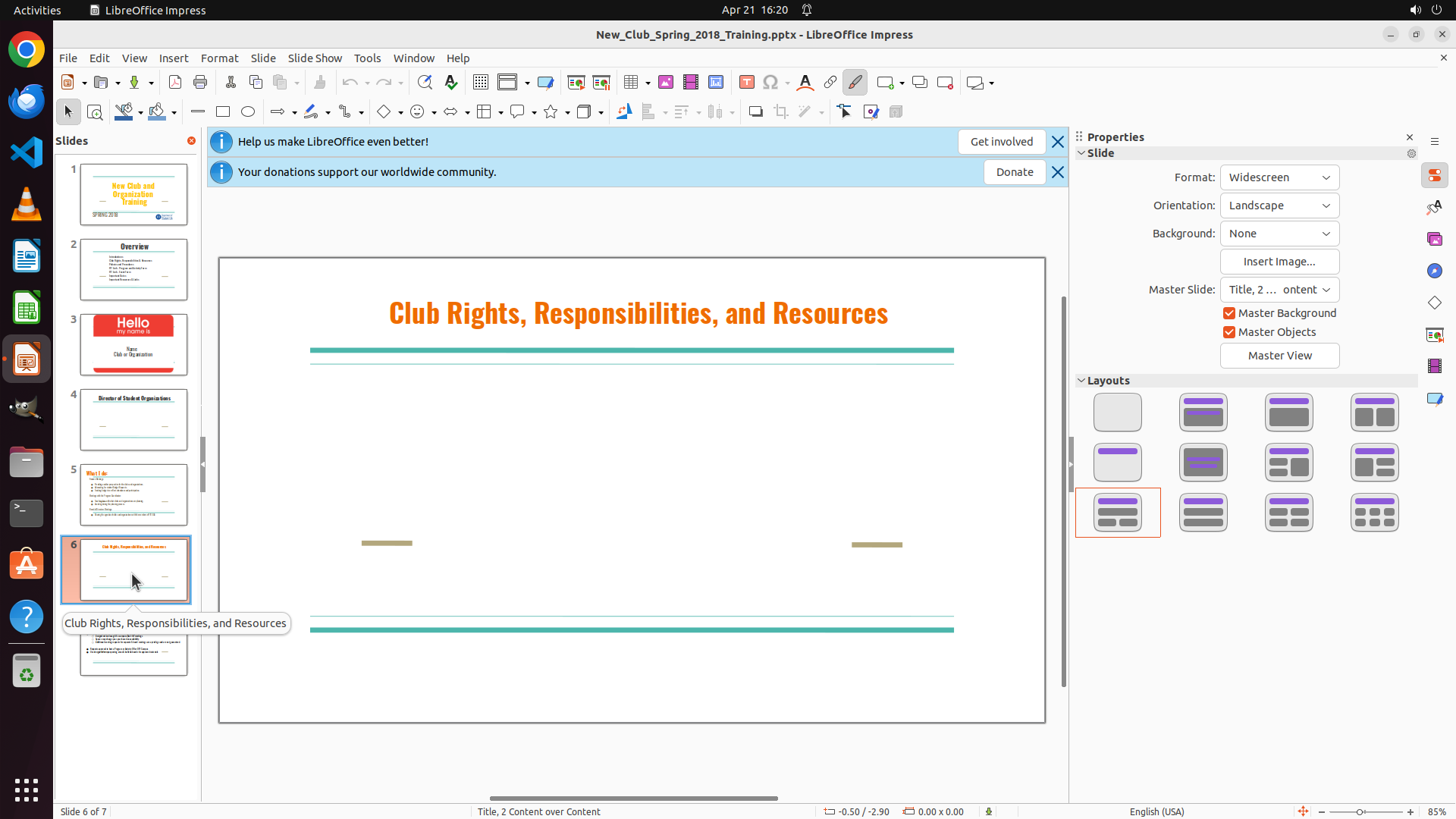 当前屏幕显示 LibreOffice Impress 正在打开 "New_Club_Spring_2018_Training.pptx" 演示文稿,现在位于第 6 张幻灯片(共 7 张)。