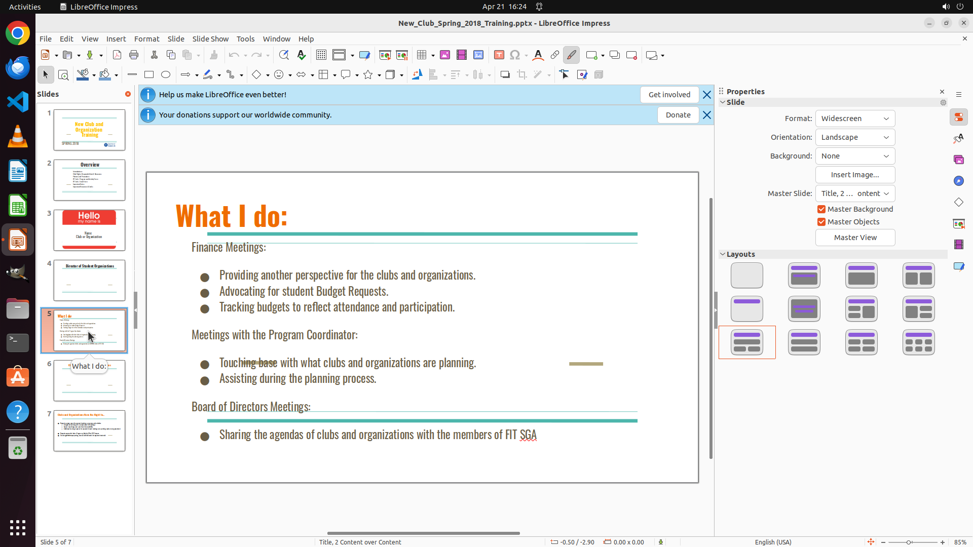 当前屏幕显示 LibreOffice Impress 正在打开一个名为 "New_Club_Spring_2018_Training.pptx" 的演示文稿,当前位于第 5 张幻灯片(共 7 张)。当前幻灯片内容是关于"New Club and Organization Training",显示"What I do:"部分,包含 Finance Meetings、Meetings with the Program Coordinator 和 Board of Directors Meetings 等内容。