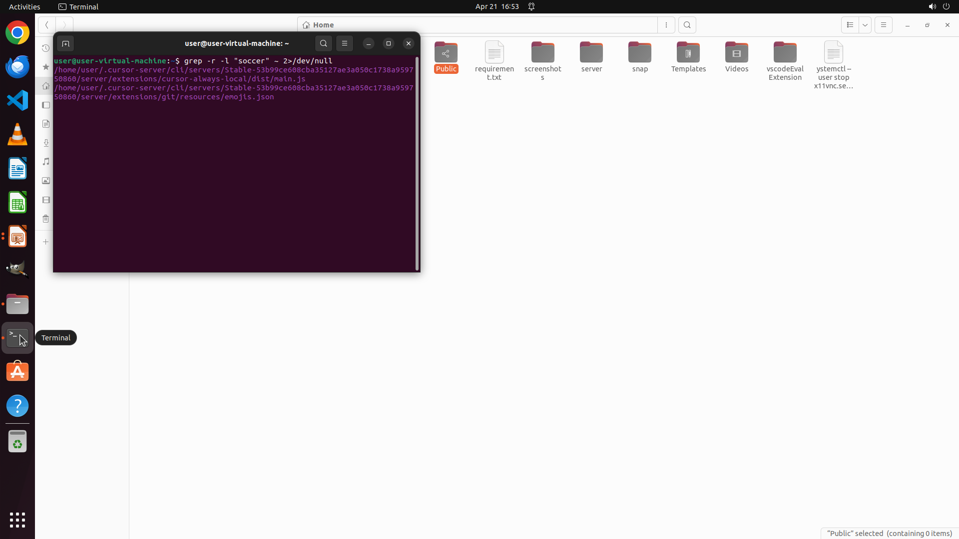 终端已成功执行 `grep -r -l "soccer" ~ 2>/dev/null` 命令,搜索结果显示找到了一些包含 "soccer" 的文件,但这些文件路径都是系统文件(位于 .vscode-server、.cursor-server、snap 等目录下),不是我们要找的足球俱乐部待办清单文件。