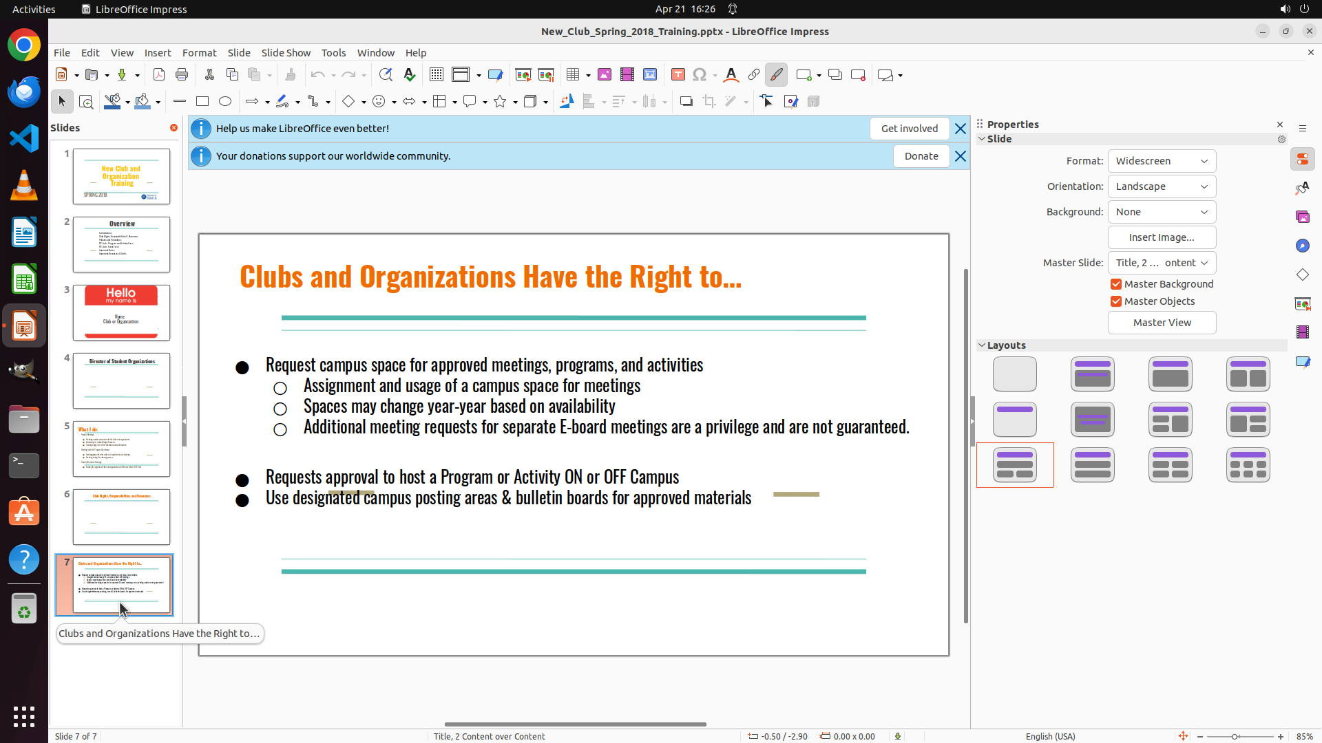 当前屏幕显示 LibreOffice Impress 正在打开一个名为 "New_Club_Spring_2018_Training.pptx" 的演示文稿。当前显示的是第7张幻灯片 "Clubs and Organizations Have the Right to..."。根据策略树,我需要先找到足球俱乐部的待办事项清单,首先应该检查第5张幻灯片 "What I do" 是否包含该清单。