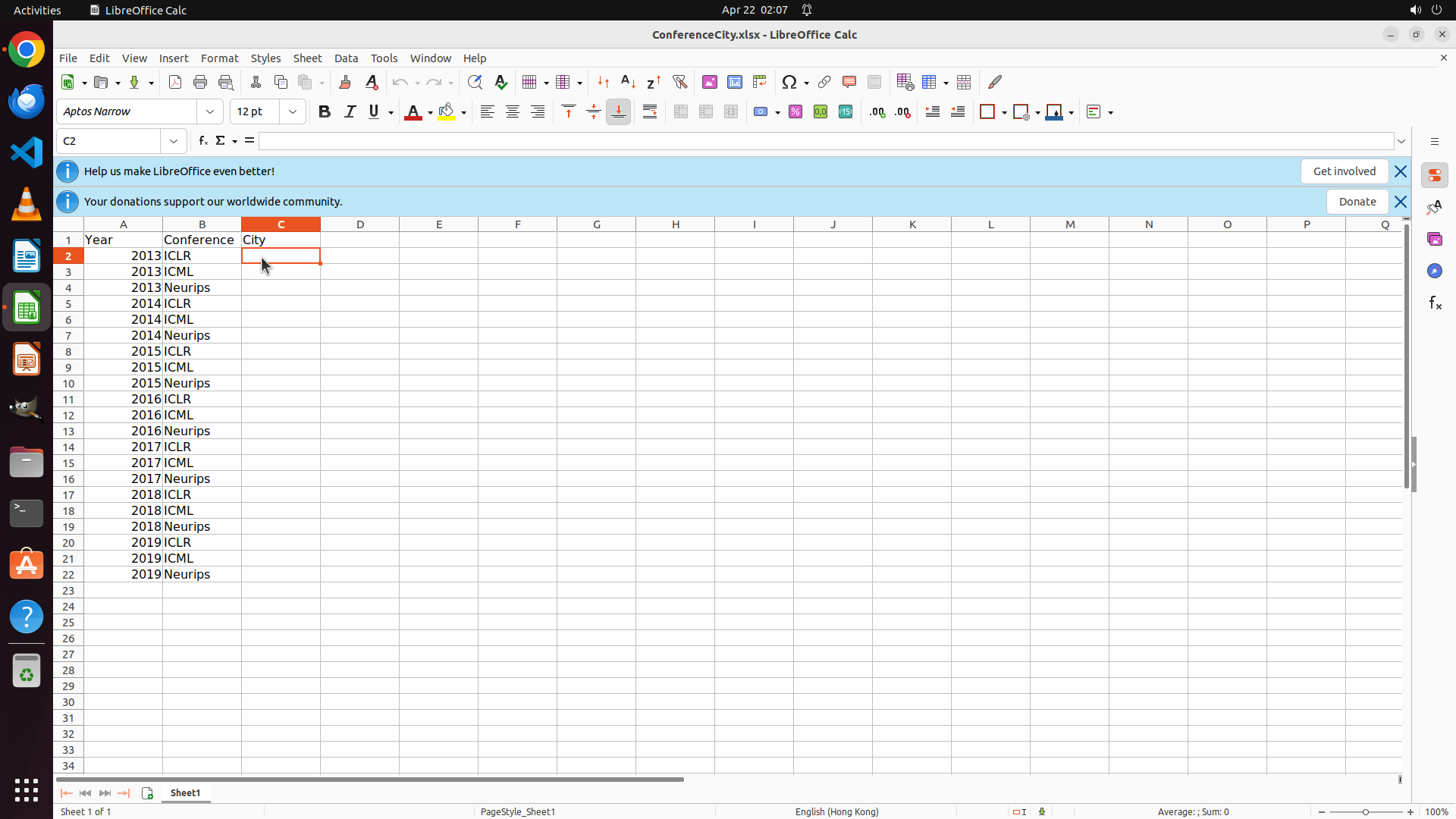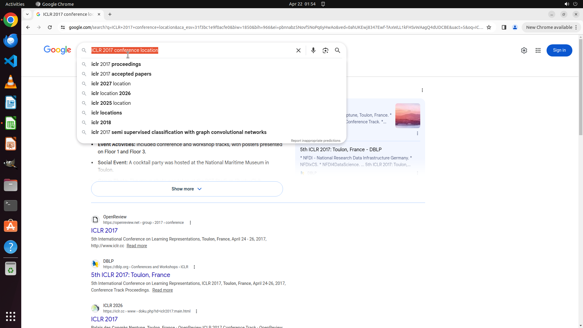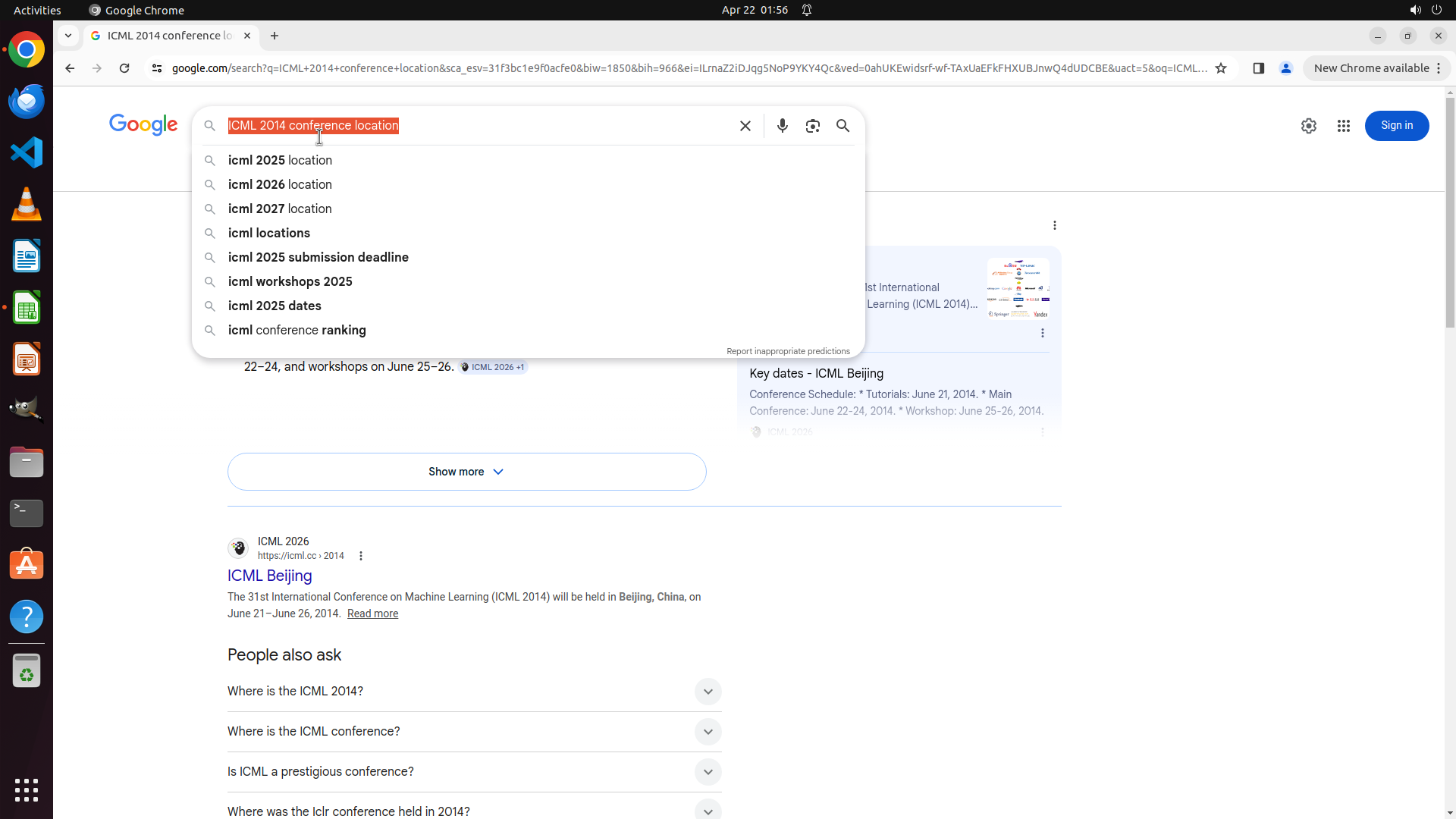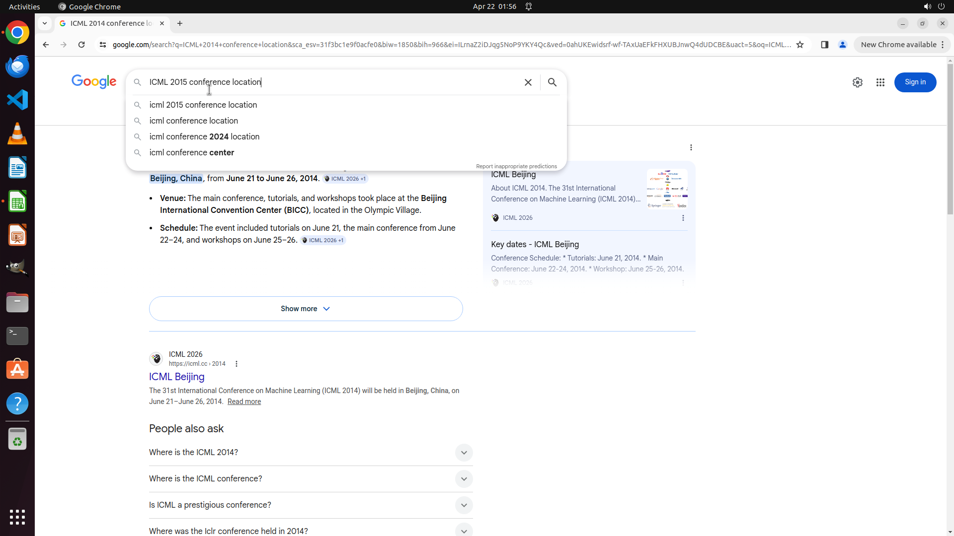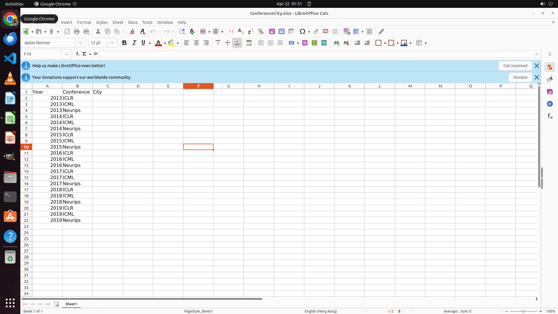 当前LibreOffice Calc已经打开,我需要先打开Chrome浏览器来搜索会议信息。我看到左侧边栏有Chrome图标,可以点击打开。
