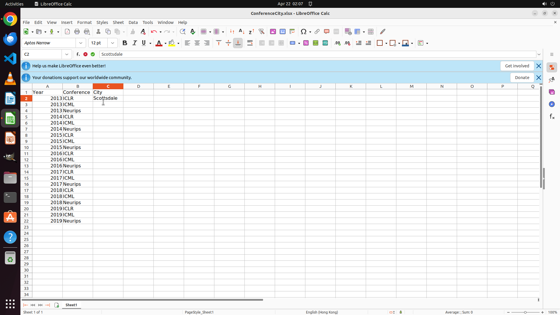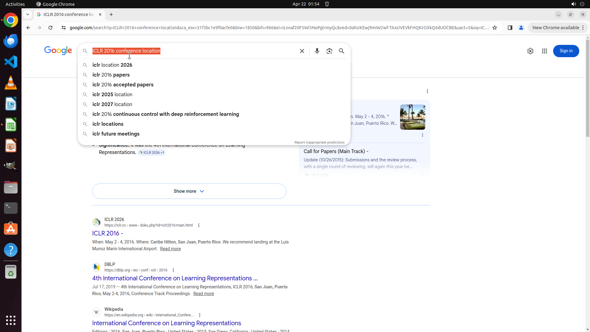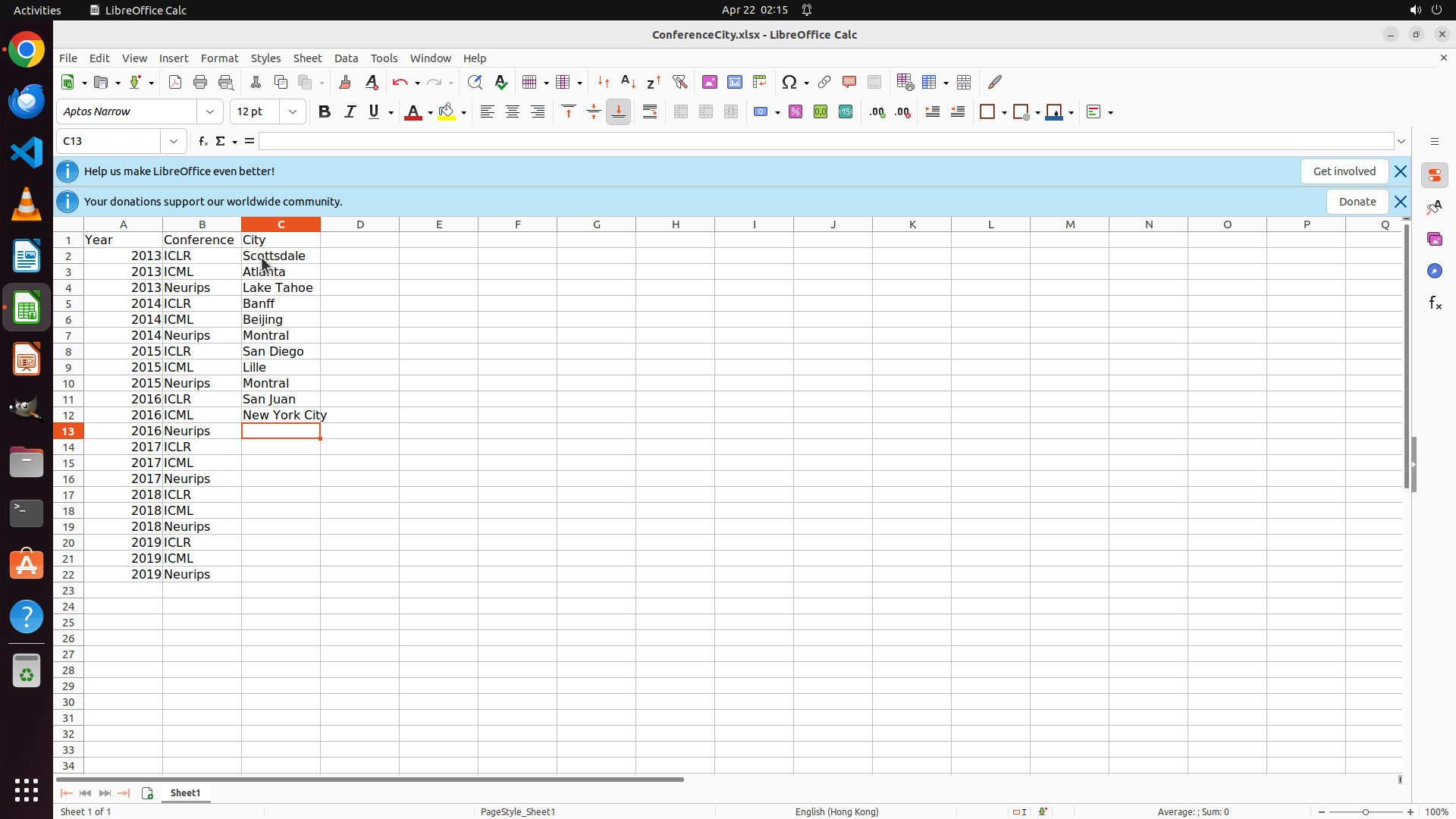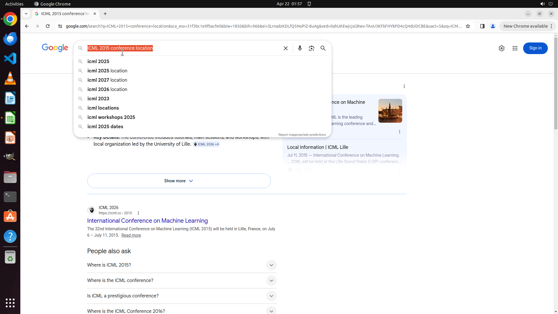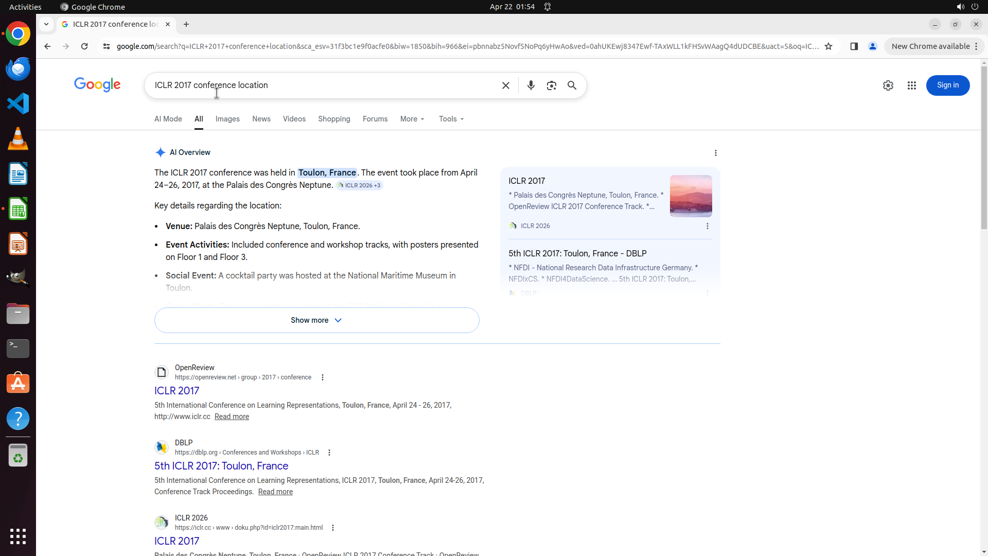 当前LibreOffice Calc已经打开,我需要先打开Chrome浏览器来搜索会议信息。我看到左侧边栏有Chrome图标,可以点击打开。