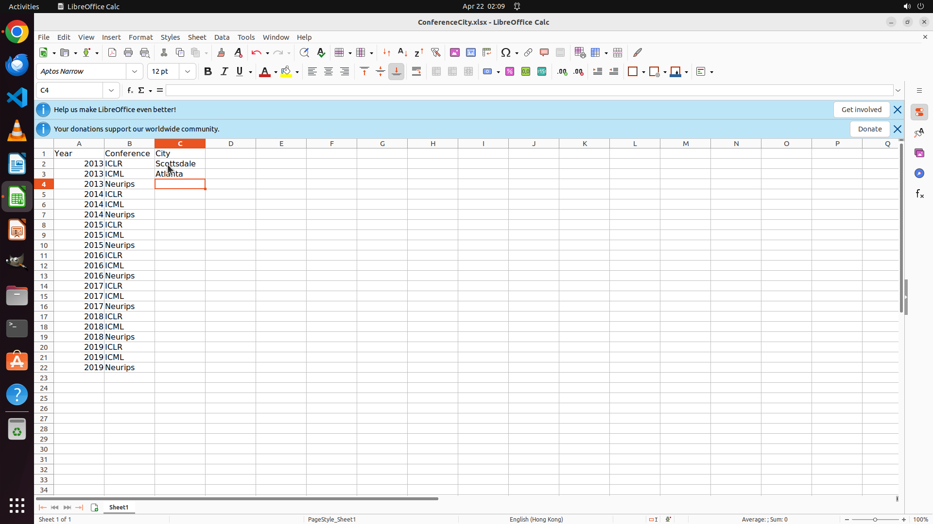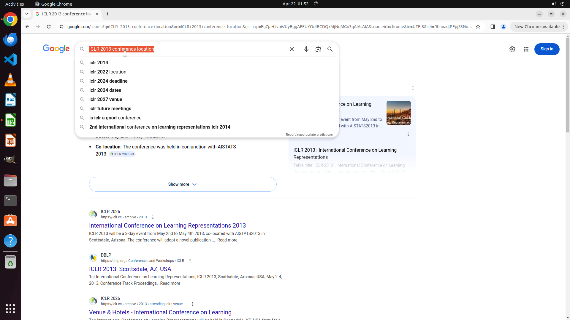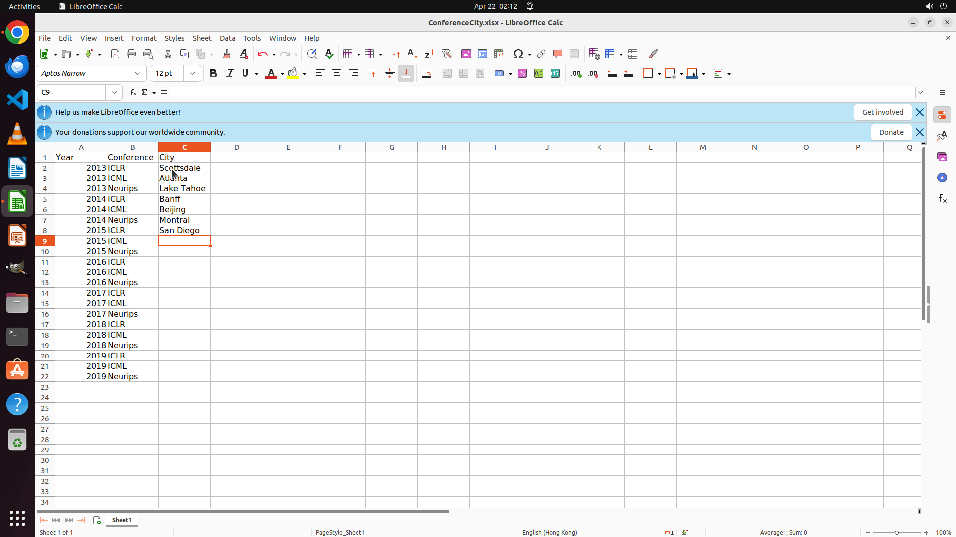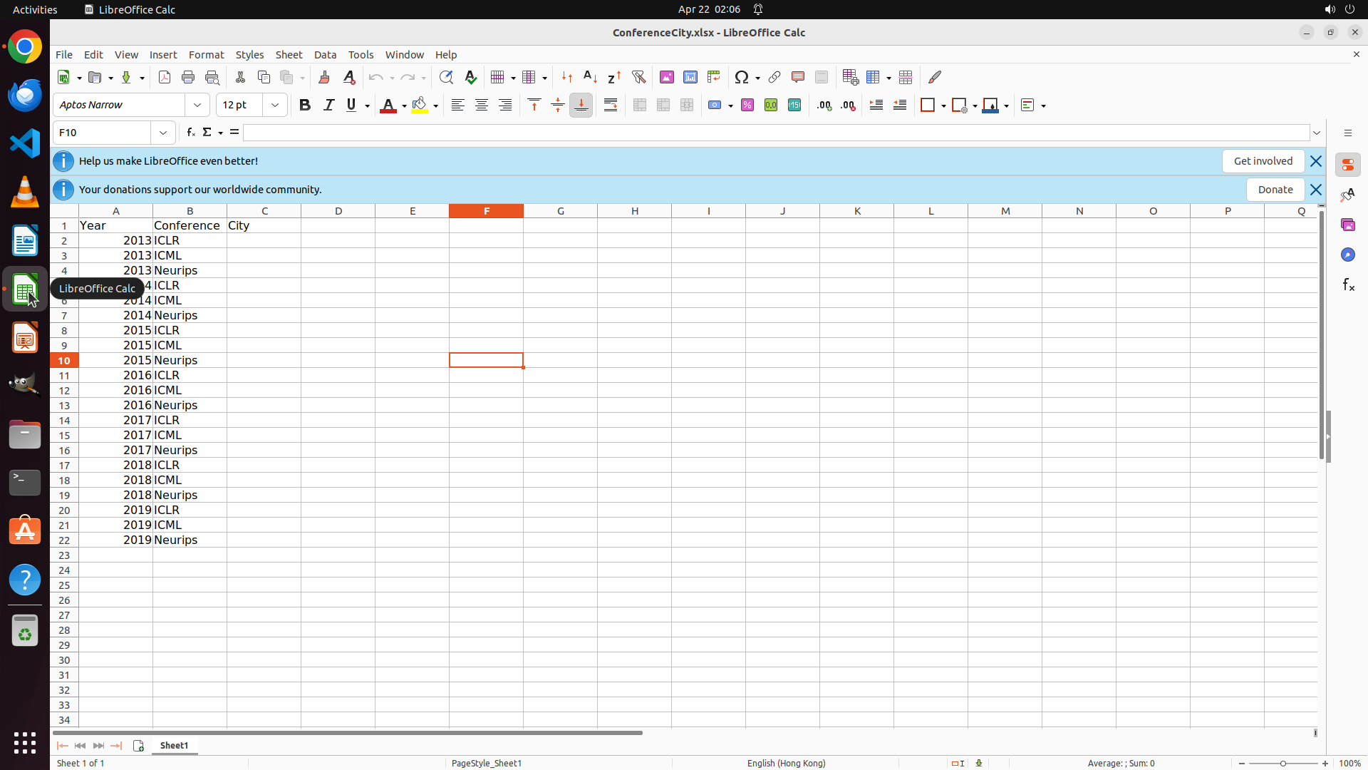 当前LibreOffice Calc已经打开,我需要先打开Chrome浏览器来搜索会议信息。我看到左侧边栏有Chrome图标,可以点击打开。