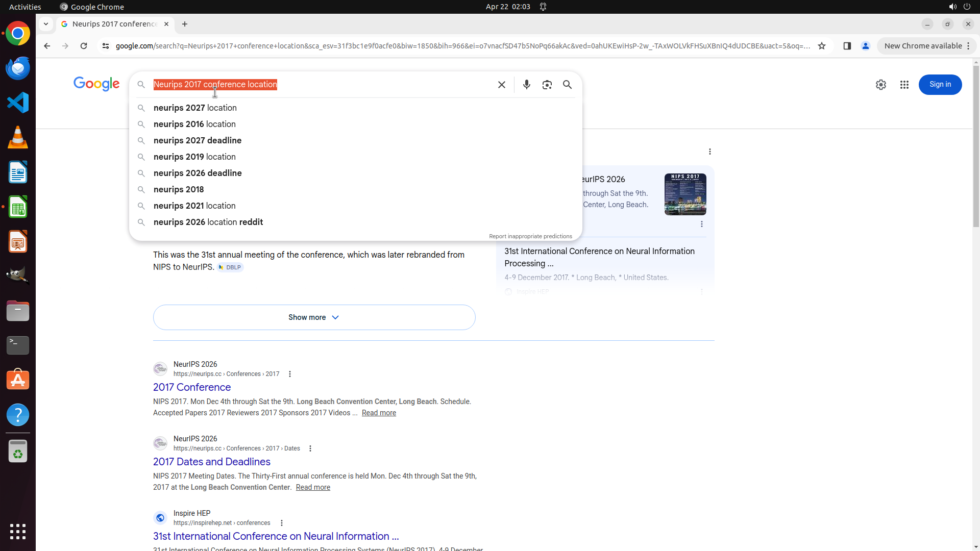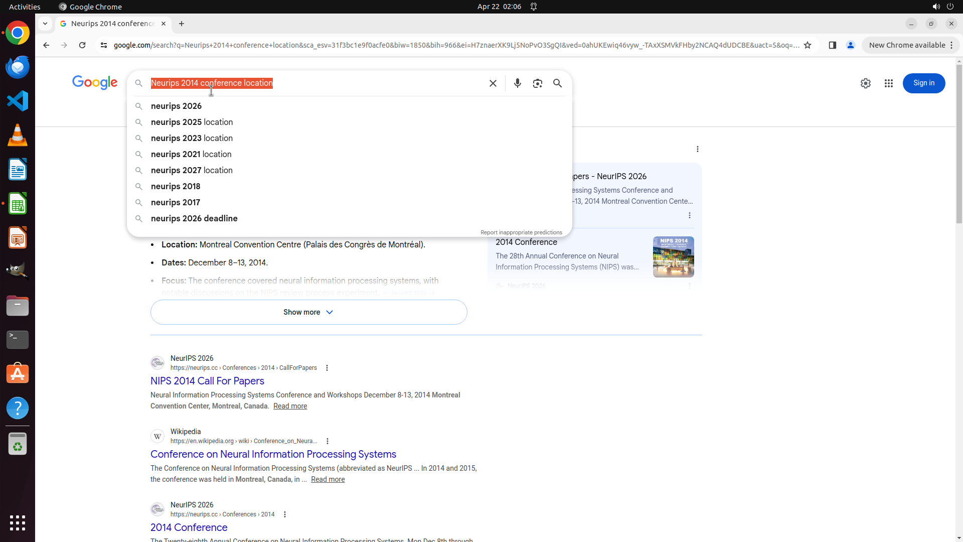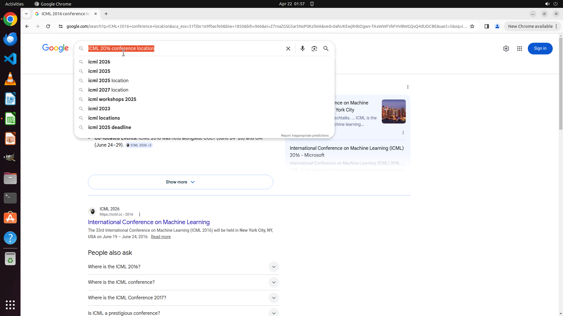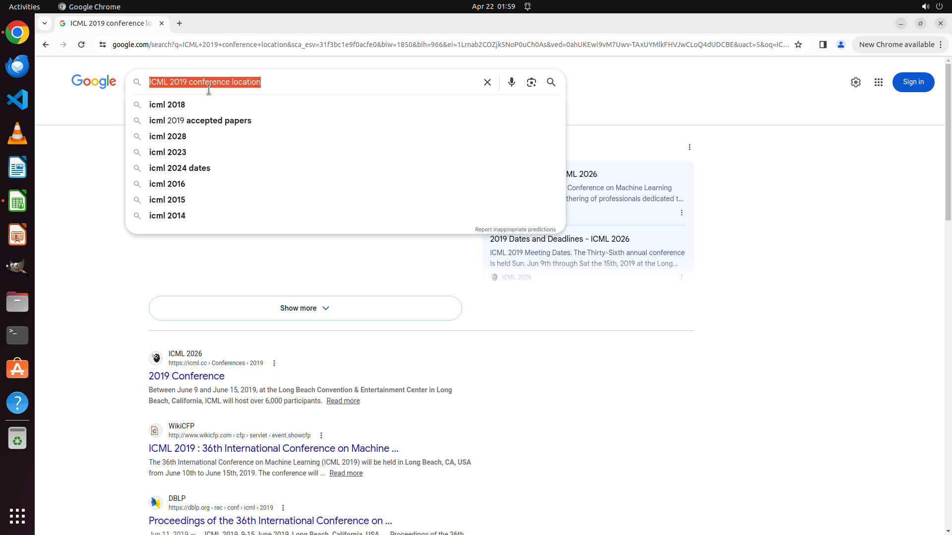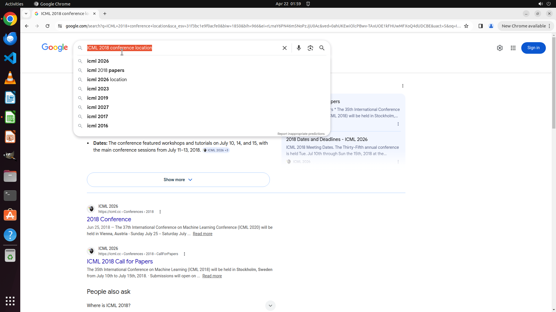 当前LibreOffice Calc已经打开,我需要先打开Chrome浏览器来搜索会议信息。我看到左侧边栏有Chrome图标,可以点击打开。