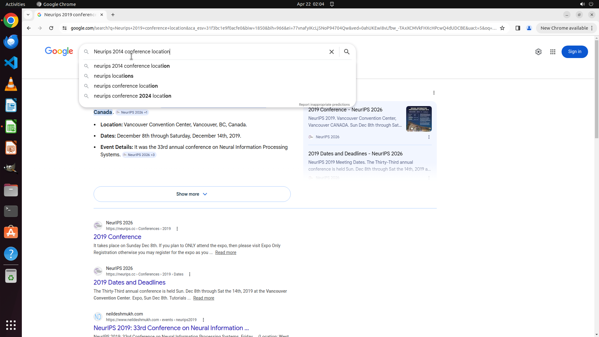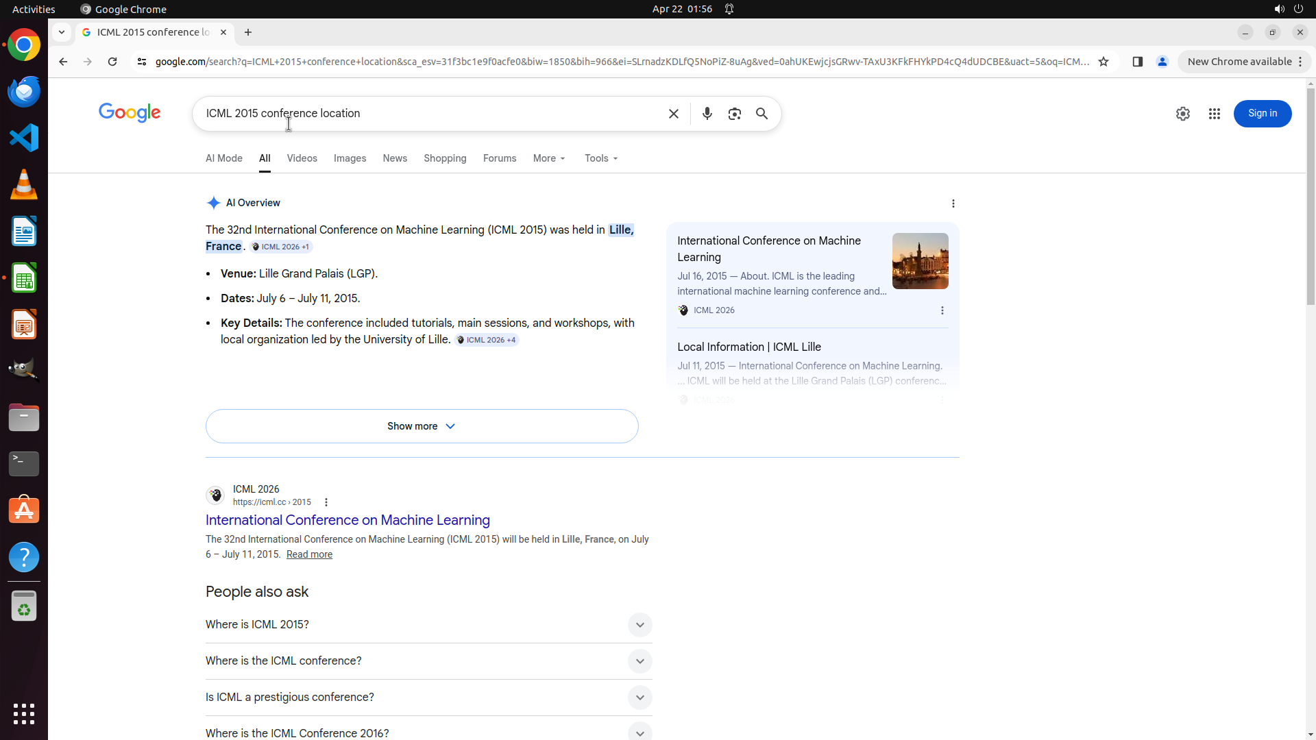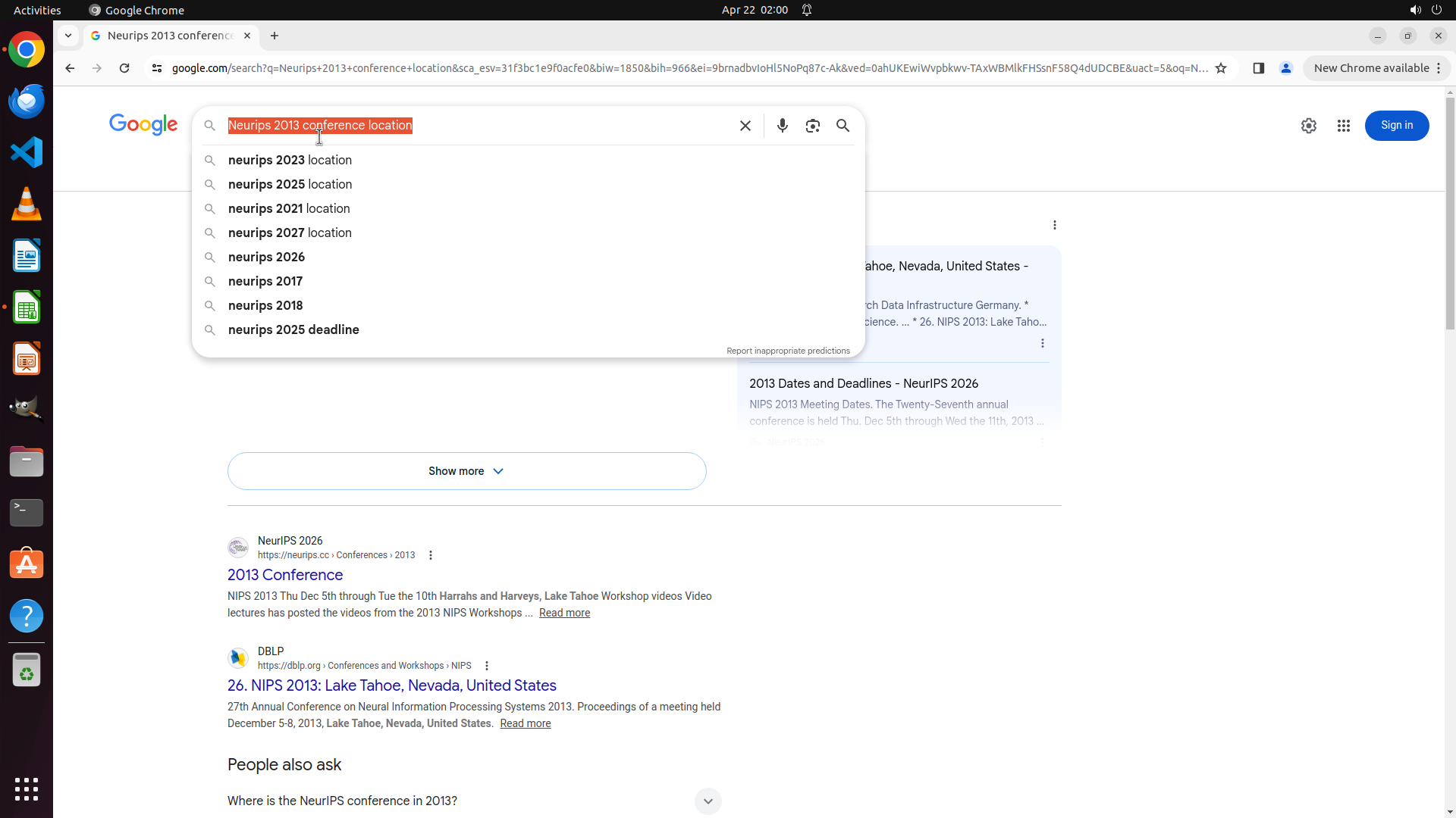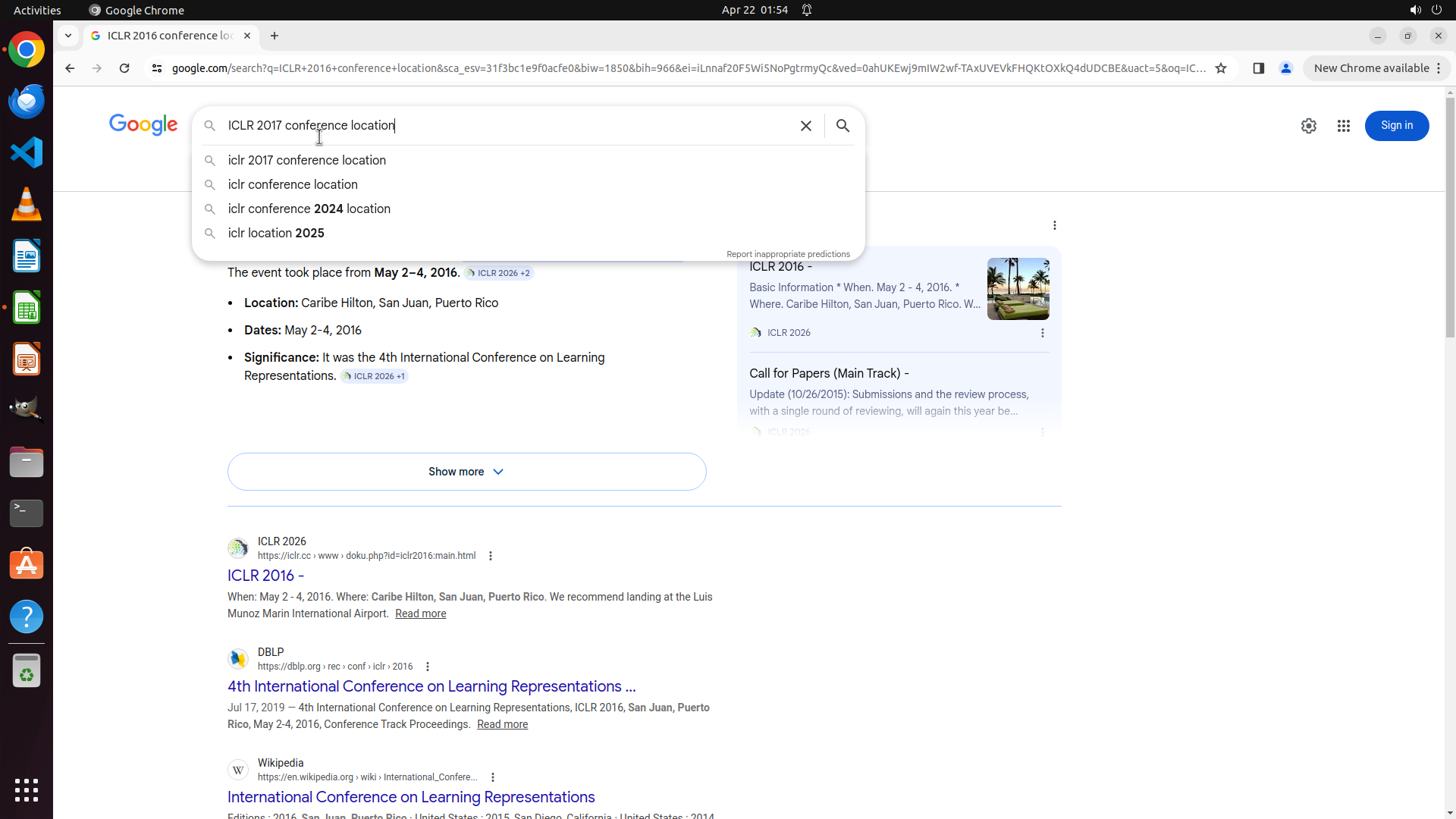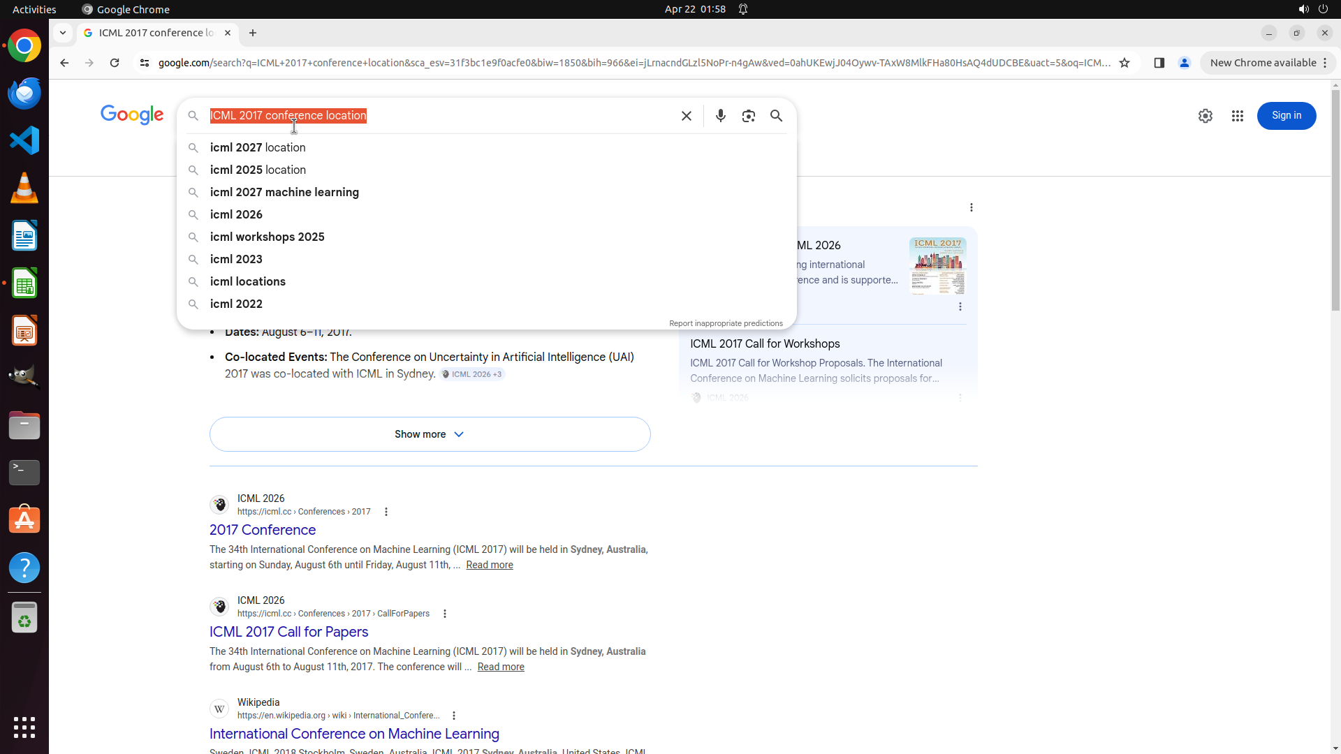 当前LibreOffice Calc已经打开,我需要先打开Chrome浏览器来搜索会议信息。我看到左侧边栏有Chrome图标,可以点击打开。