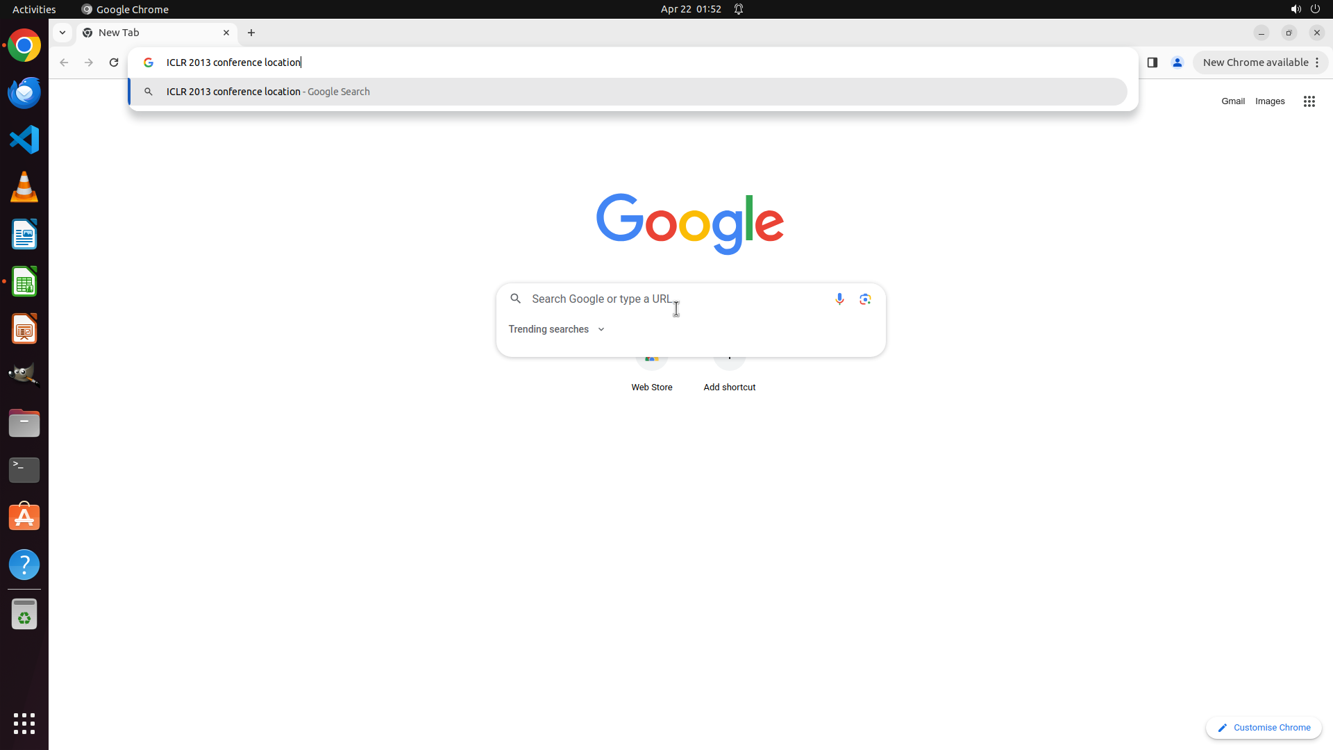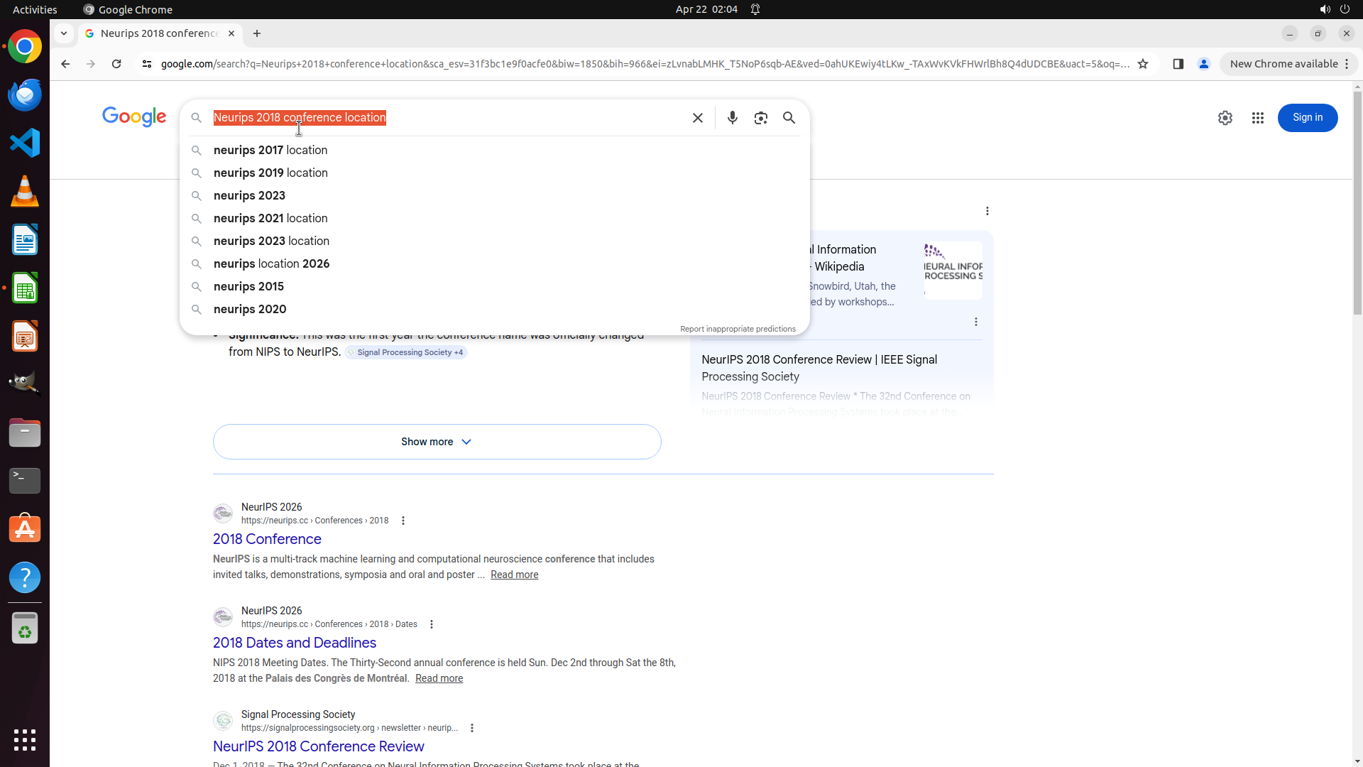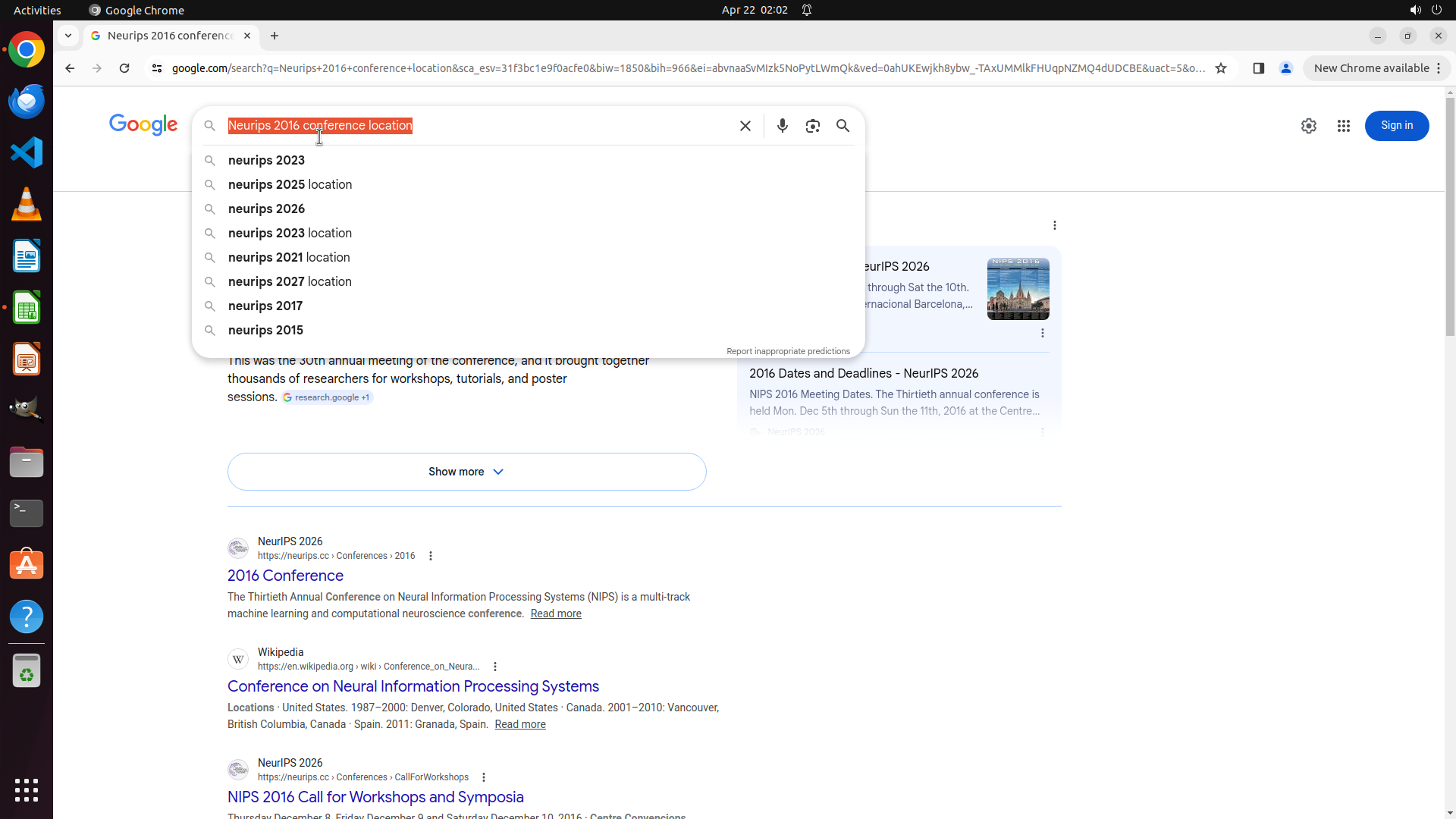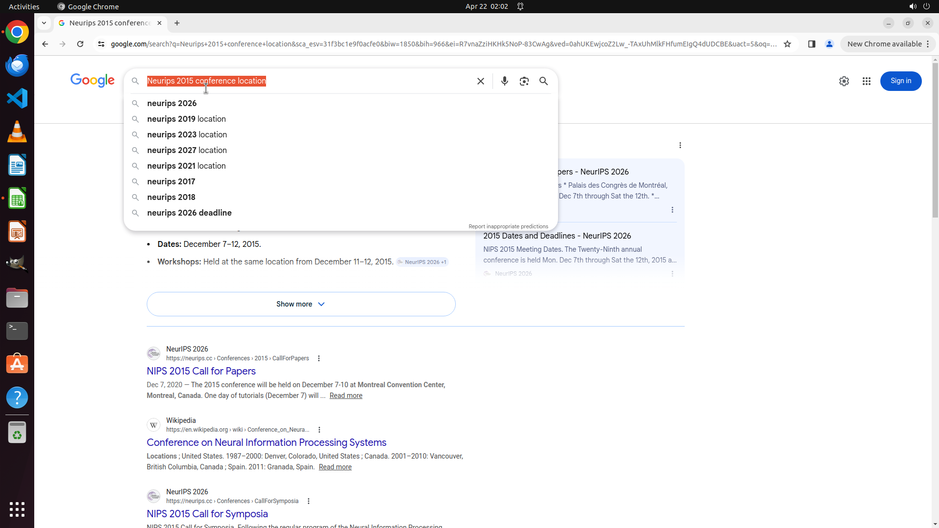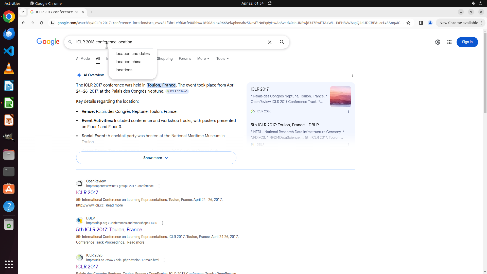 当前LibreOffice Calc已经打开,我需要先打开Chrome浏览器来搜索会议信息。我看到左侧边栏有Chrome图标,可以点击打开。