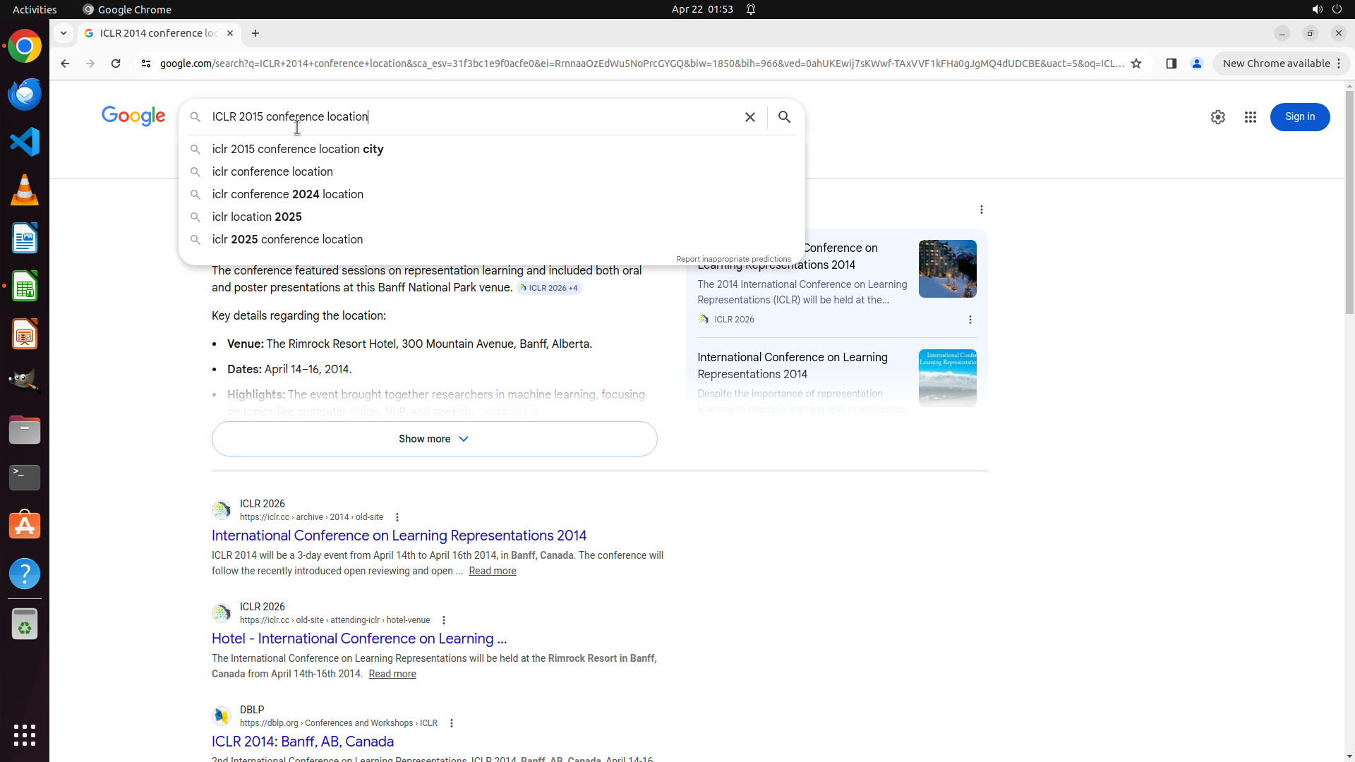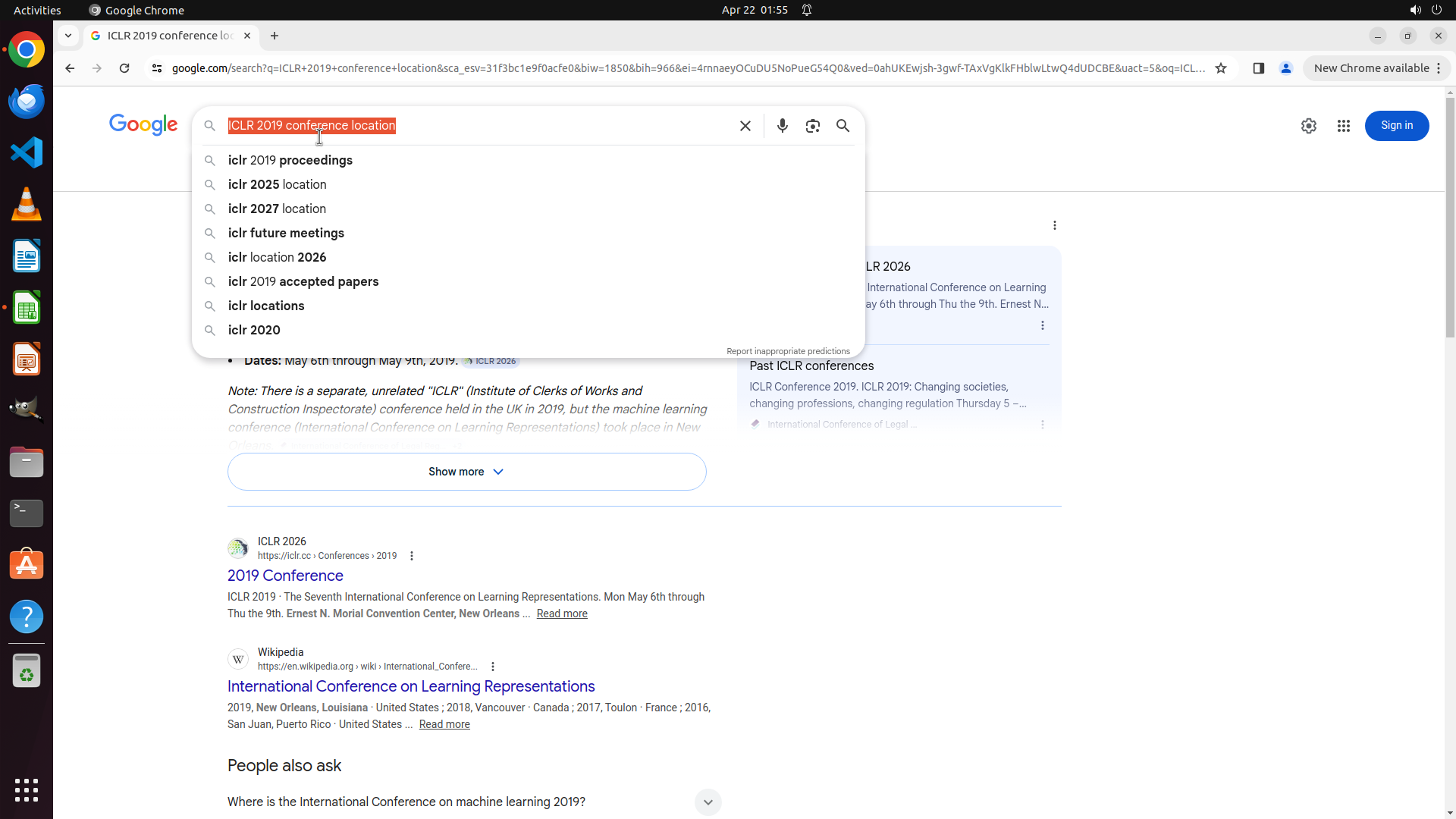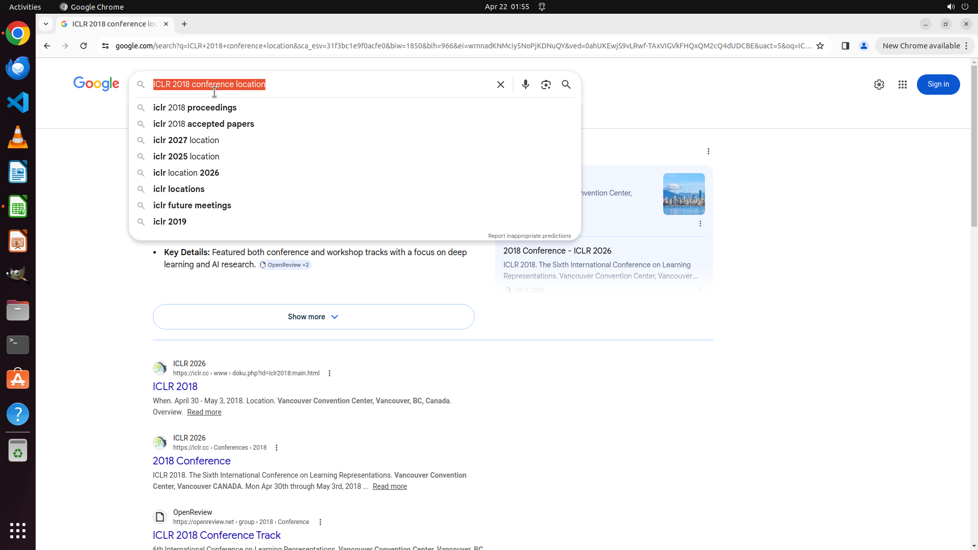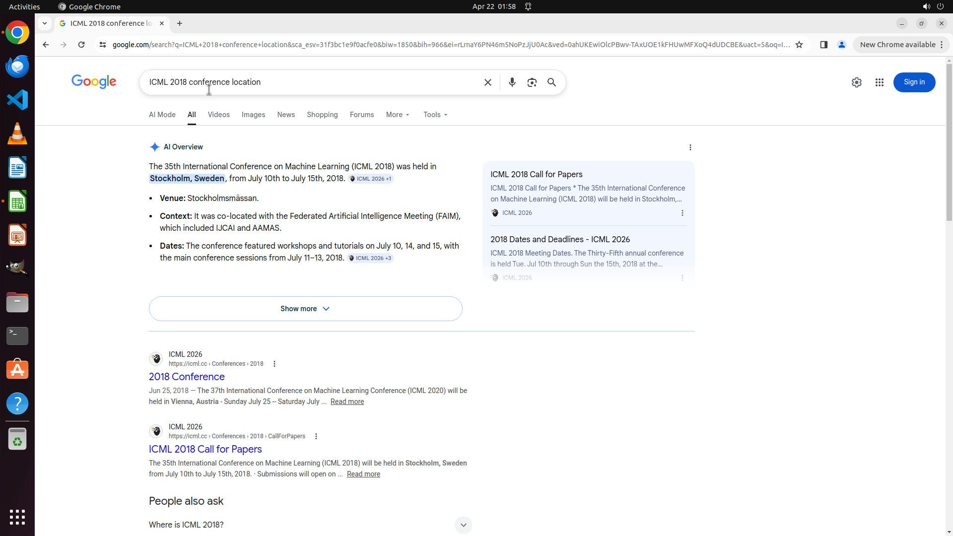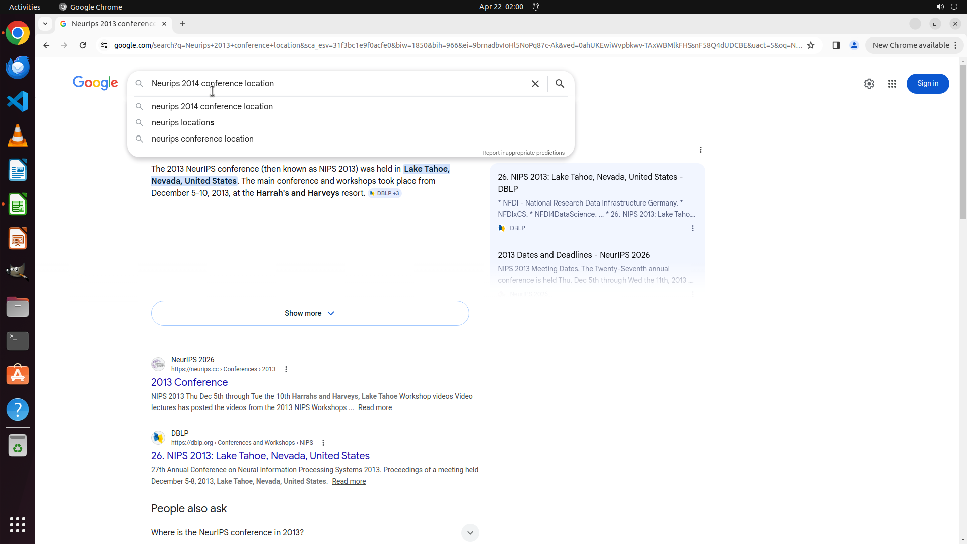 当前LibreOffice Calc已经打开,我需要先打开Chrome浏览器来搜索会议信息。我看到左侧边栏有Chrome图标,可以点击打开。