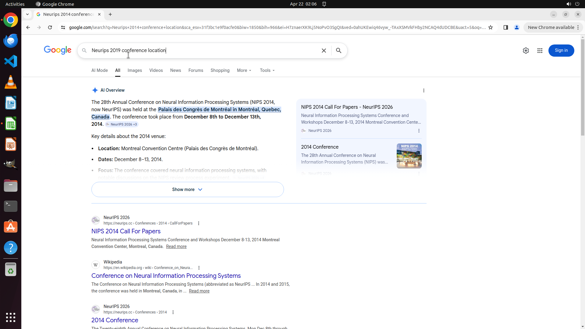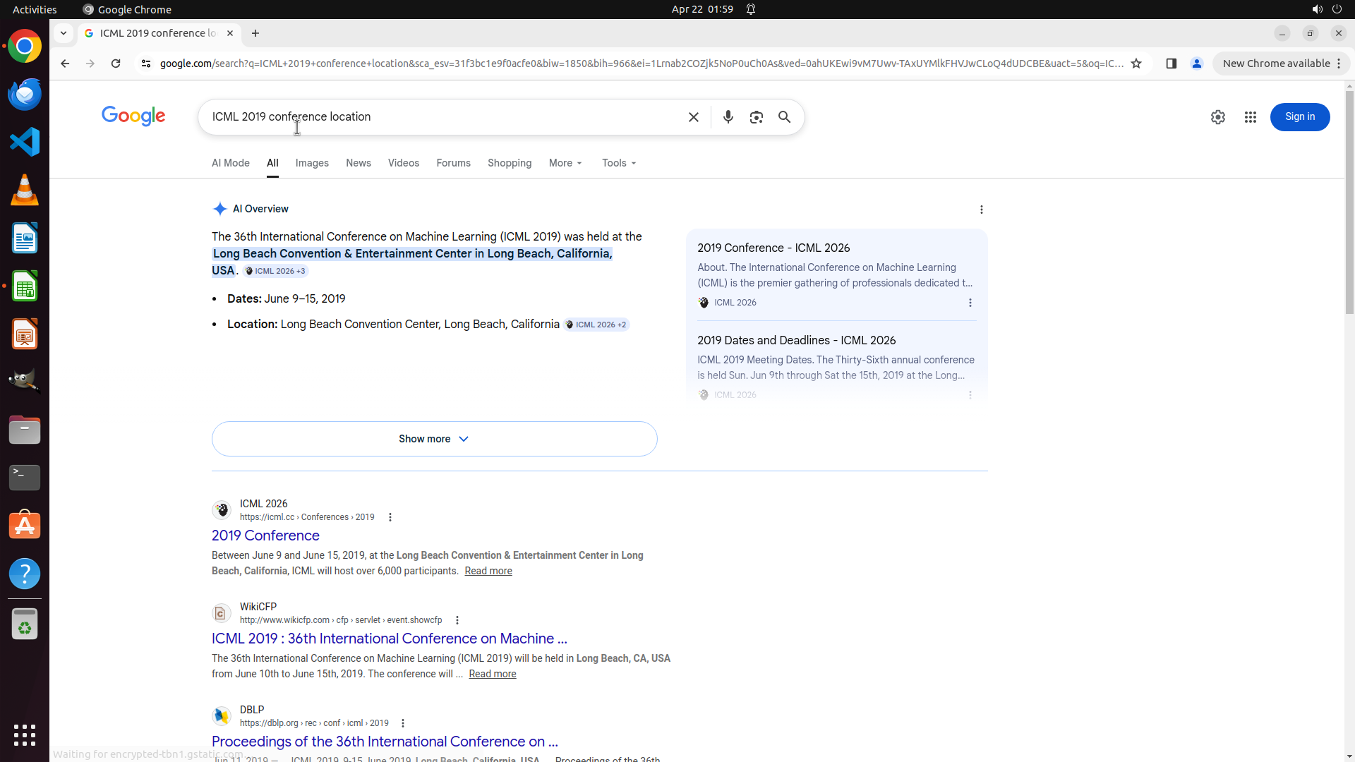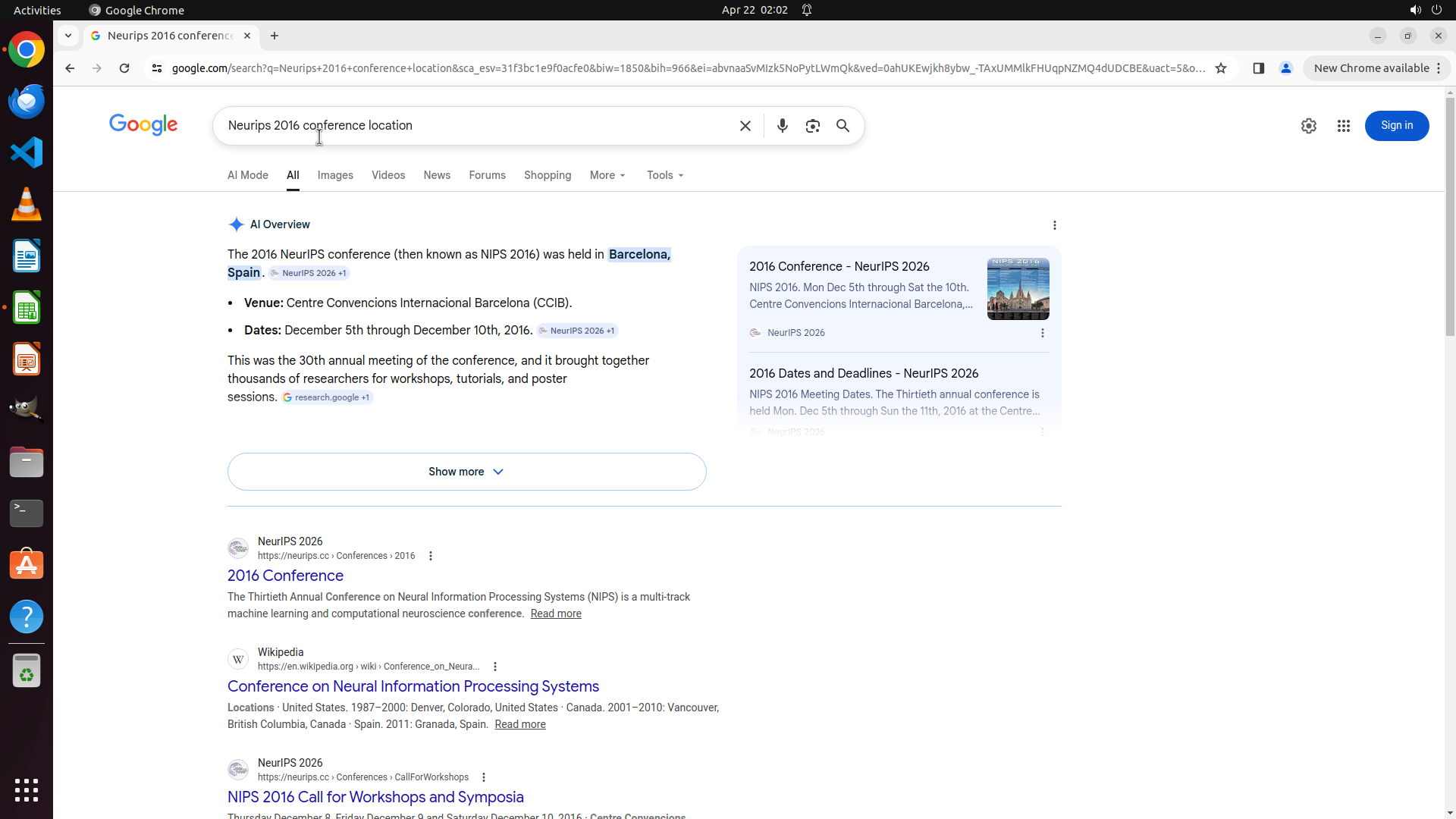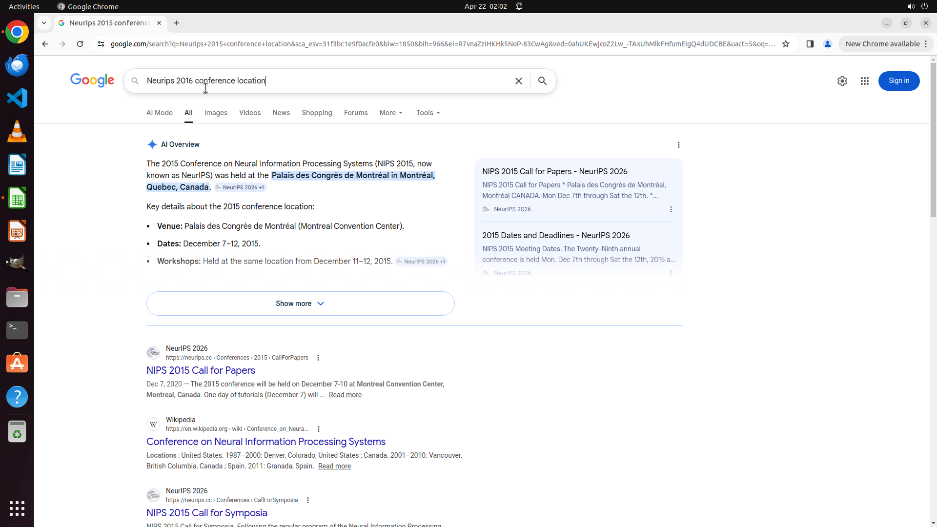 当前LibreOffice Calc已经打开,我需要先打开Chrome浏览器来搜索会议信息。我看到左侧边栏有Chrome图标,可以点击打开。