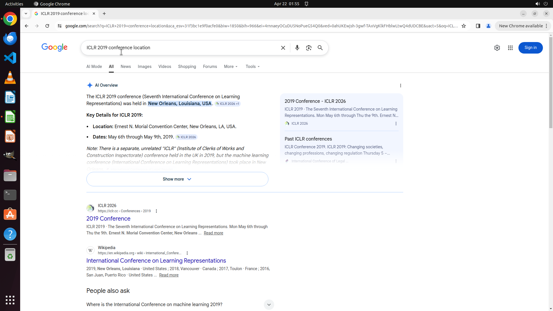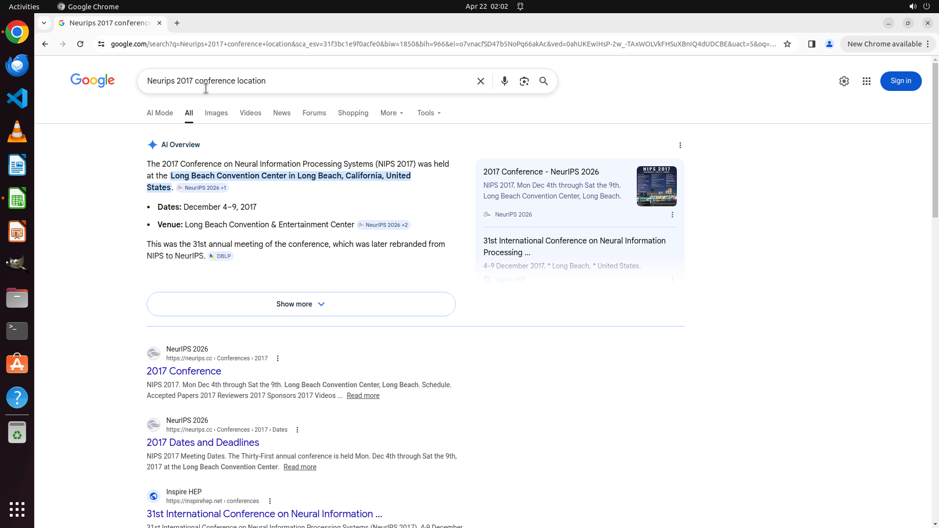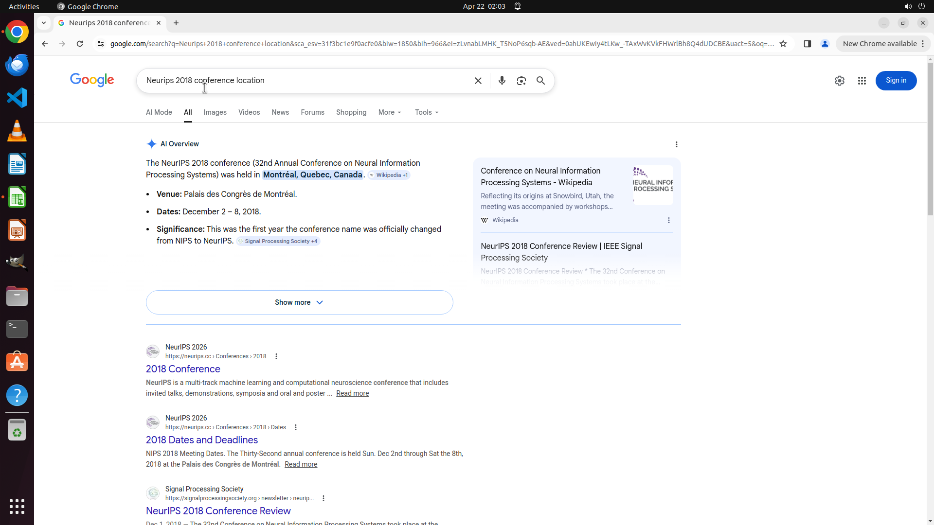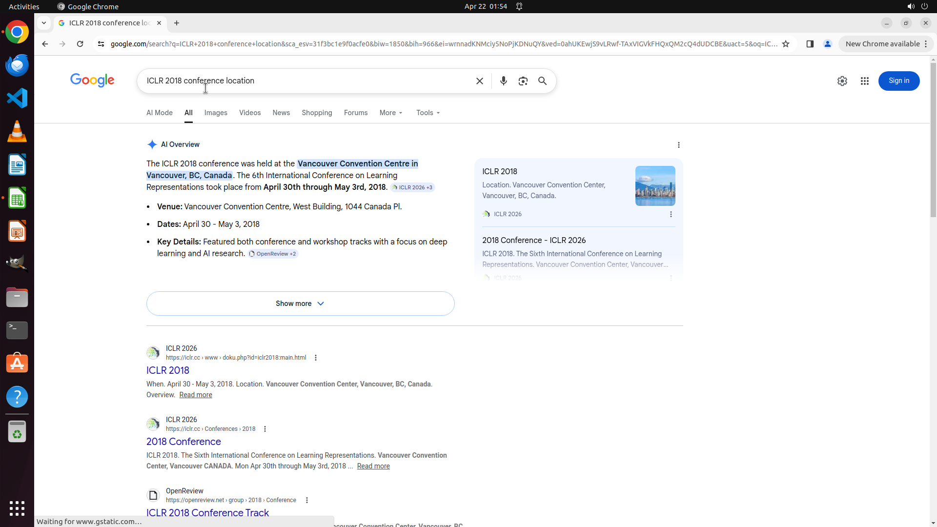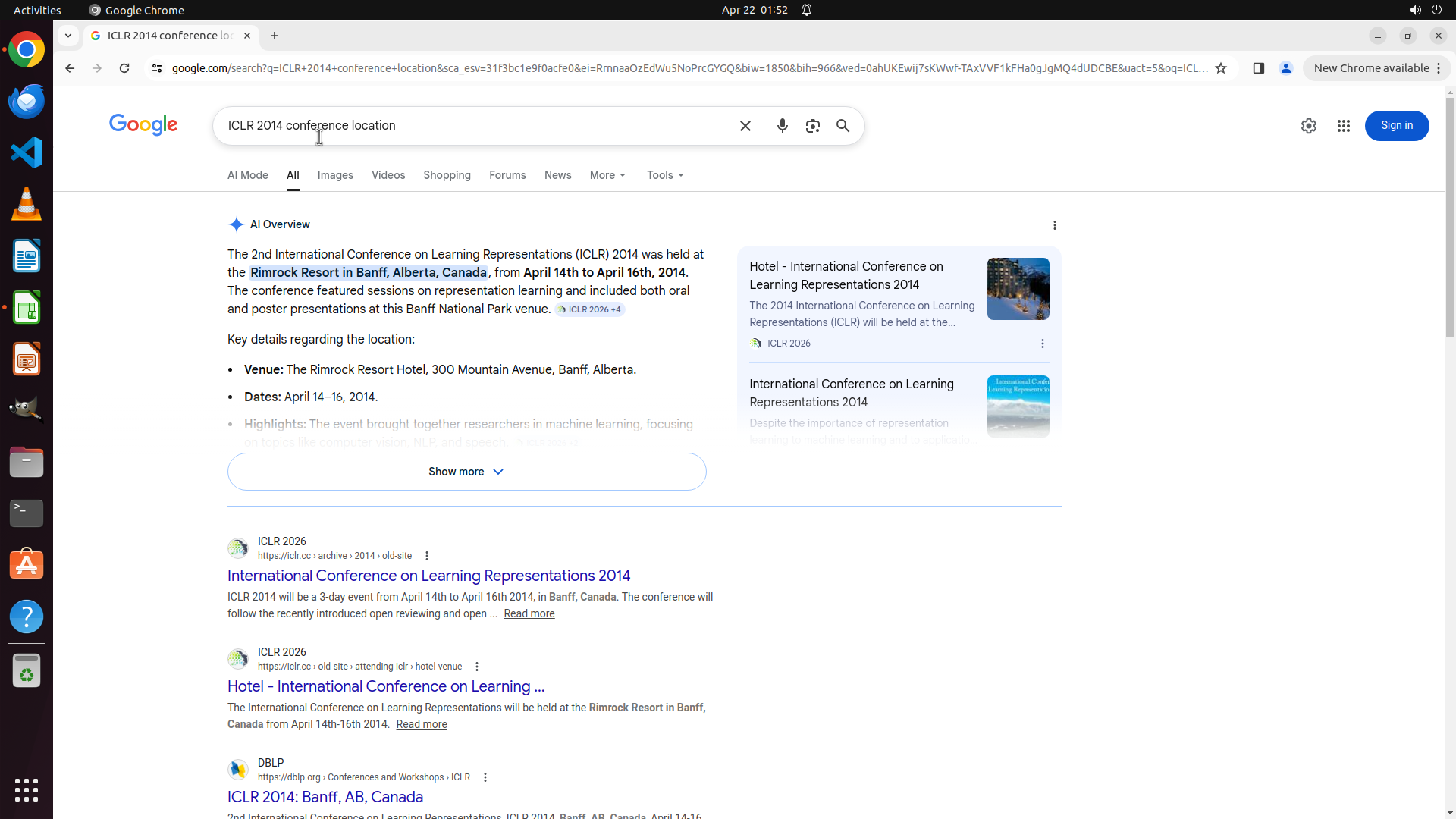 当前LibreOffice Calc已经打开,我需要先打开Chrome浏览器来搜索会议信息。我看到左侧边栏有Chrome图标,可以点击打开。