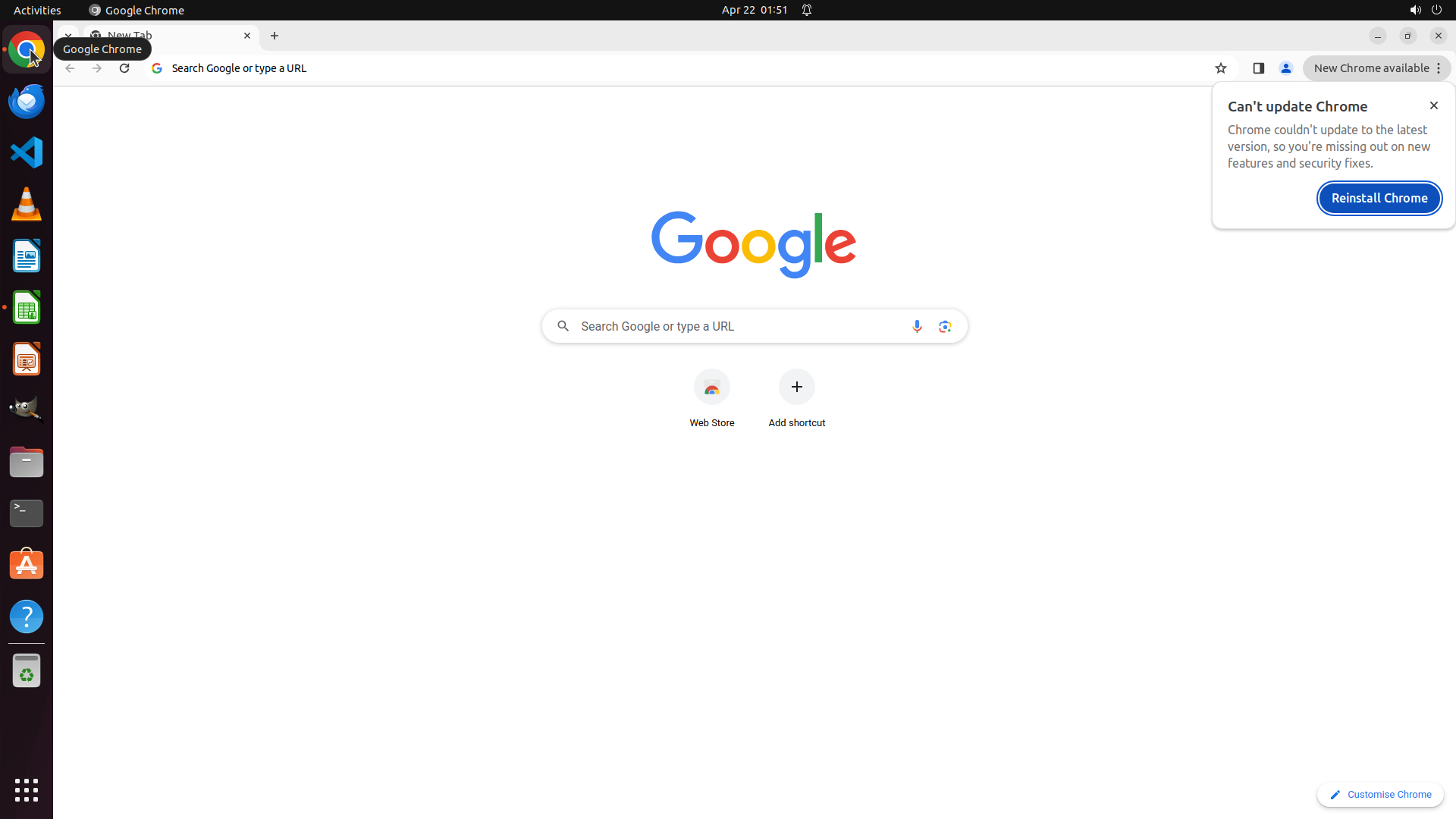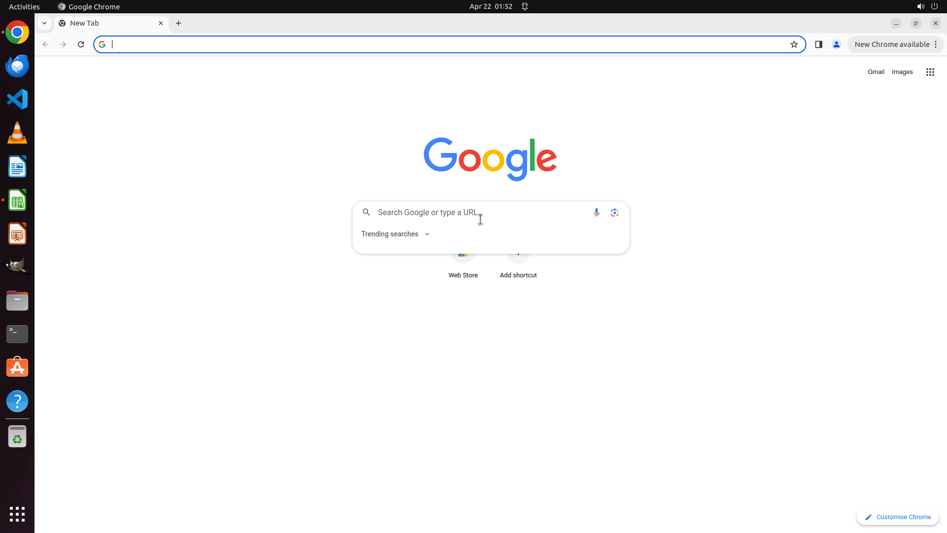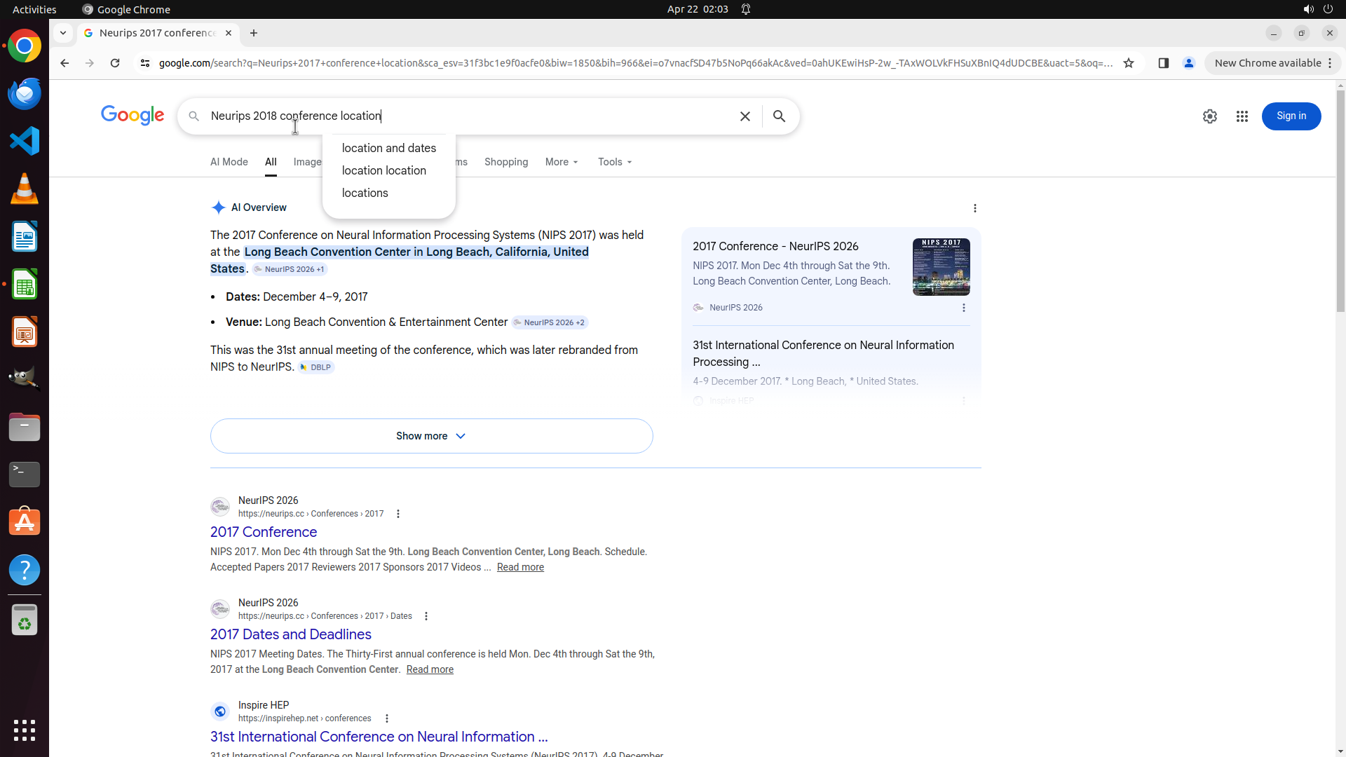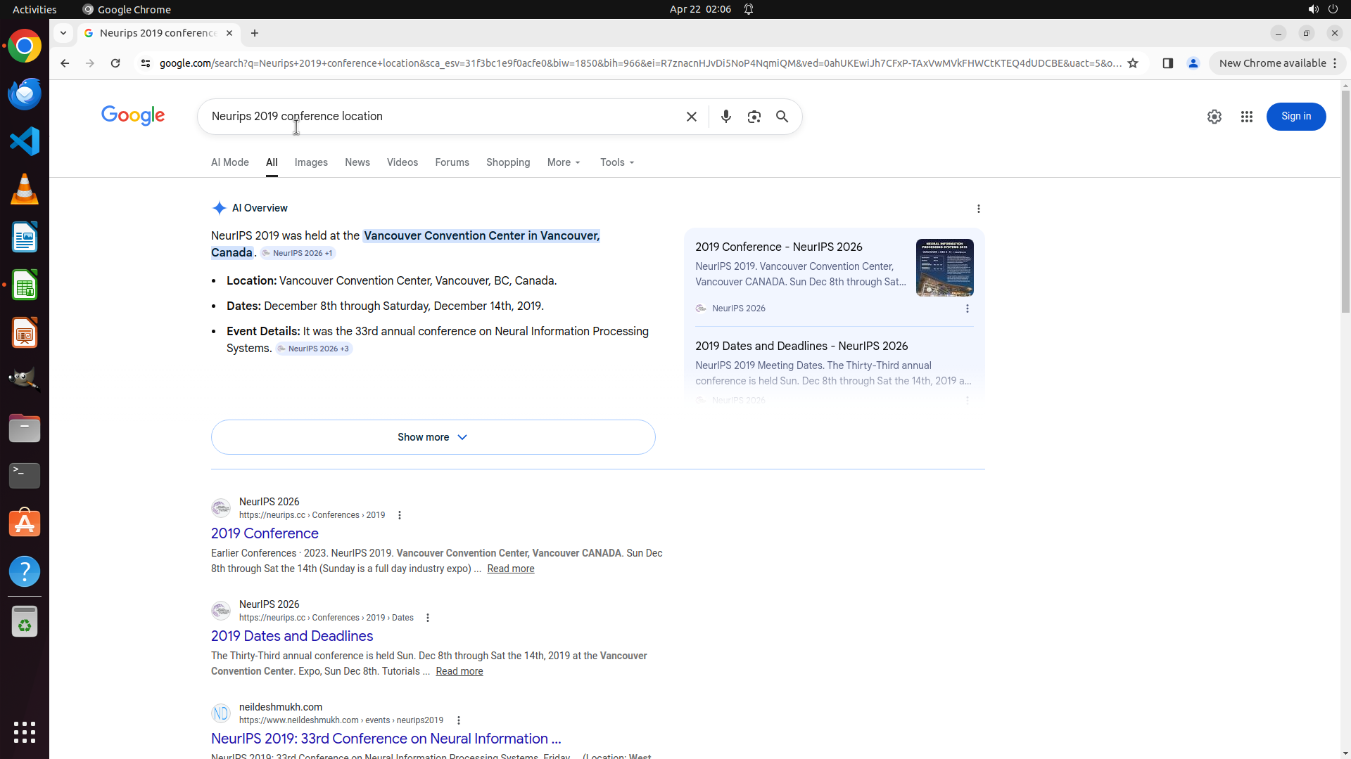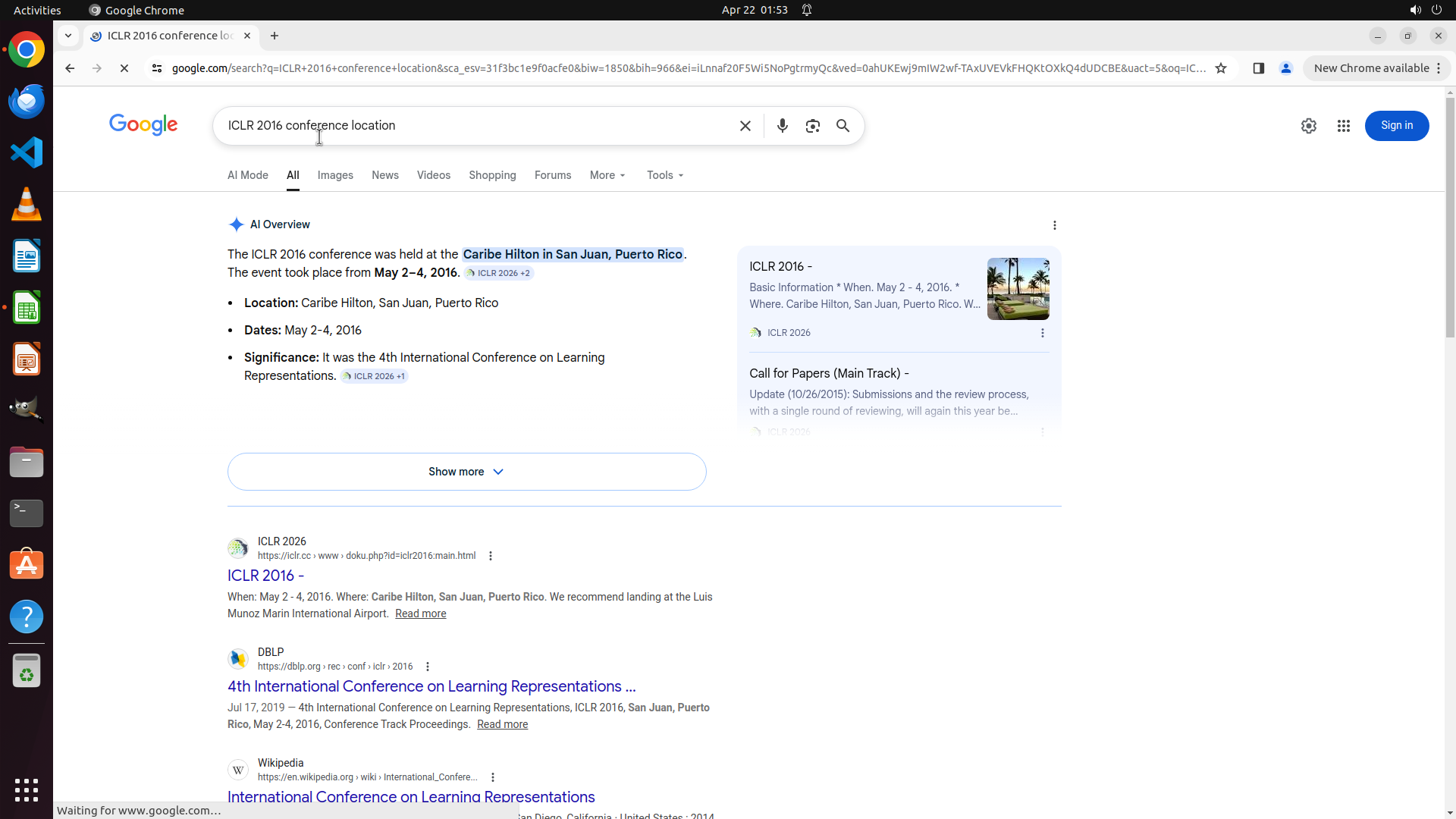 当前LibreOffice Calc已经打开,我需要先打开Chrome浏览器来搜索会议信息。我看到左侧边栏有Chrome图标,可以点击打开。
