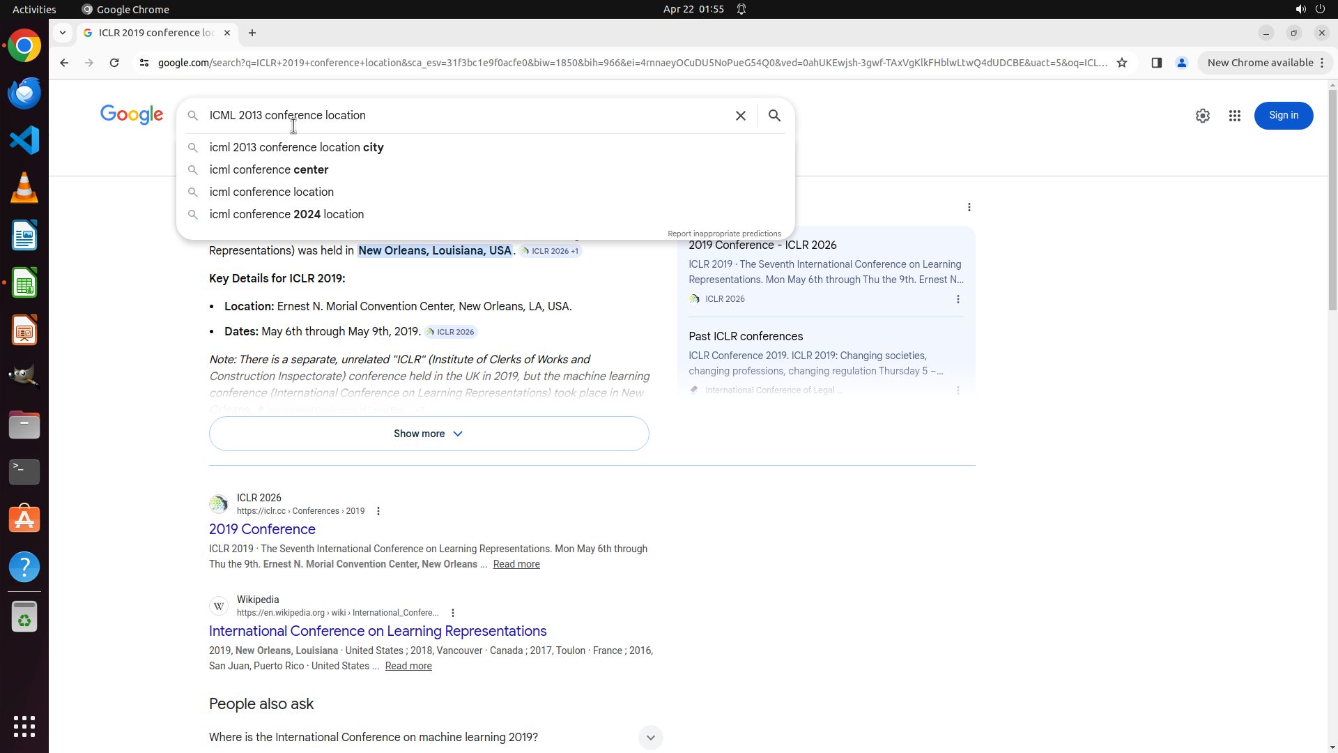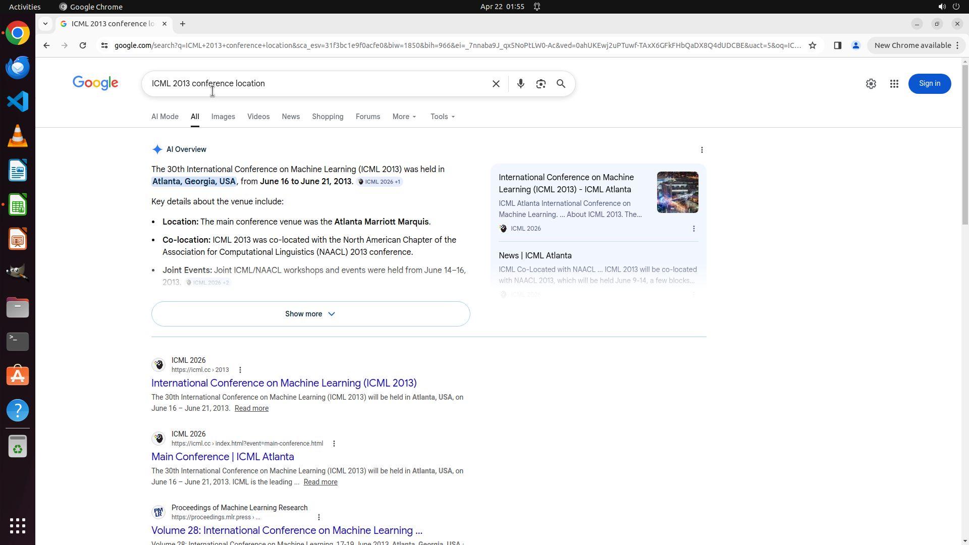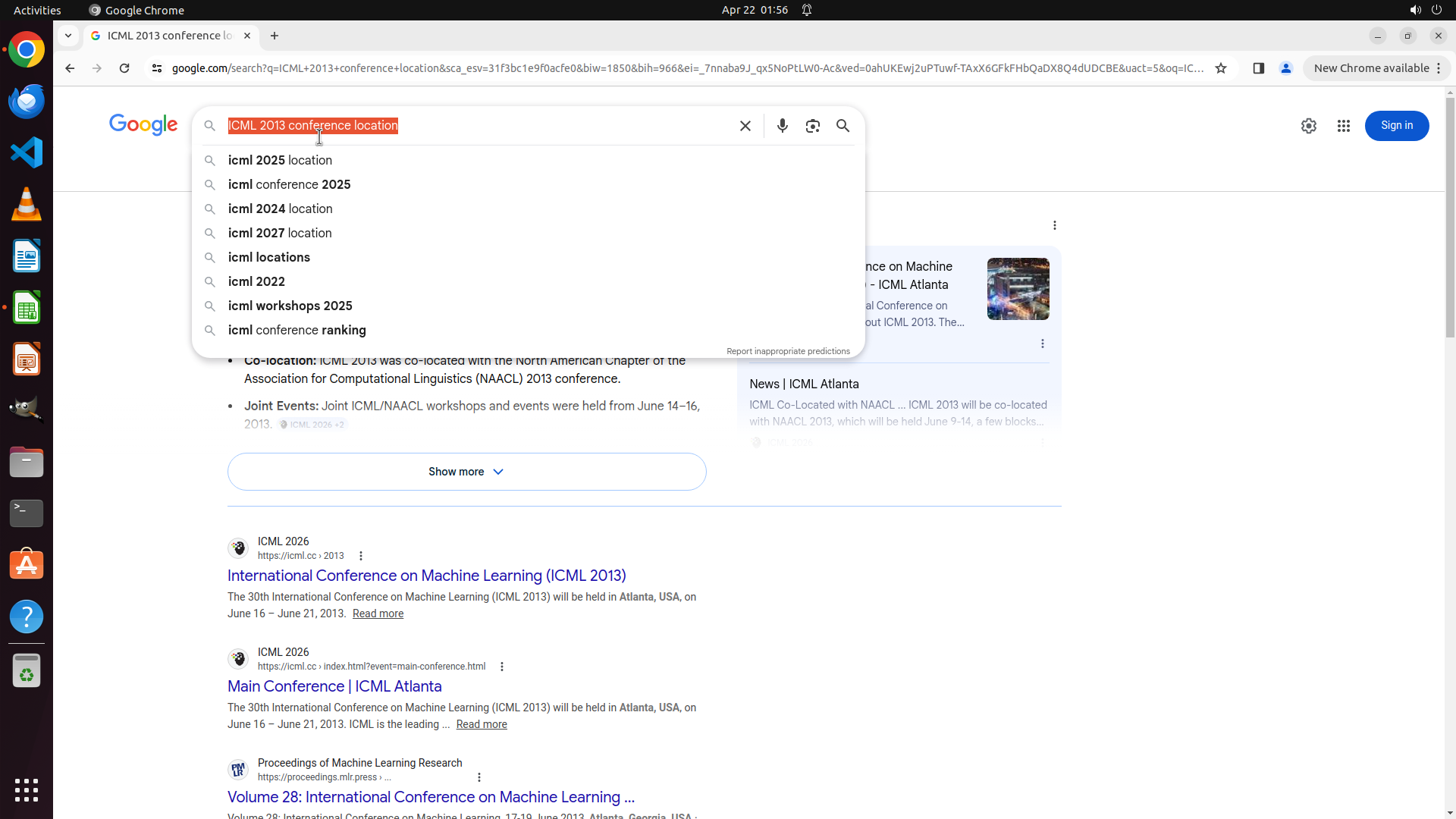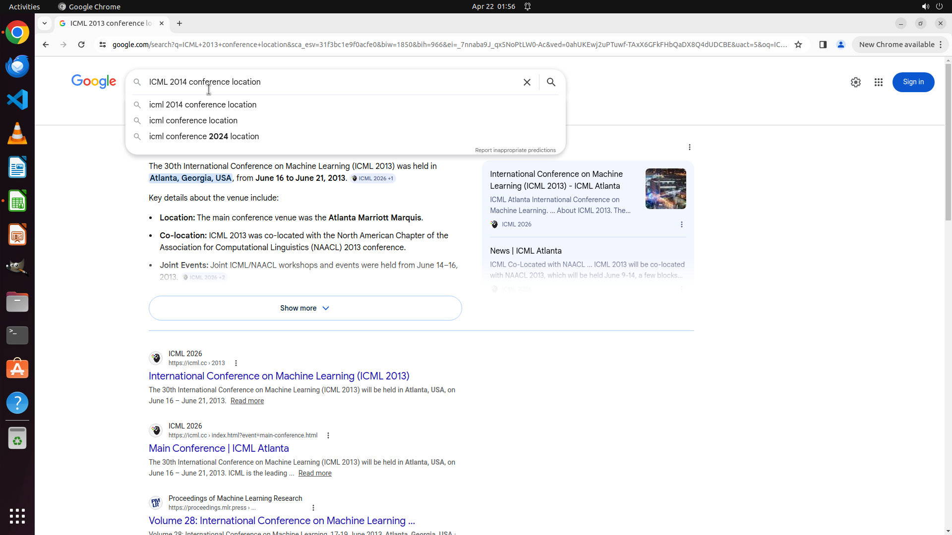 当前屏幕显示Google搜索结果,搜索查询为"ICML 2013 conference location"。