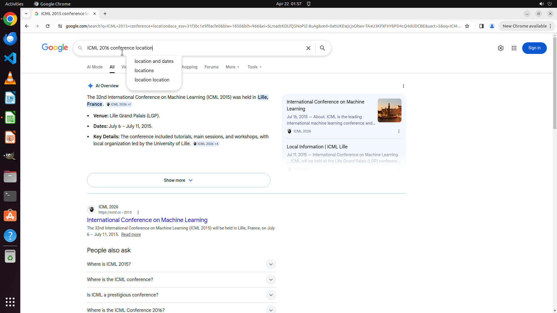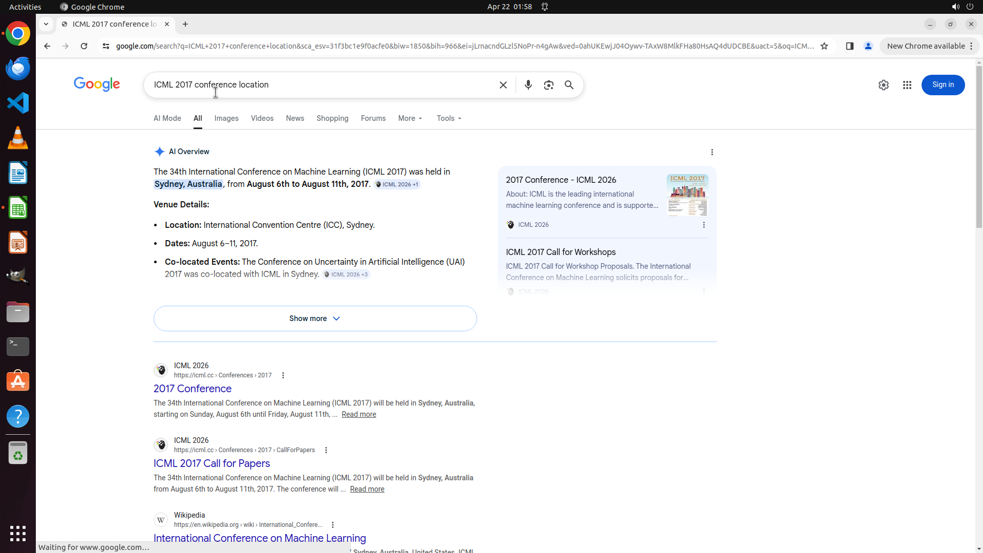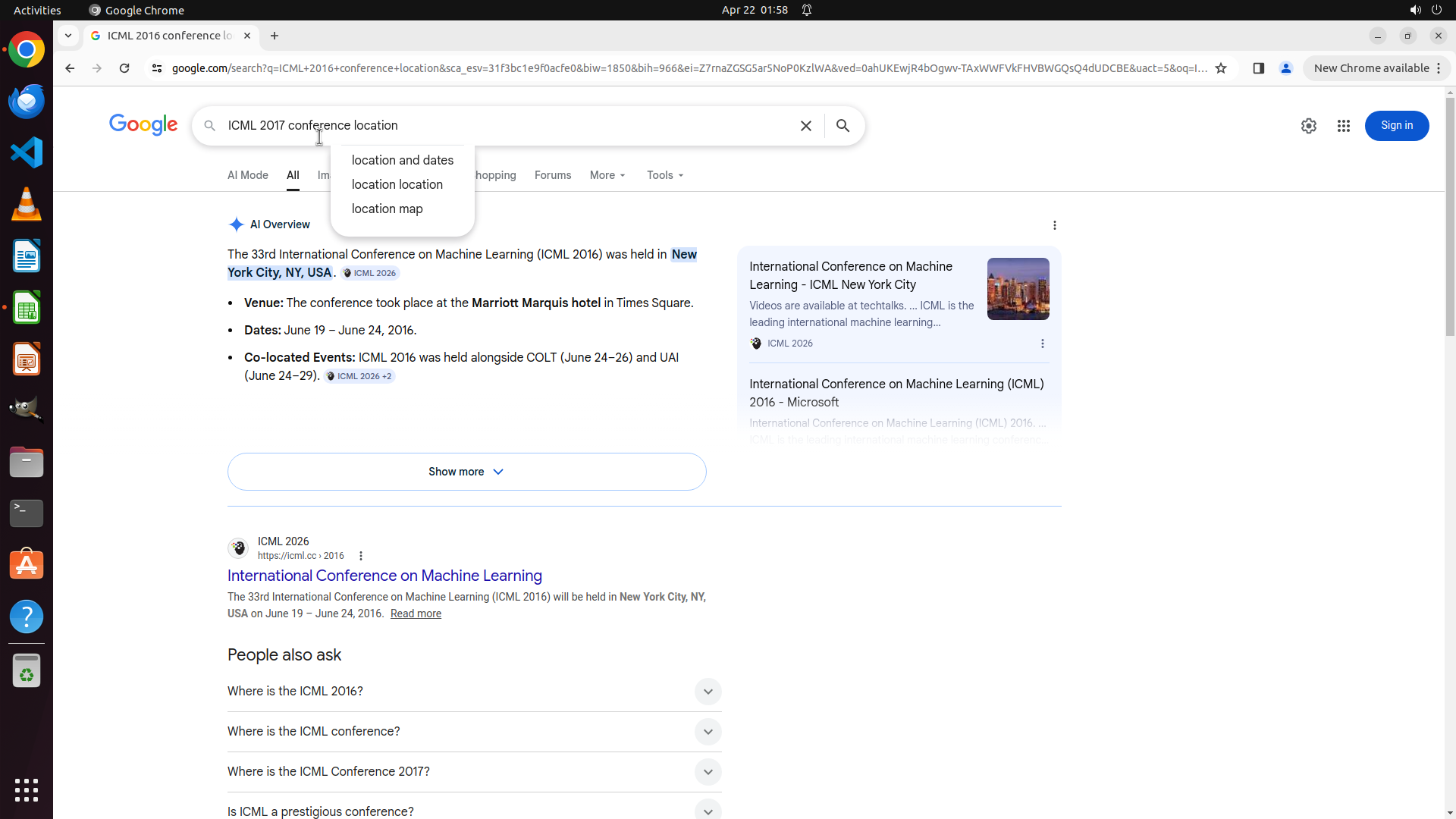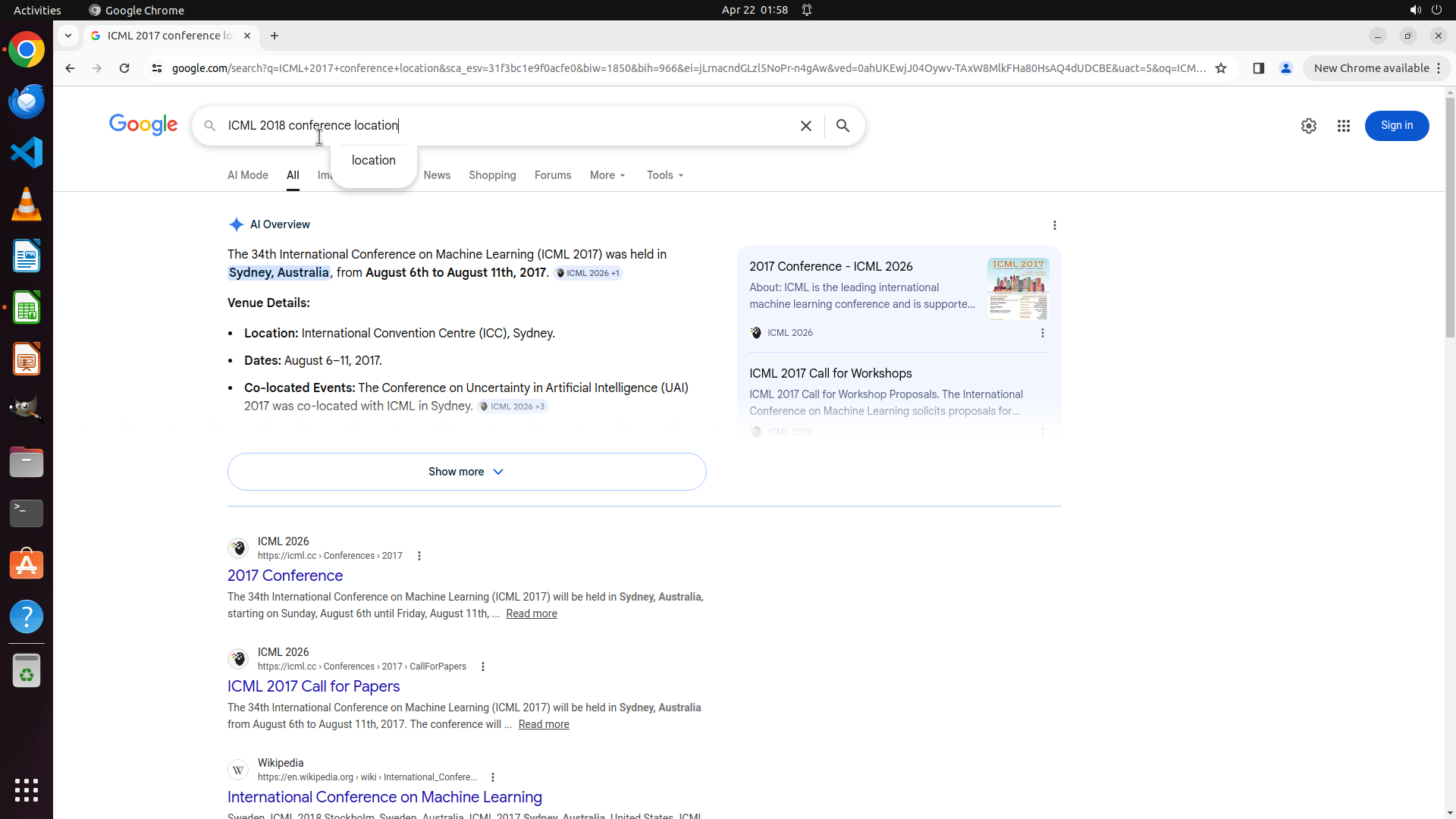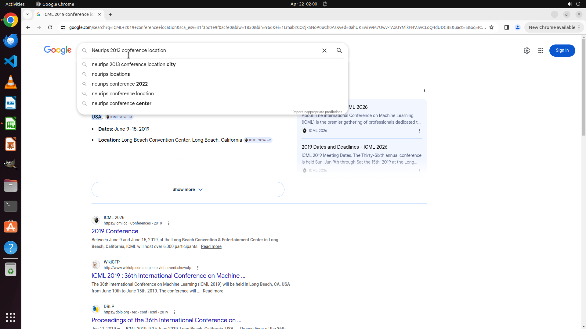 当前屏幕显示Google搜索结果,搜索查询为"ICML 2013 conference location"。