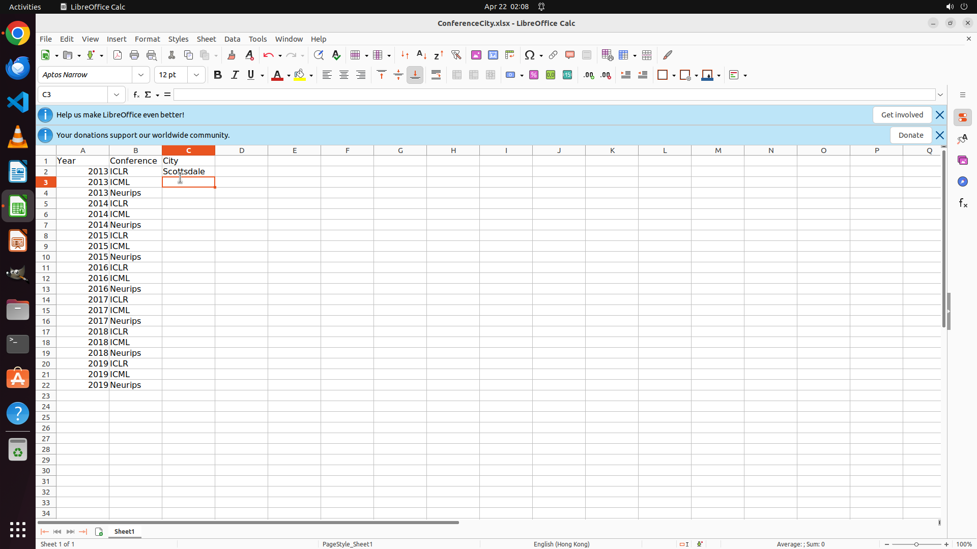 当前LibreOffice Calc中ConferenceCity.xlsx文件已打开,C2单元格已成功填入"Scottsdale"(2013年ICLR会议城市)。根据截图,光标现在位于C3单元格(单元格引用框显示"C3"),准备输入2013年ICML的举办城市。