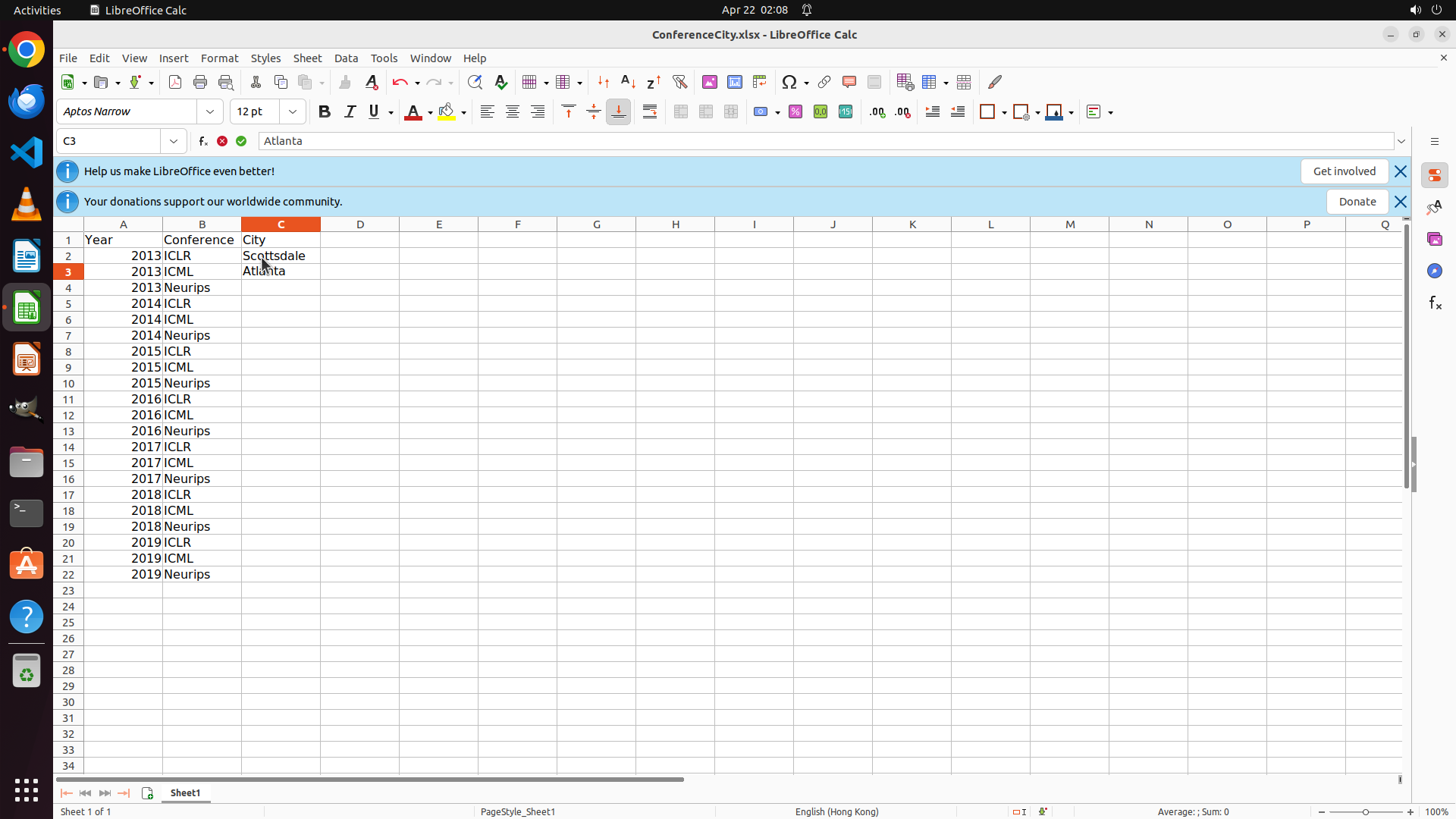 当前LibreOffice Calc中ConferenceCity.xlsx文件已打开,C2单元格显示"Scottsdale"(已填充),C3单元格显示"Atlanta"(刚输入完成,在公式栏和单元格中均可见)。光标当前位于C3单元格。