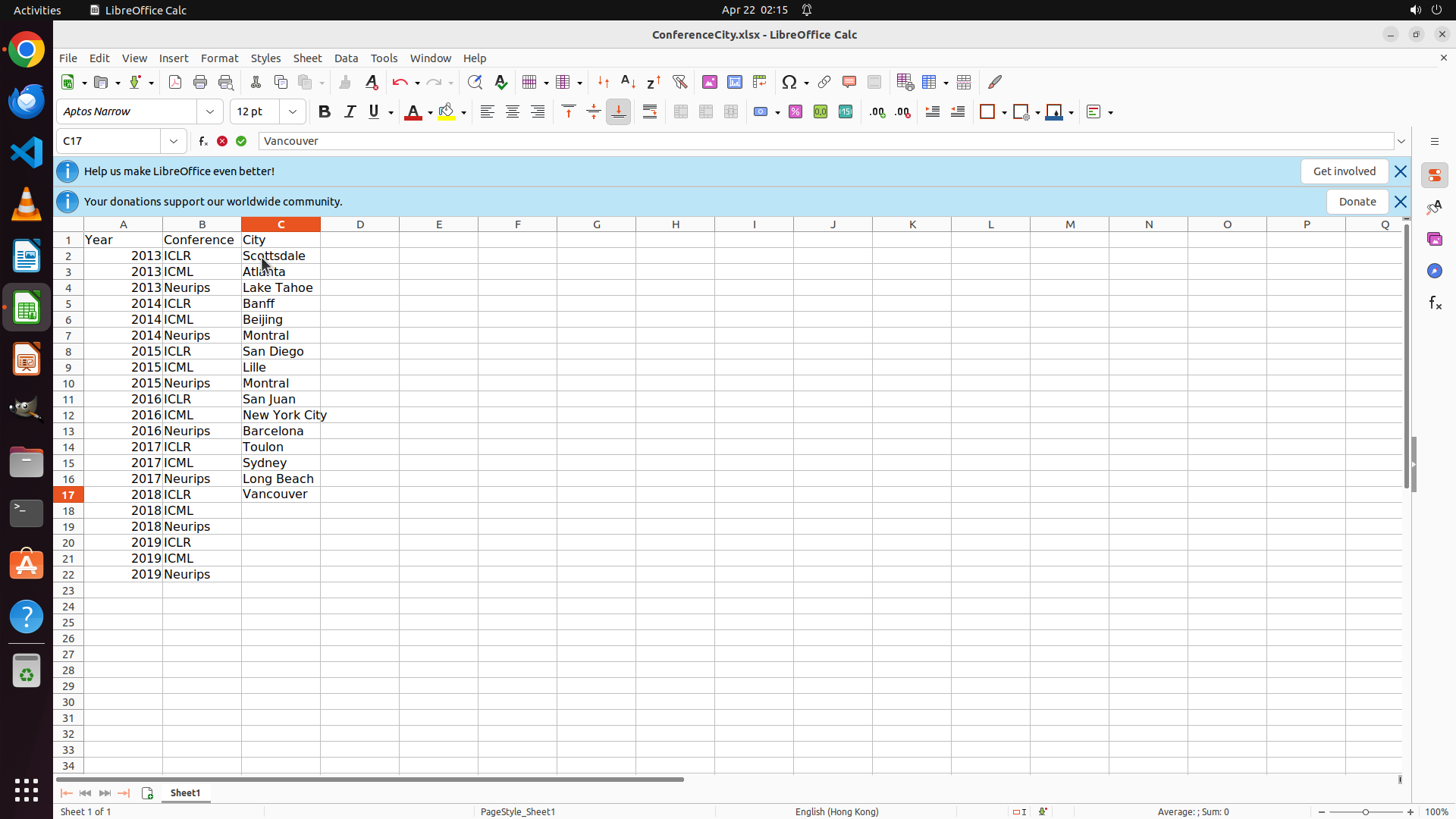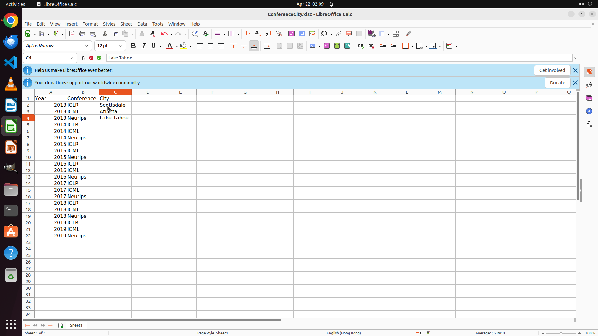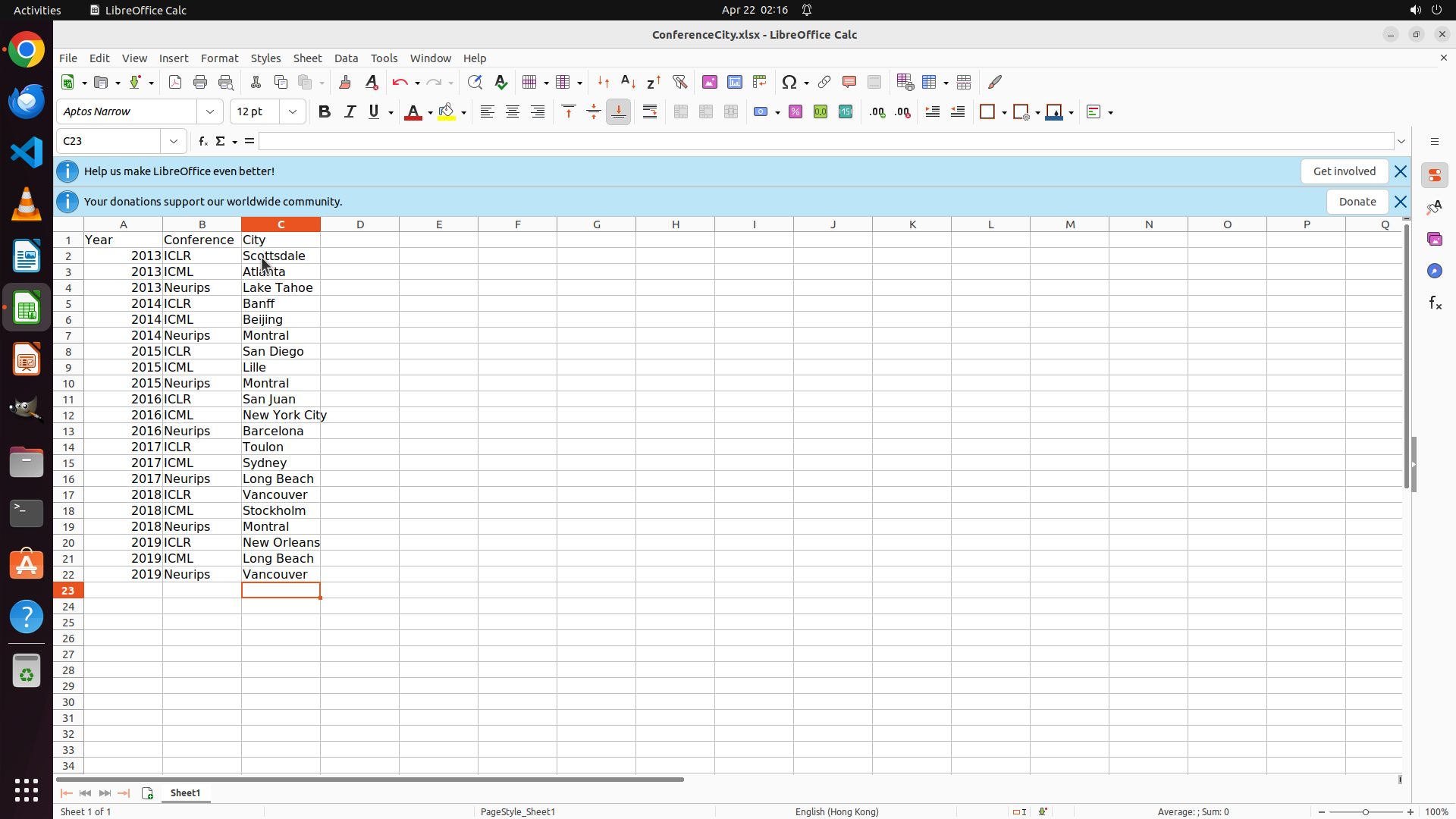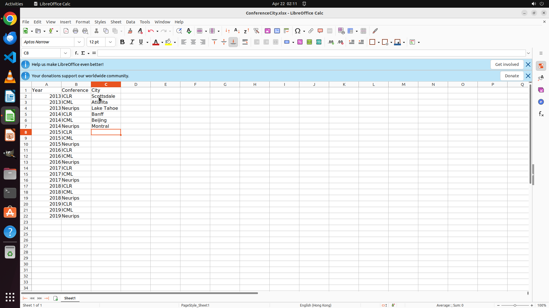 当前LibreOffice Calc中ConferenceCity.xlsx文件已打开,可以看到: