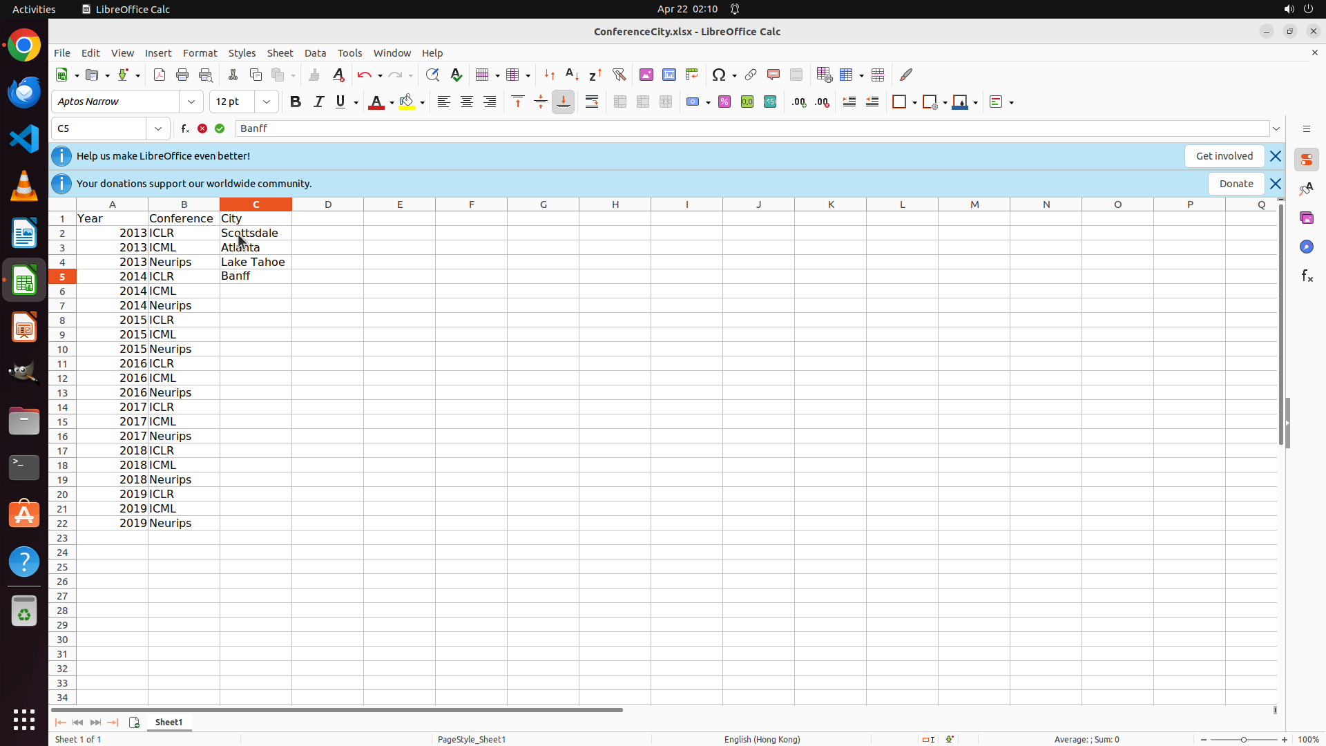 LibreOffice Calc中ConferenceCity.xlsx文件已打开,显示: