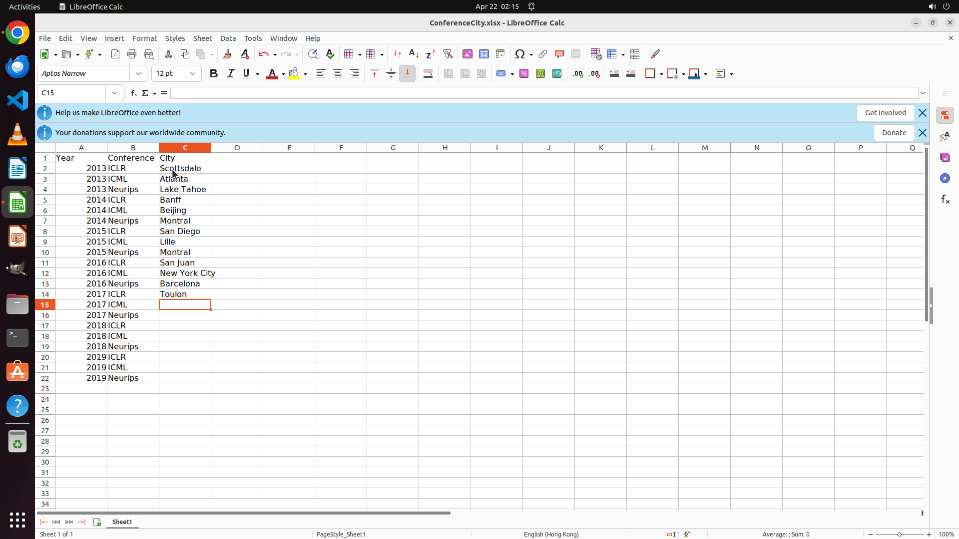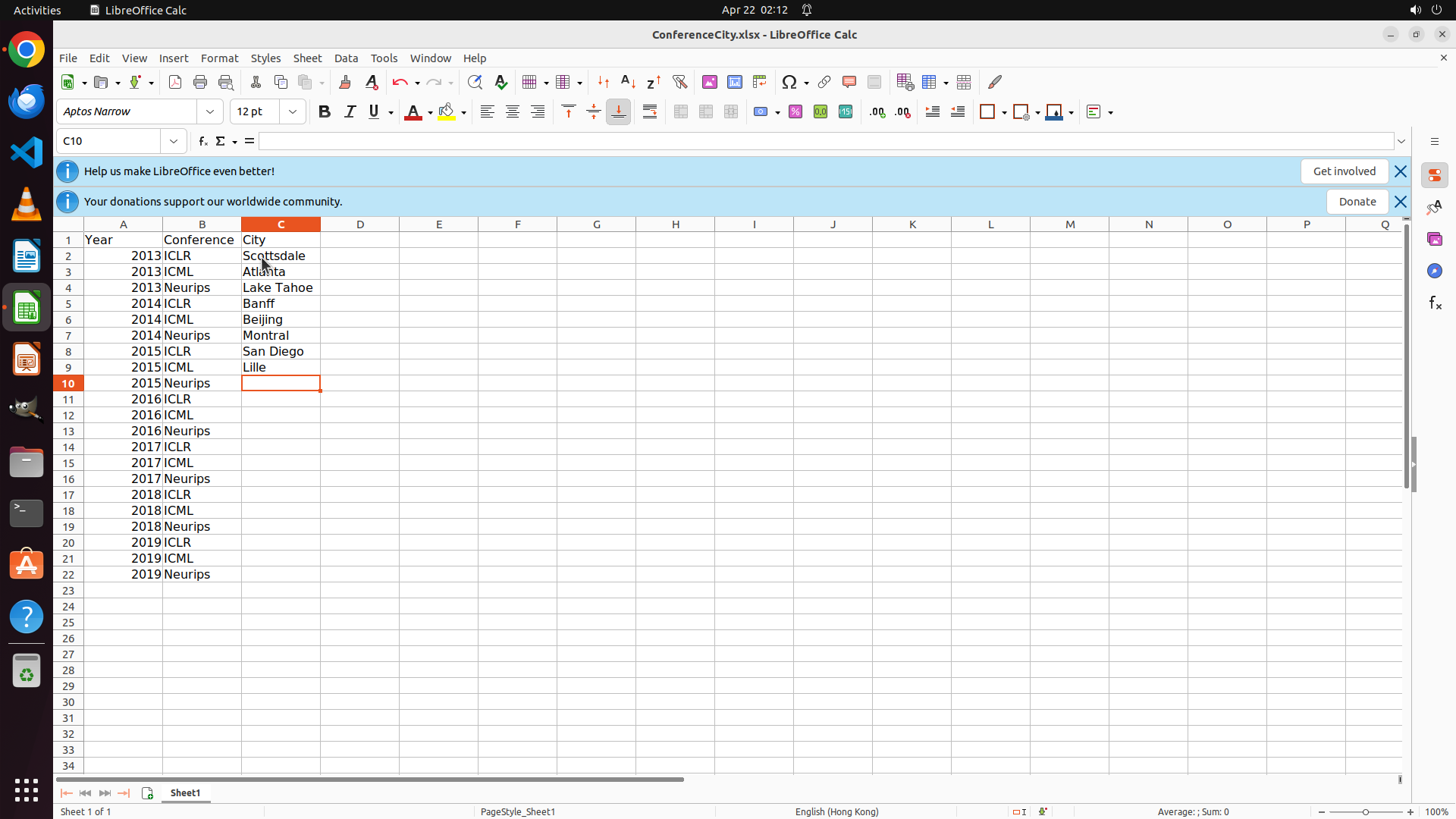 当前LibreOffice Calc中ConferenceCity.xlsx文件已打开,C10单元格(2015 Neurips)当前选中的公式栏显示"Lille",但这是错误的。根据之前搜索收集的数据: