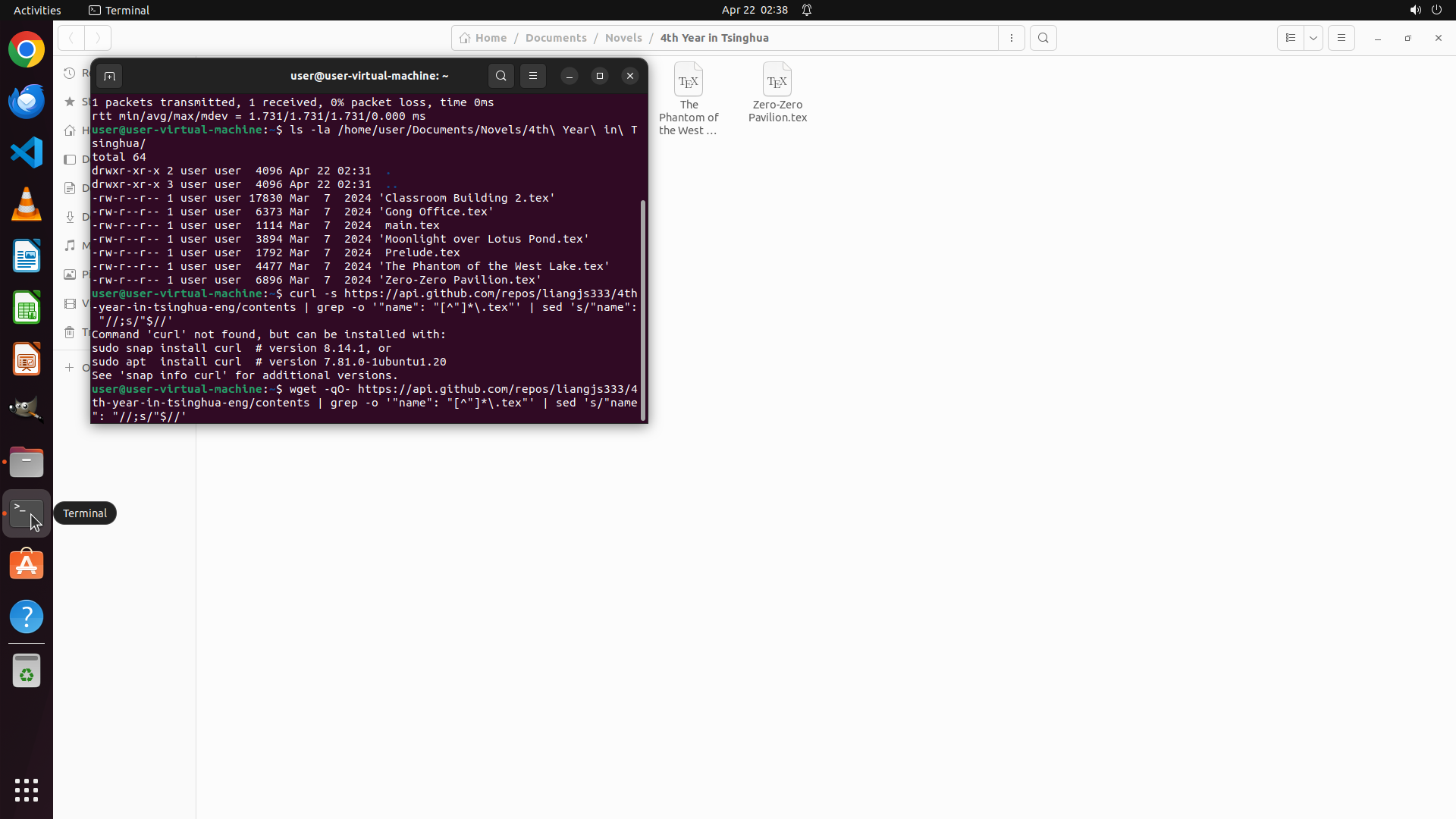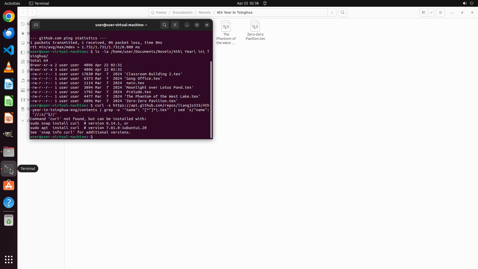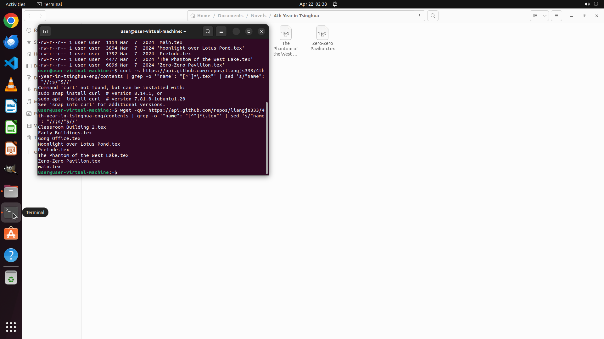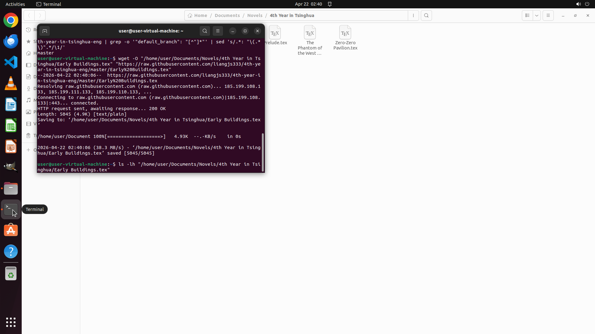 - 终端成功执行了ls命令,显示本地目录 `/home/user/Documents/Novels/4th Year in Tsinghua/` 中已有8个.tex文件: