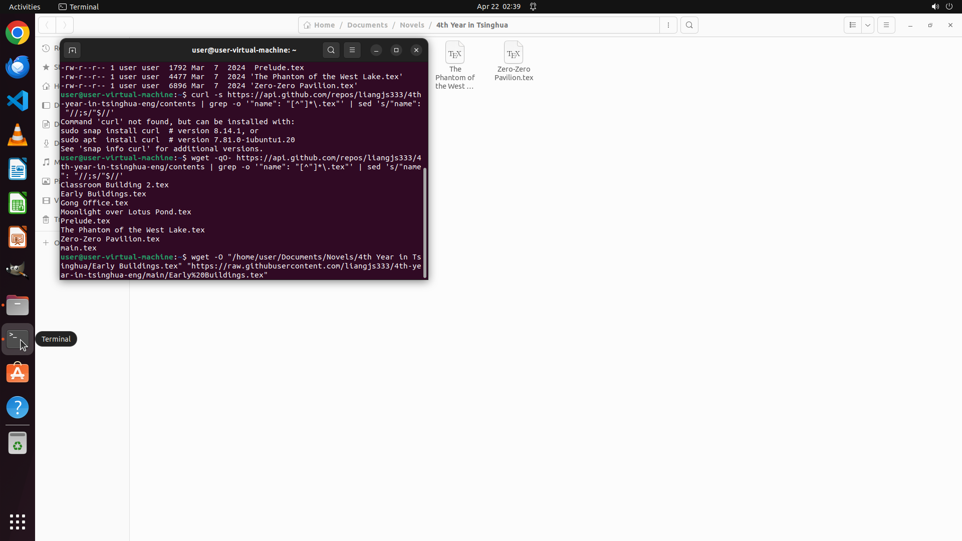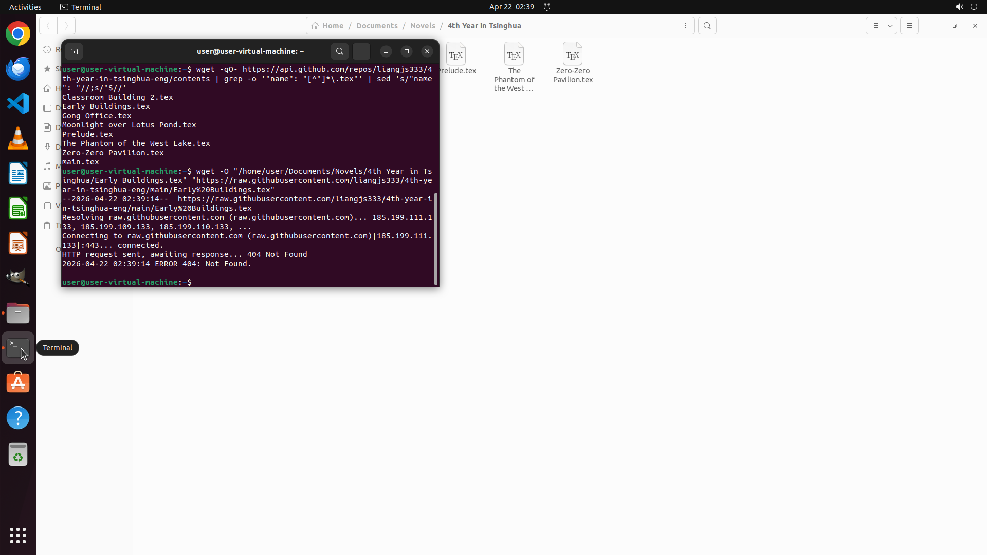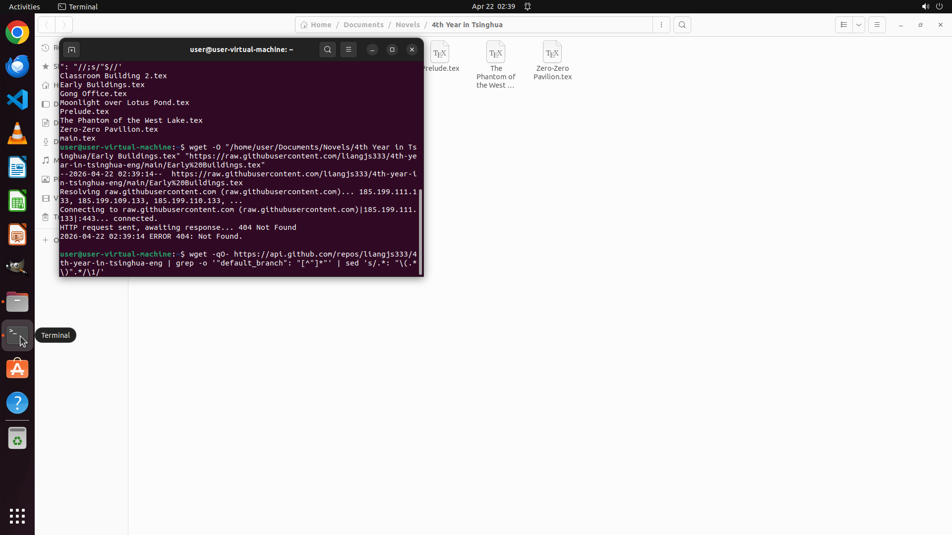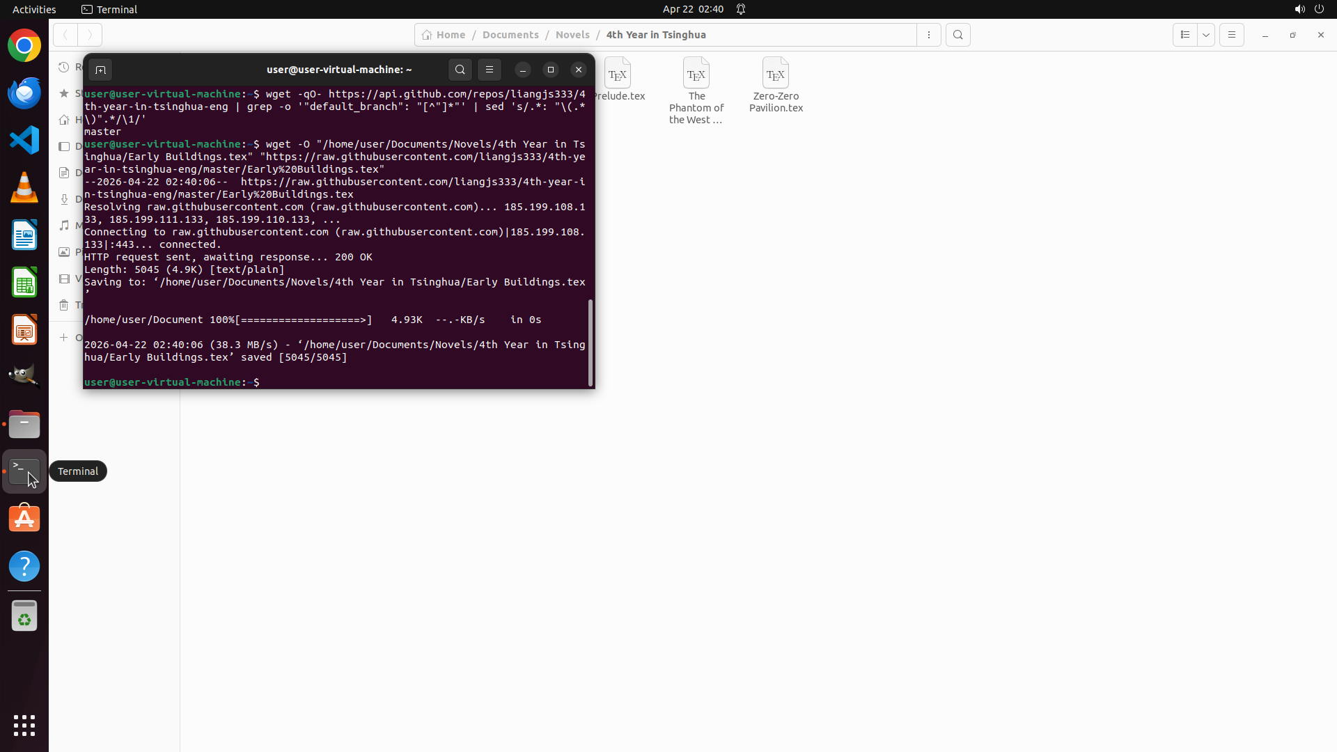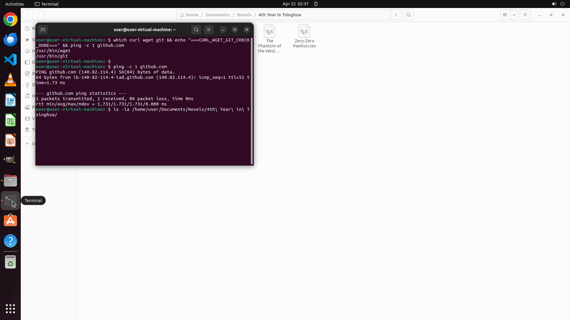 - 终端成功执行了ls命令,显示本地目录 `/home/user/Documents/Novels/4th Year in Tsinghua/` 中已有8个.tex文件: