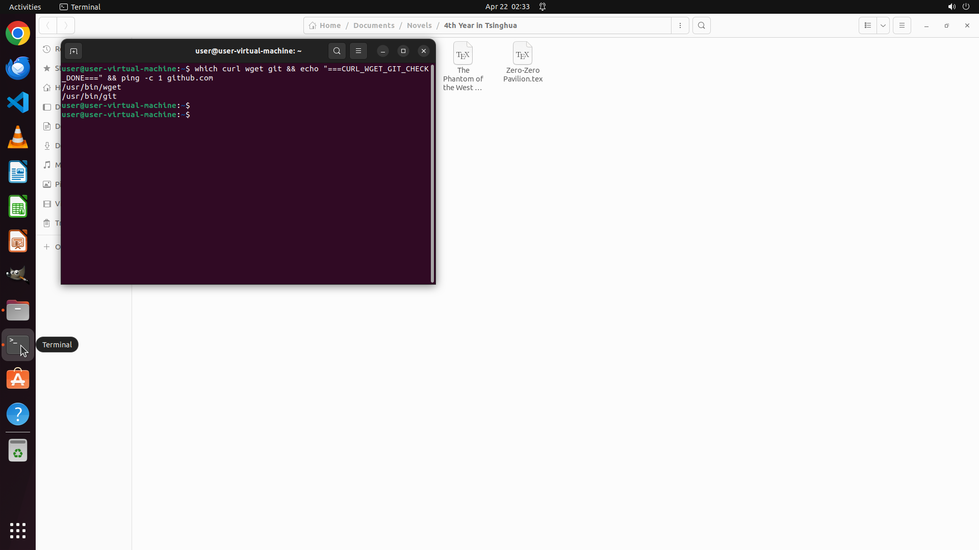 终端已成功打开,显示在文件管理器上方。终端窗口显示命令提示符 `user@user-virtual-machine: $`,等待输入命令。现在可以执行命令来检查curl/wget、git的安装状态以及网络连接情况。