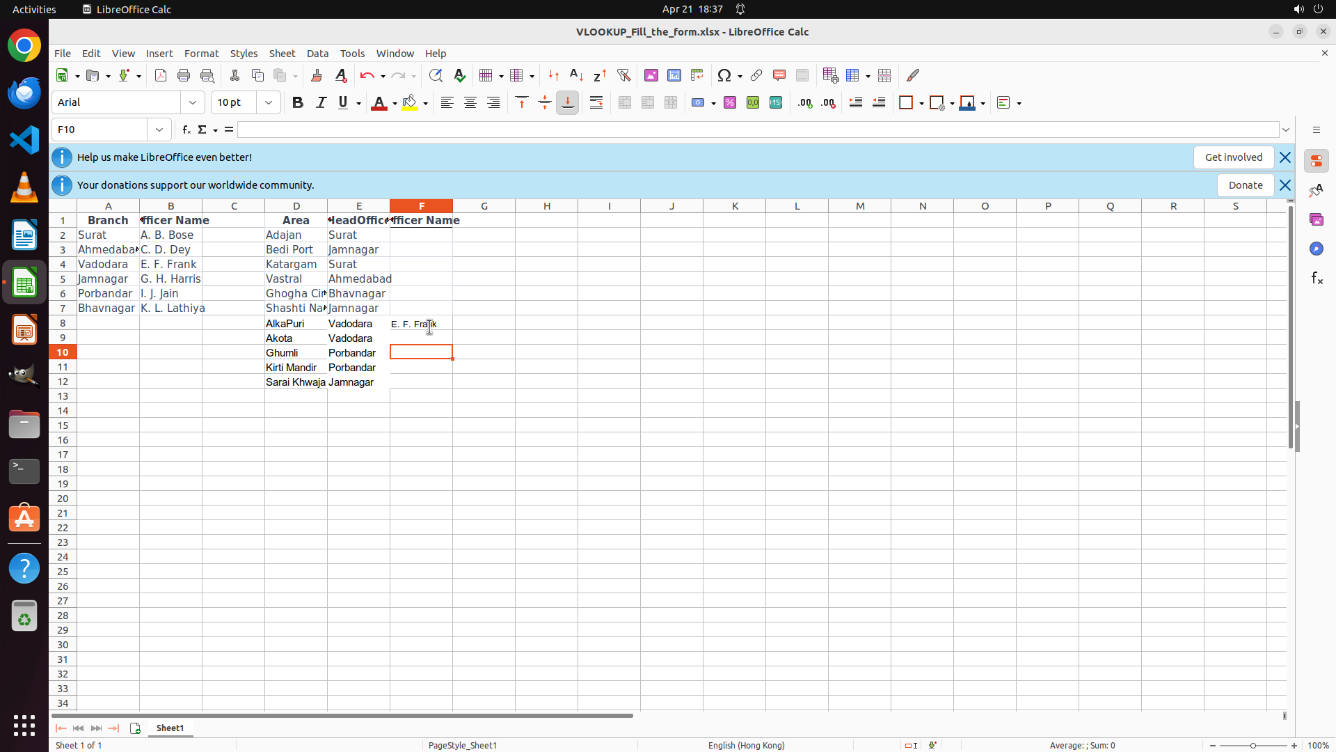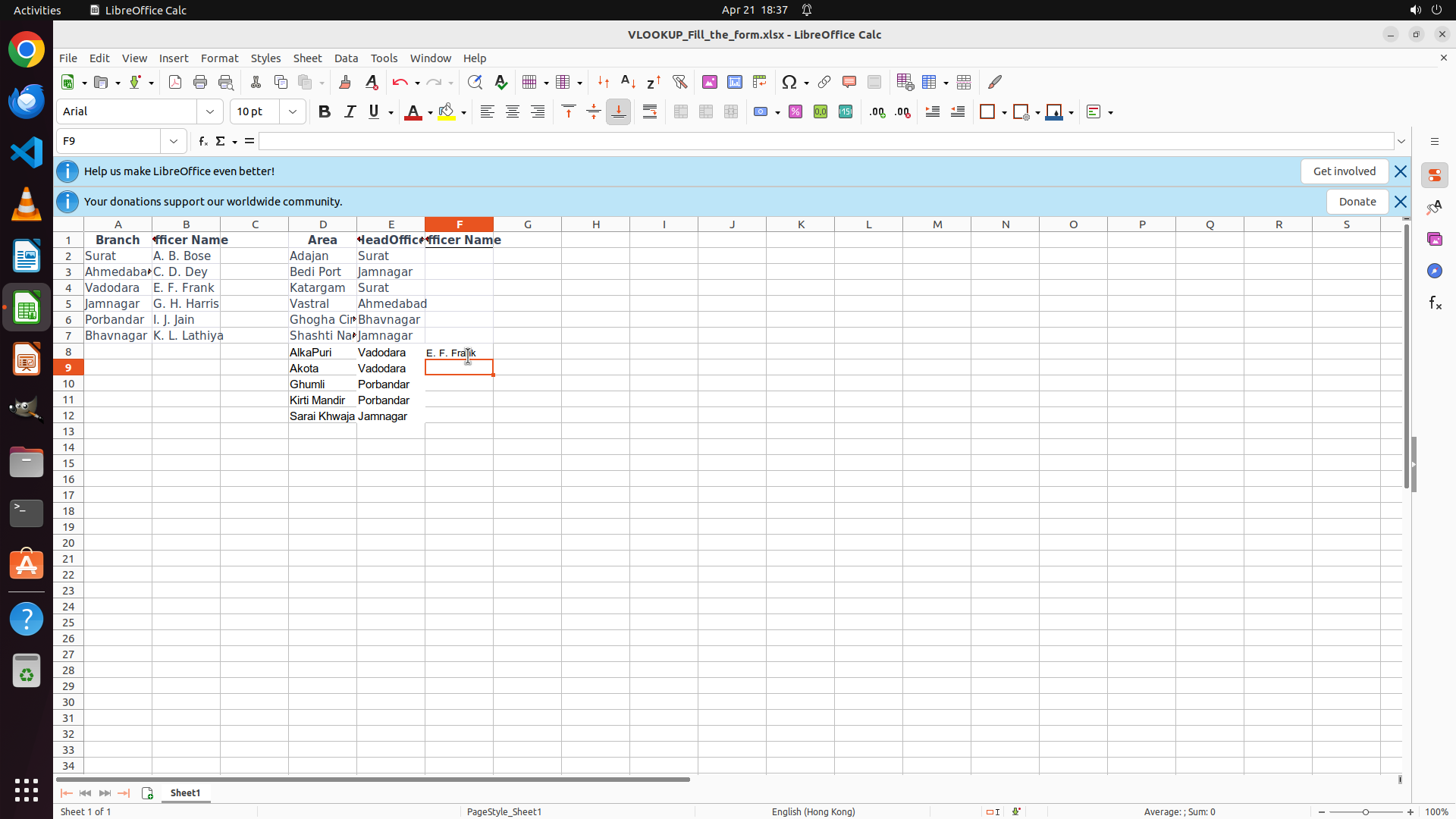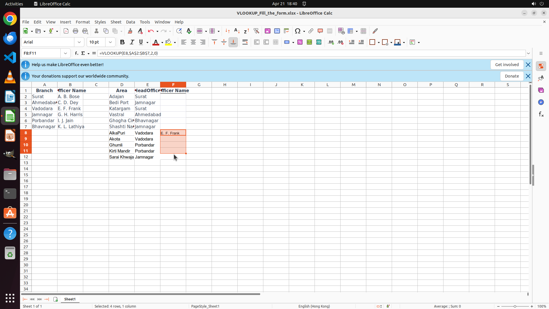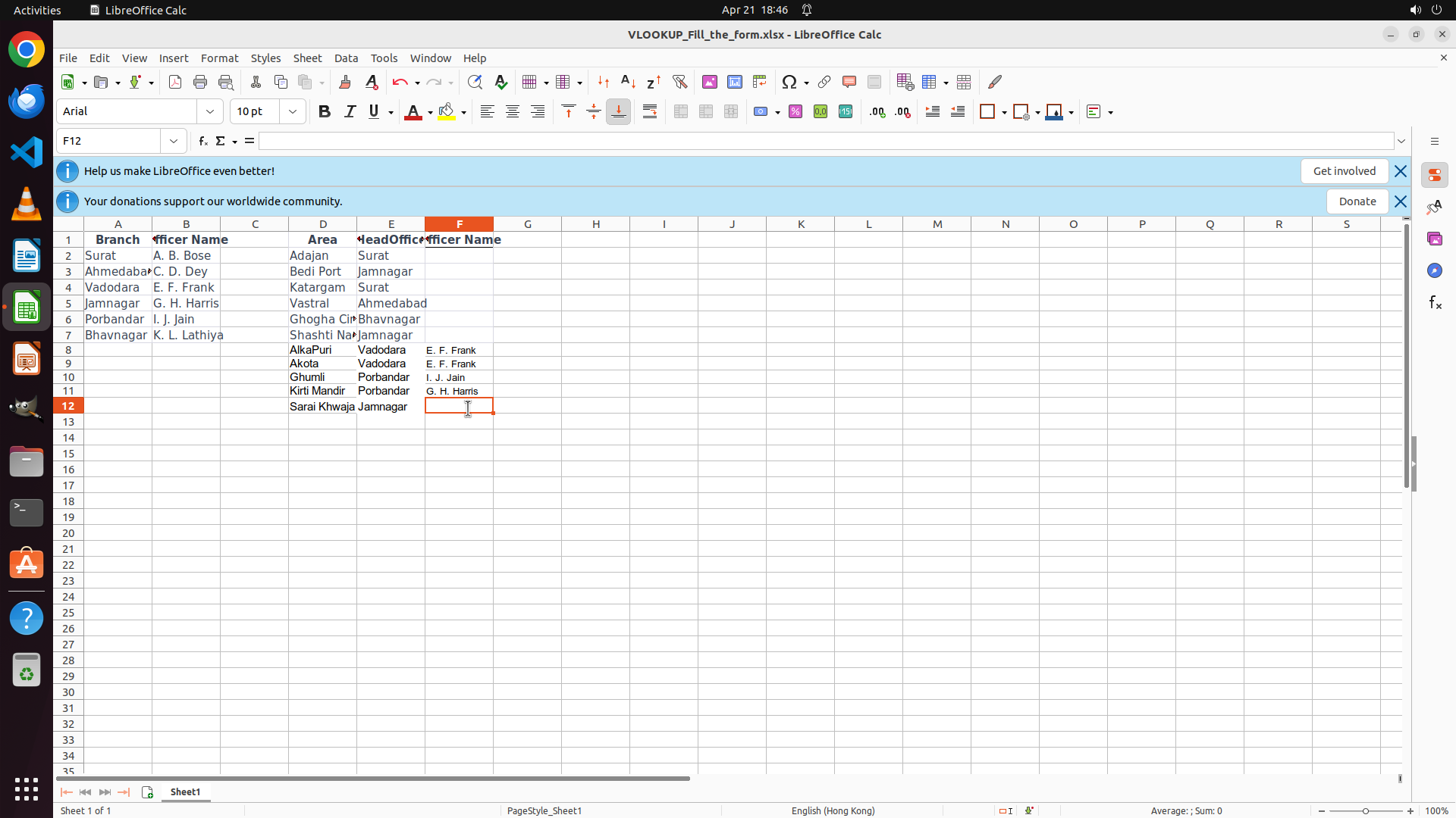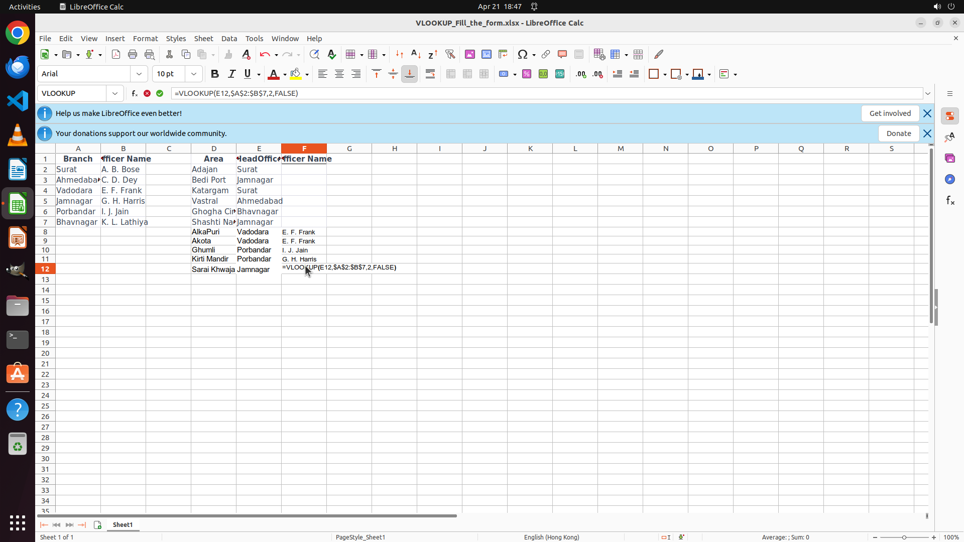 上一步成功在 F12 输入了 VLOOKUP 公式并按 Enter,F12 现在正确显示 "G. H. Harris"。所有 Officer Name 列 (F8:F12) 都已根据 HeadOffice 名称 (E8:E12) 使用 VLOOKUP 公式正确填充。